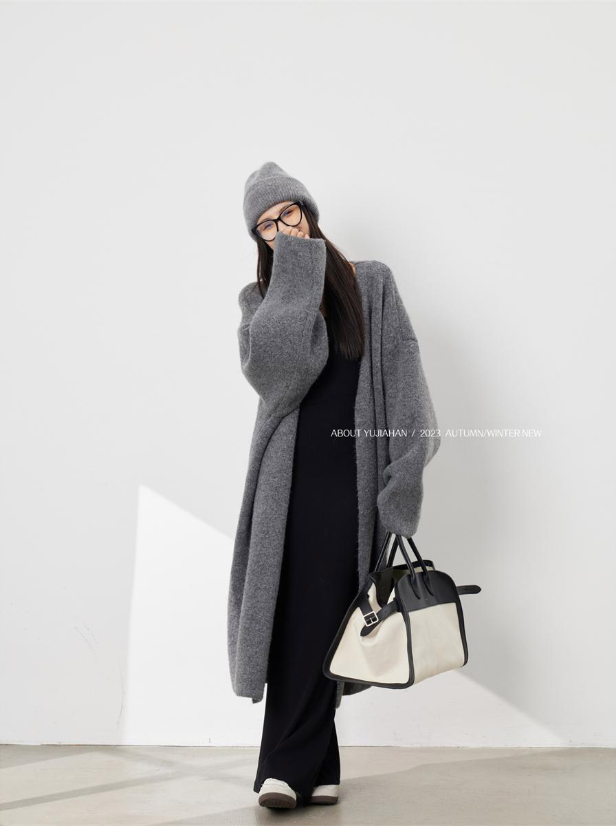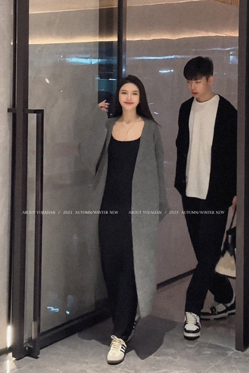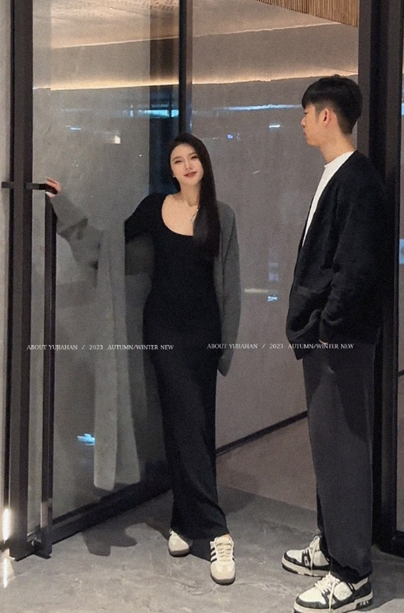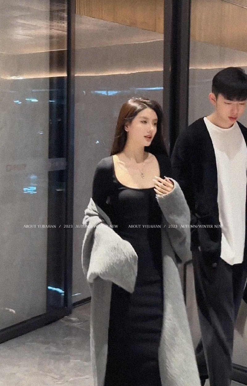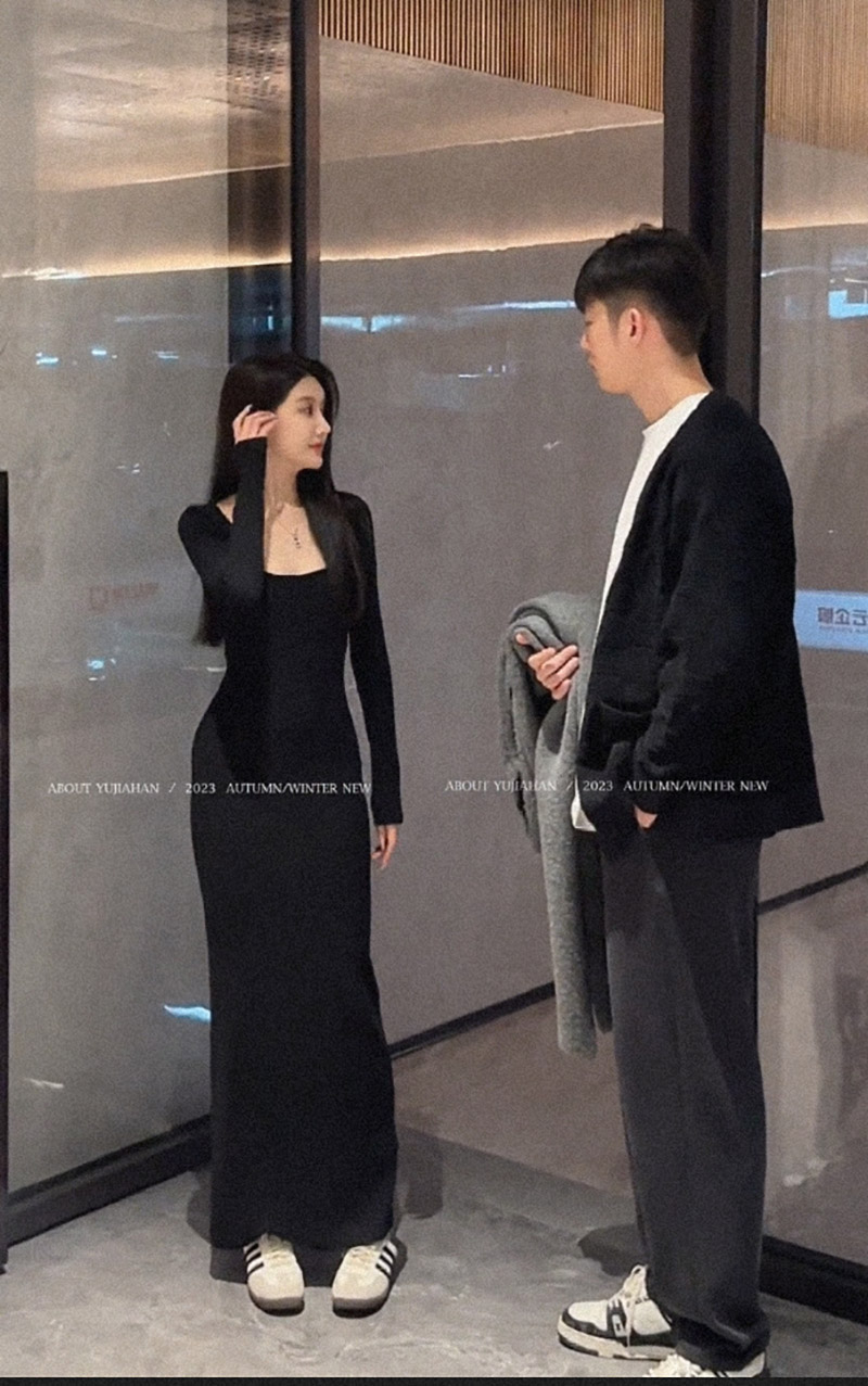 【棉磨毛高品質】黑色法式方領長袖修身打底連衣裙高級感長裙子