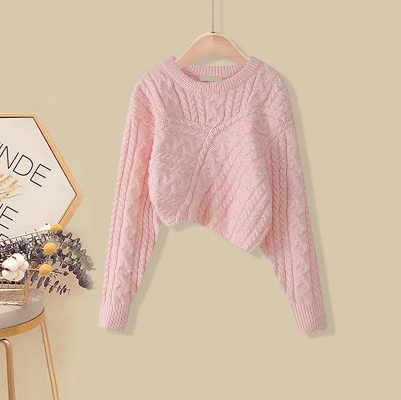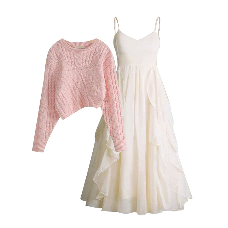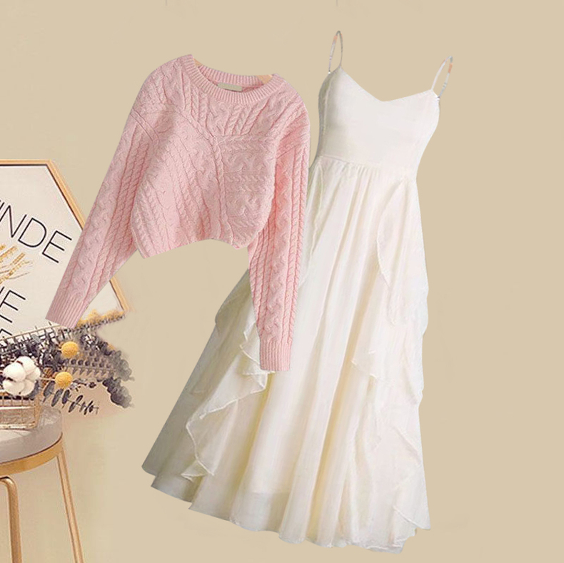 春秋奶乖炸街粉色毛衣裙子套裝裙氣質連衣裙女高級感吊帶裙兩件套
