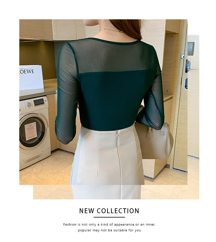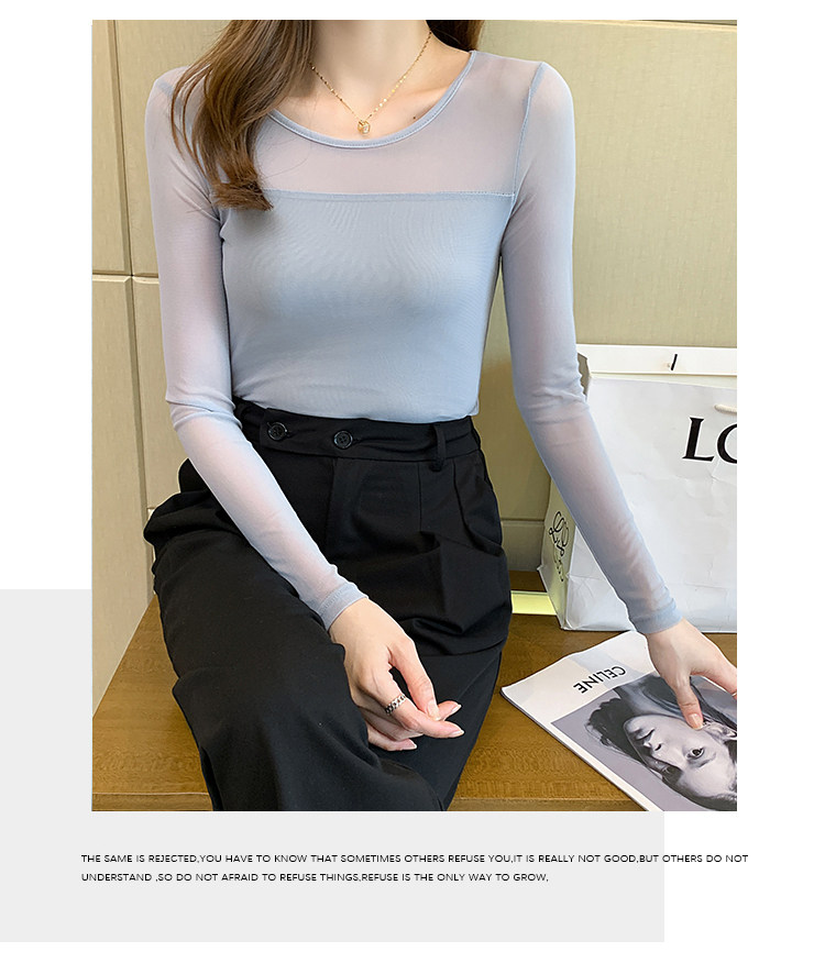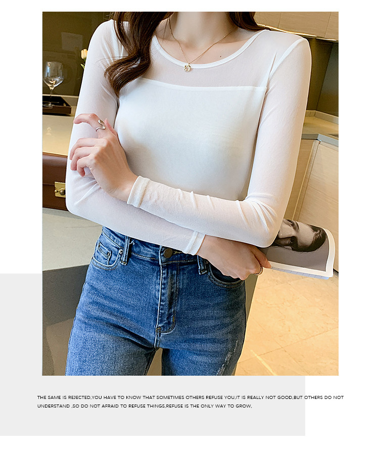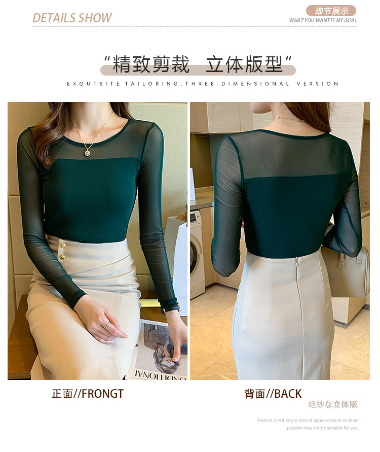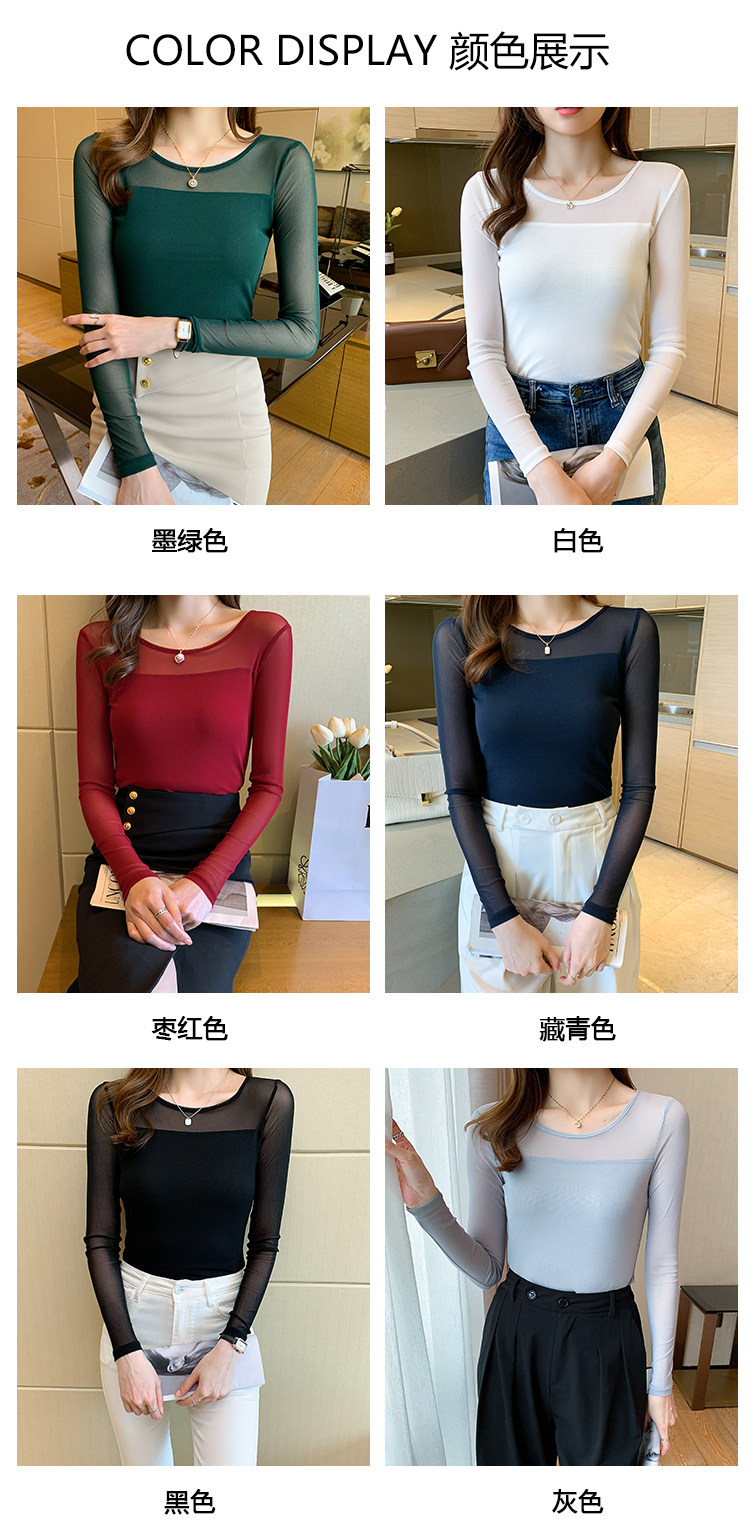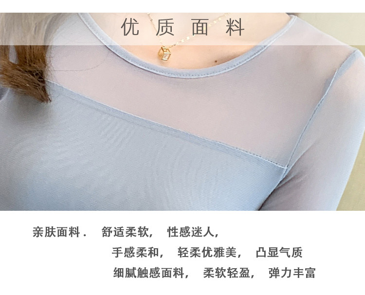 2025春秋新款蕾絲衫百搭純色長袖彈性上衣大碼女裝透氣網紗打底衫