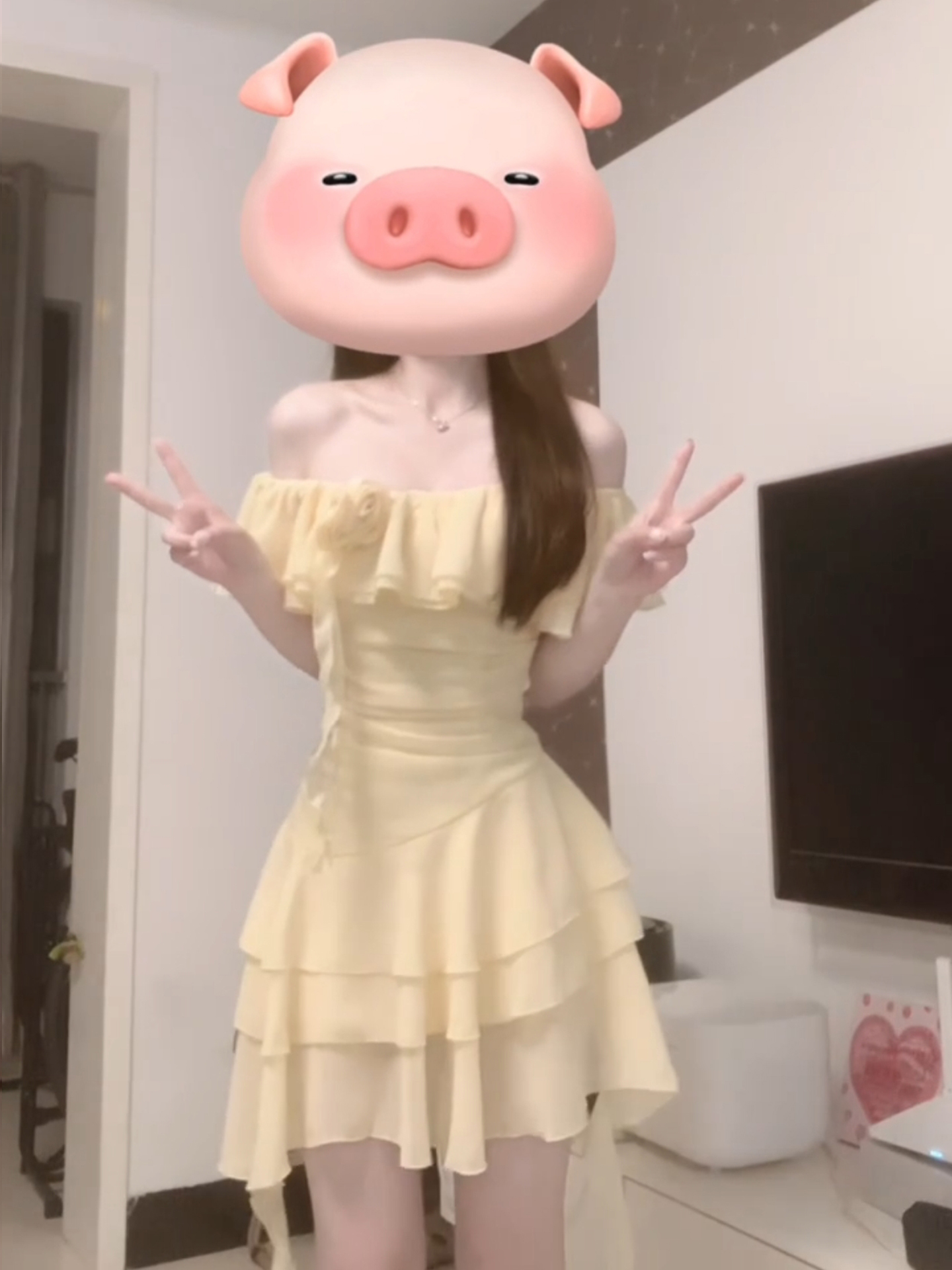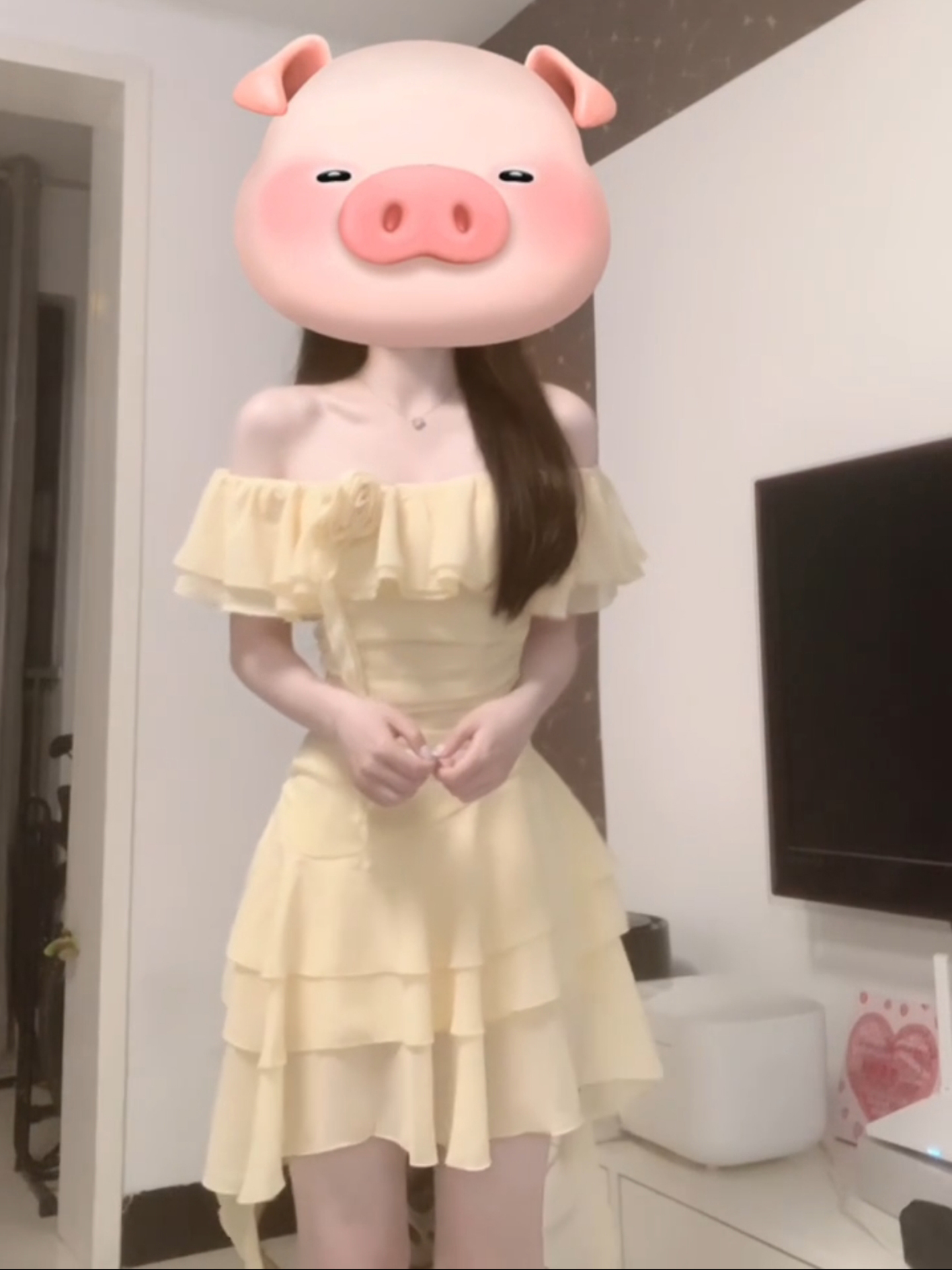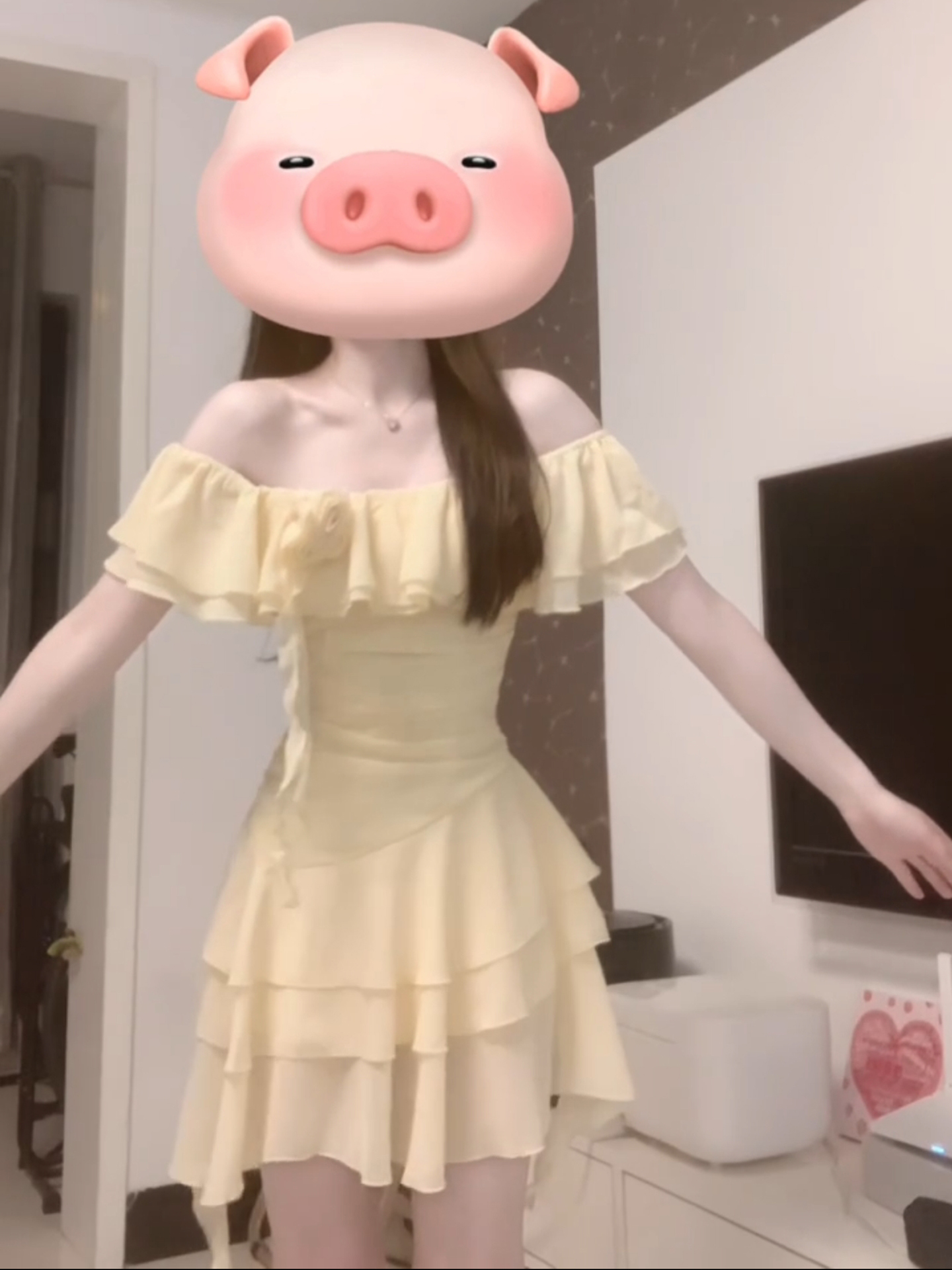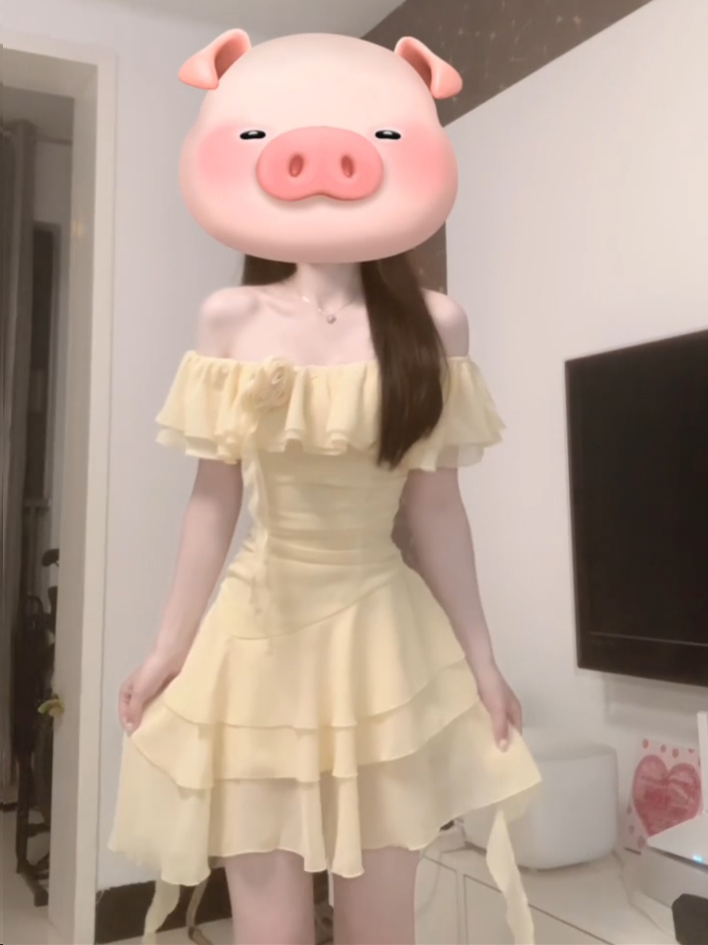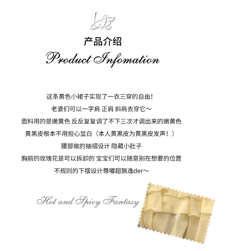 純欲風辣妹高級感一字肩連衣裙女夏黃色立體花朵不規則小個子短裙