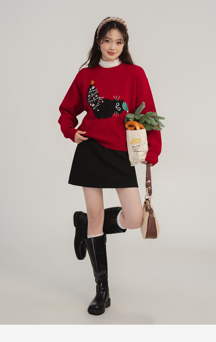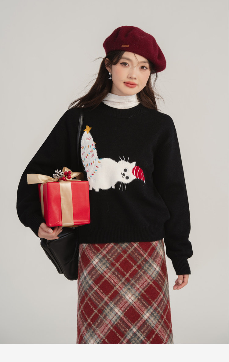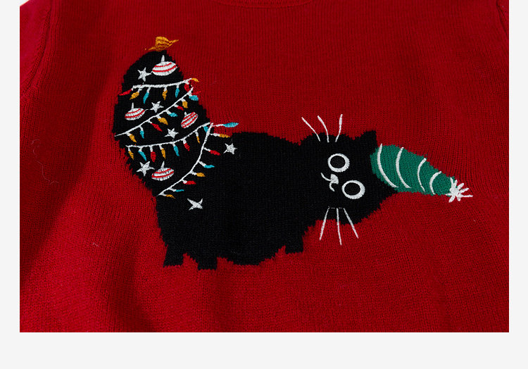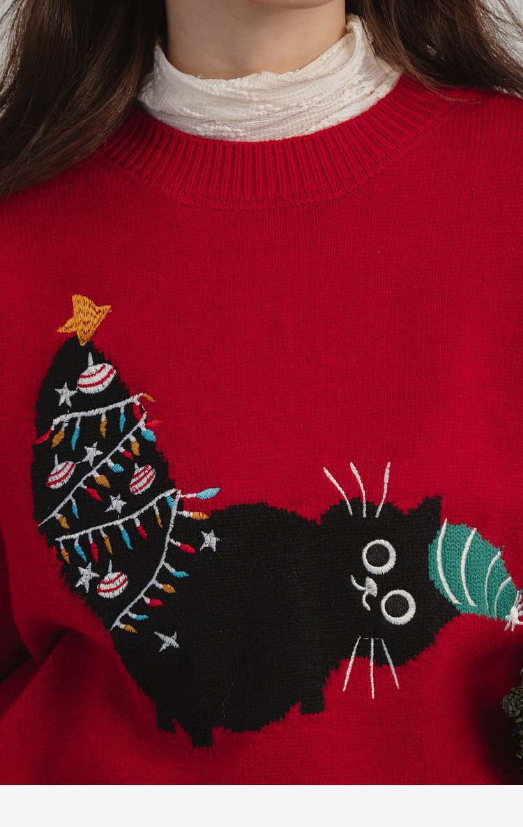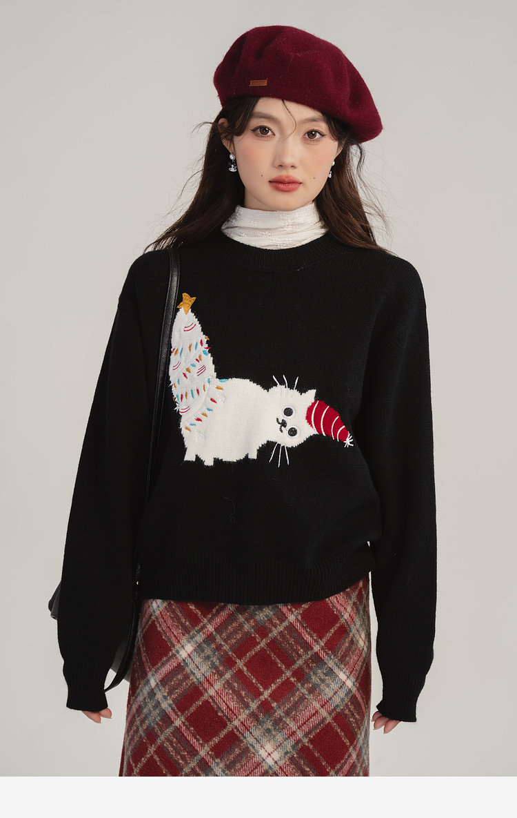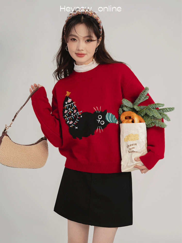 LOVEHEYNEW新年提花大尾貓套頭毛衣女冬季設計感童趣針織上衣女