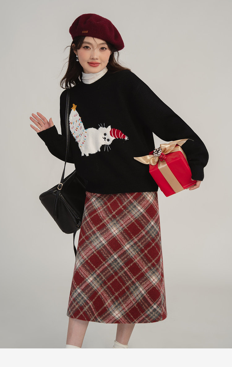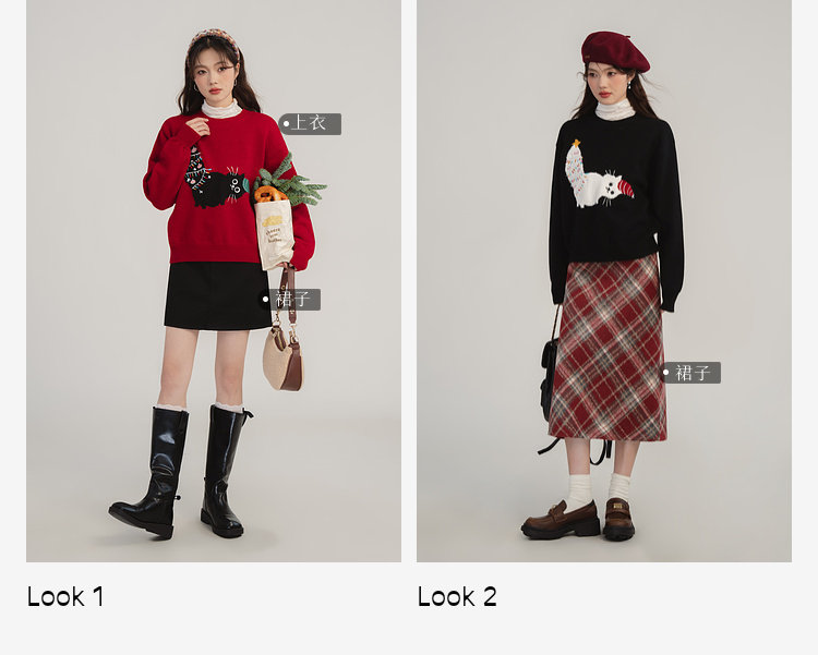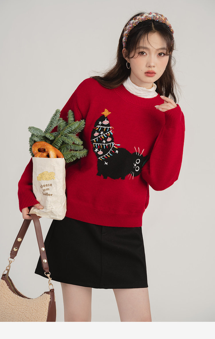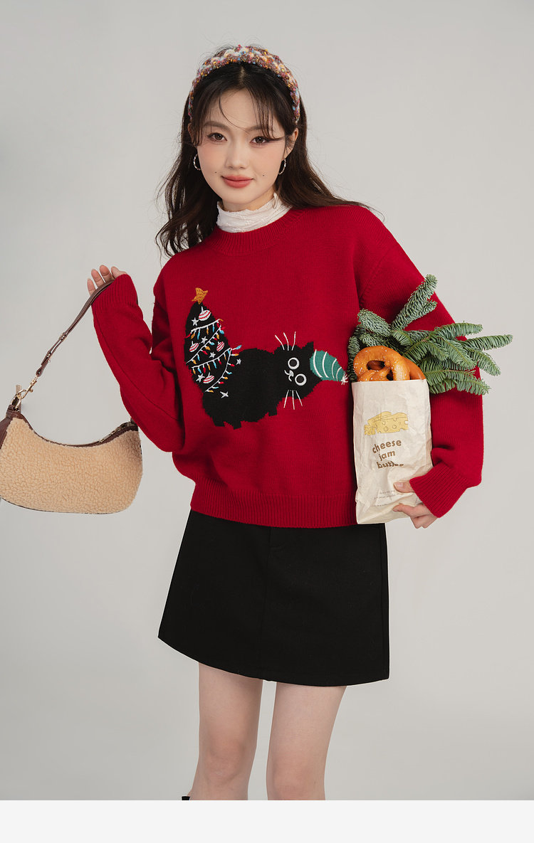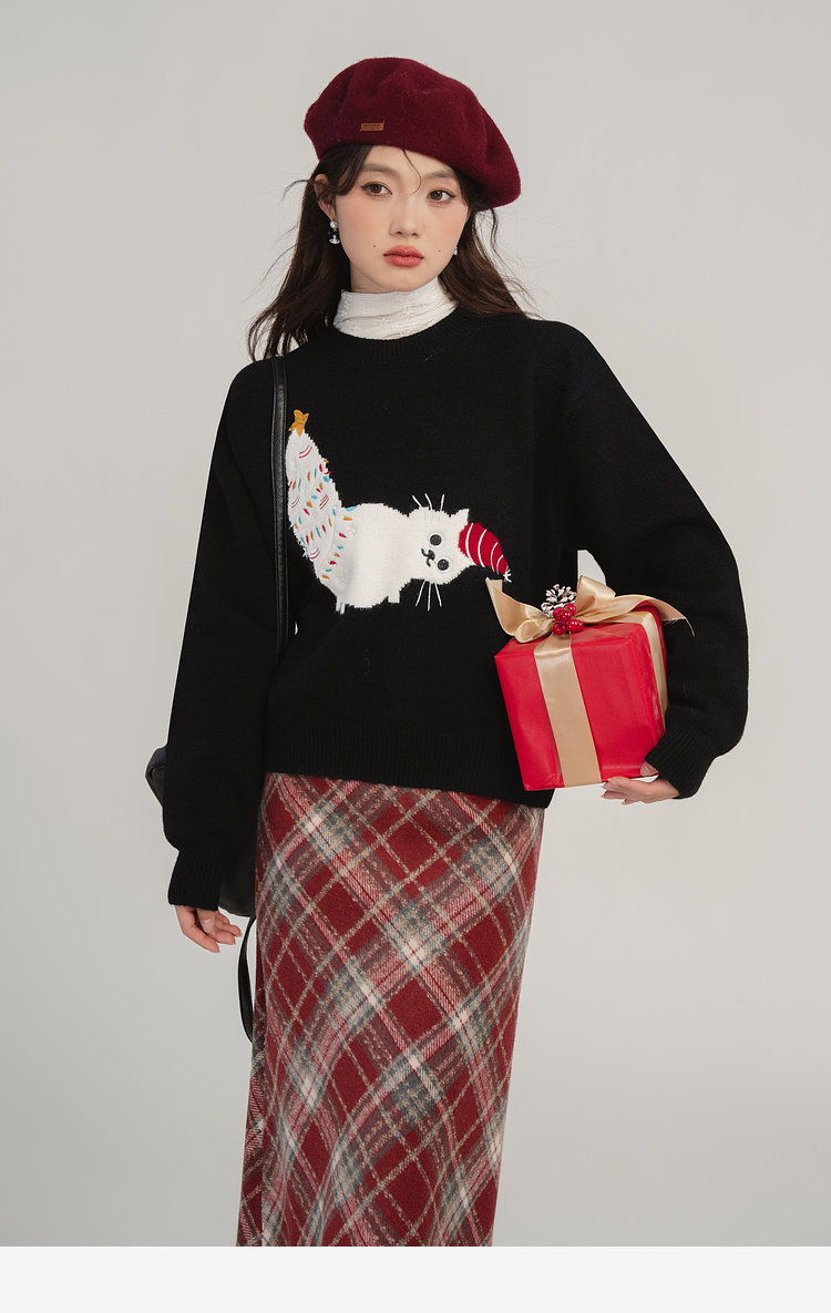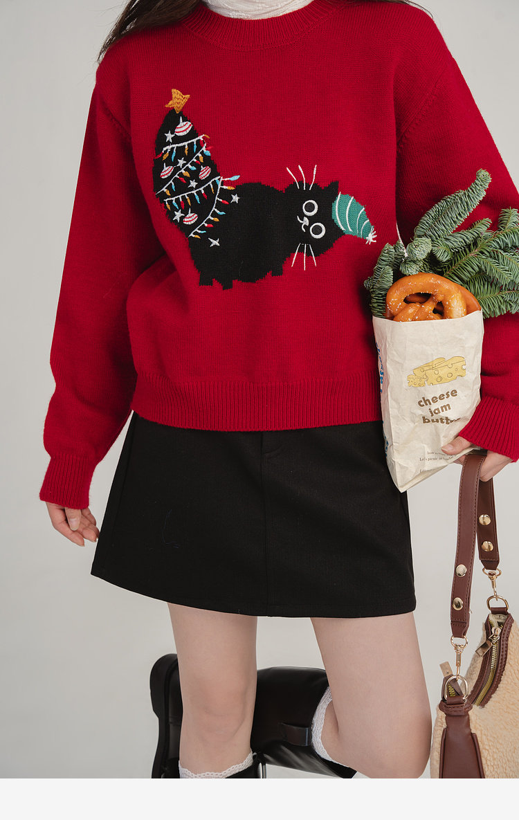 LOVEHEYNEW新年提花大尾貓套頭毛衣女冬季設計感童趣針織上衣女