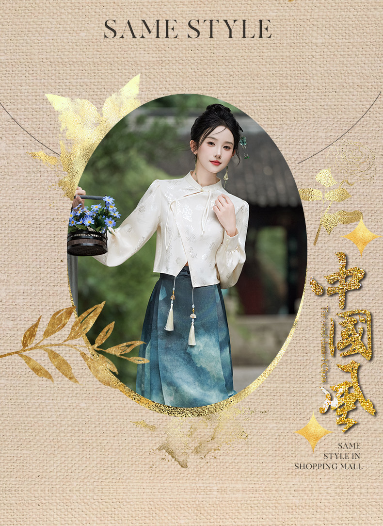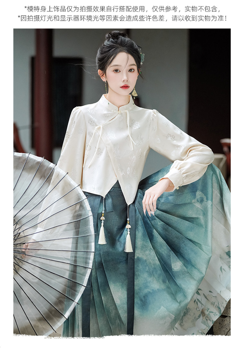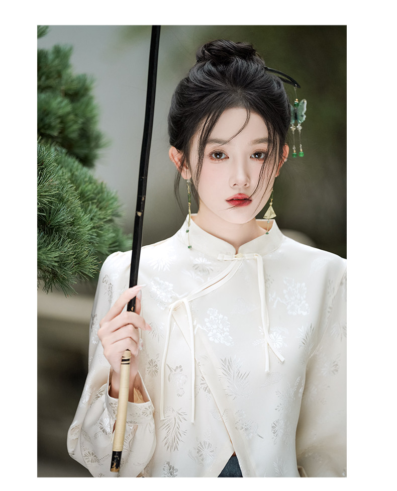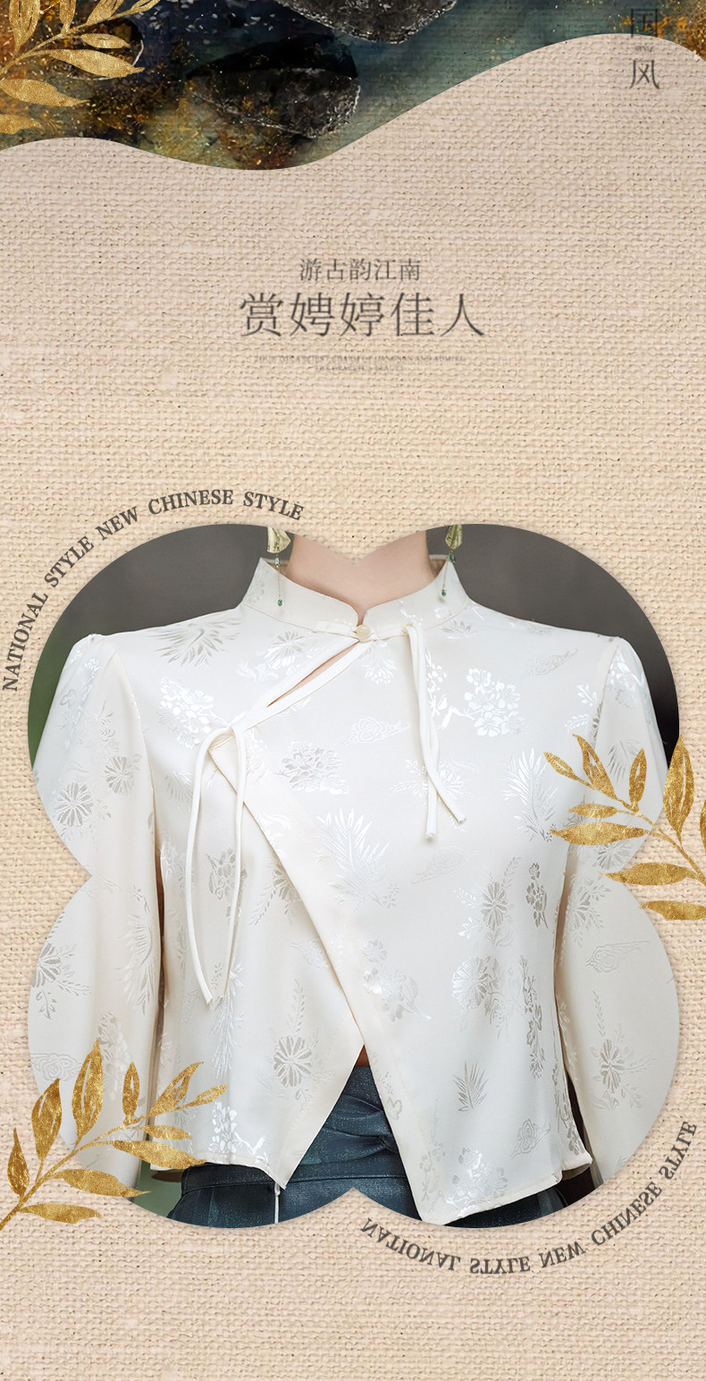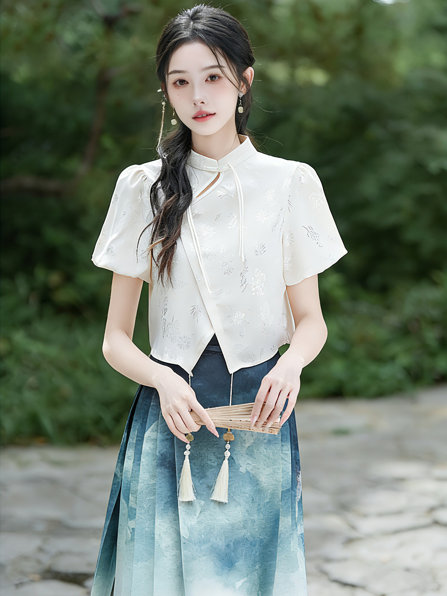 配搭馬面裙的上衣女夏季新款不規則設計感盤釦提花襯衫新中式國風