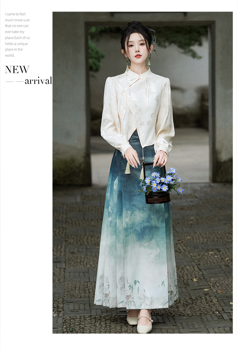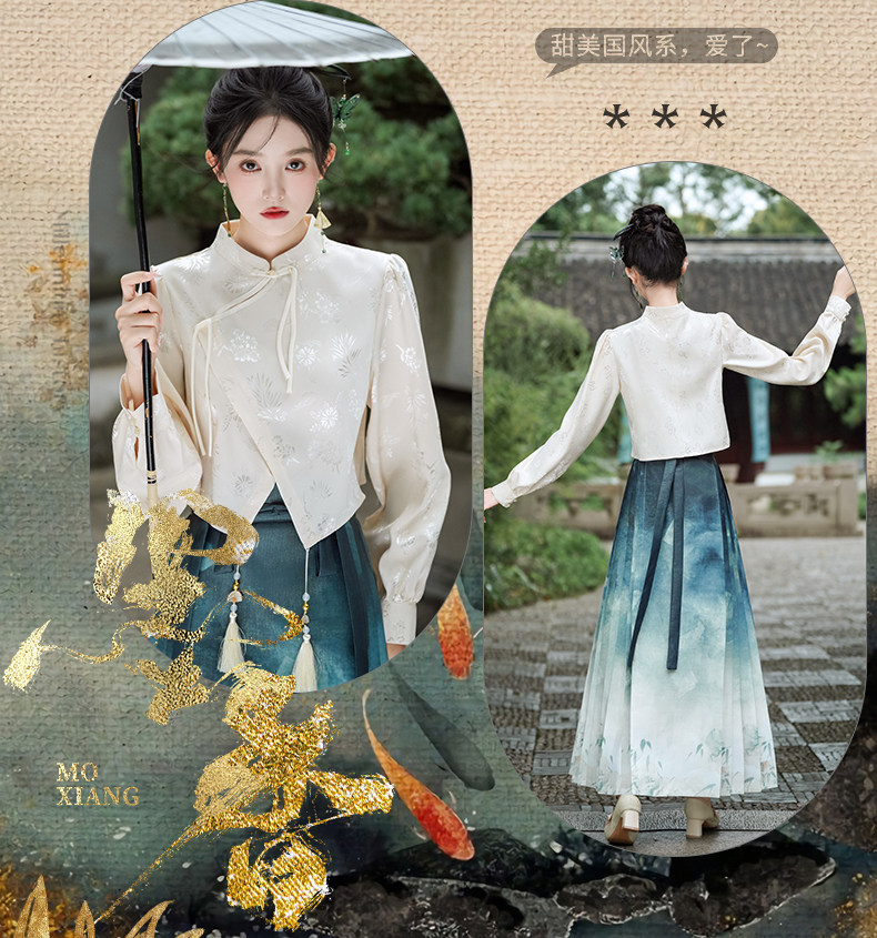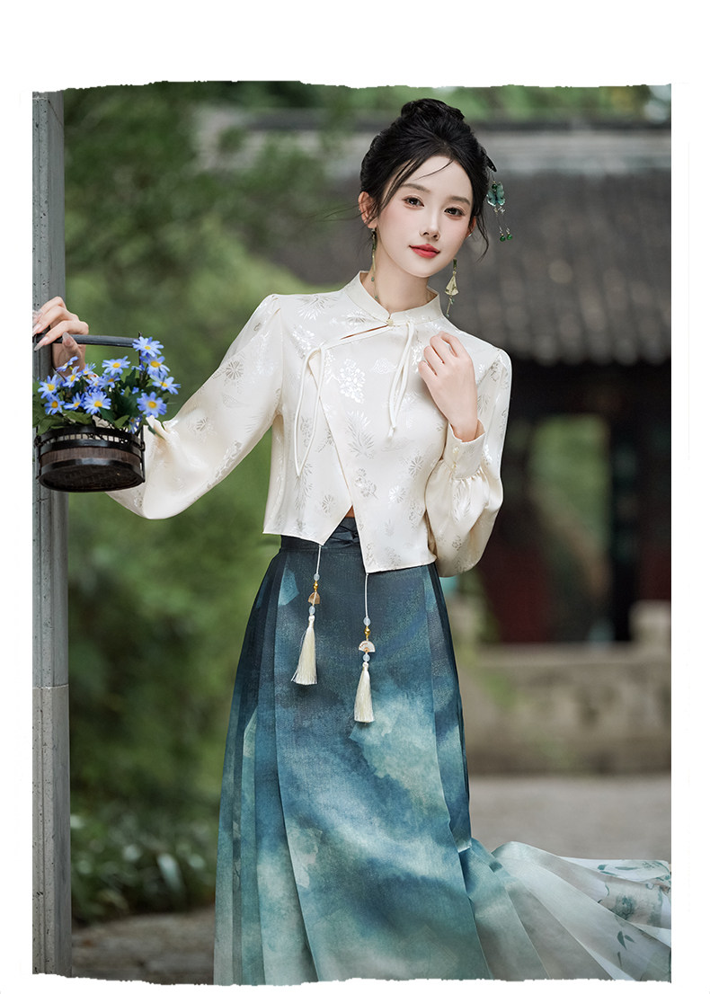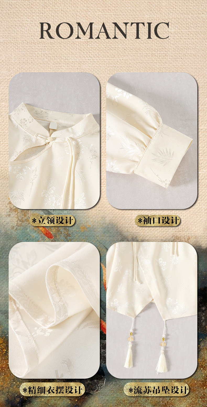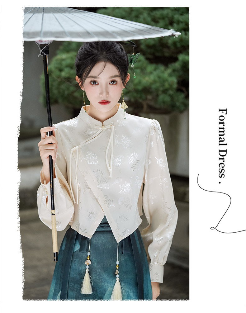 配搭馬面裙的上衣女夏季新款不規則設計感盤釦提花襯衫新中式國風
