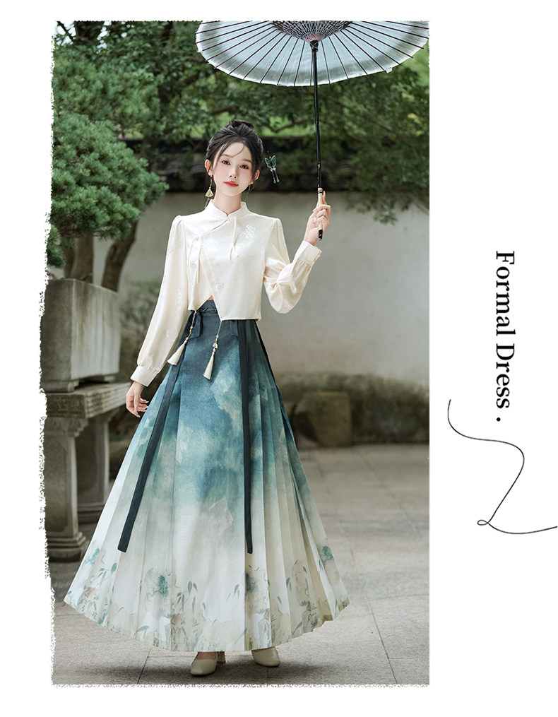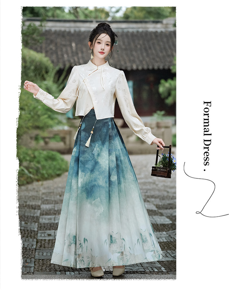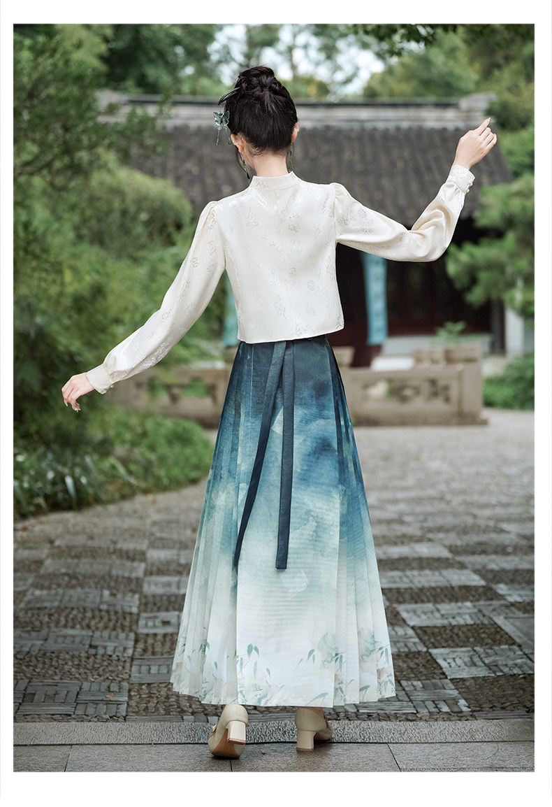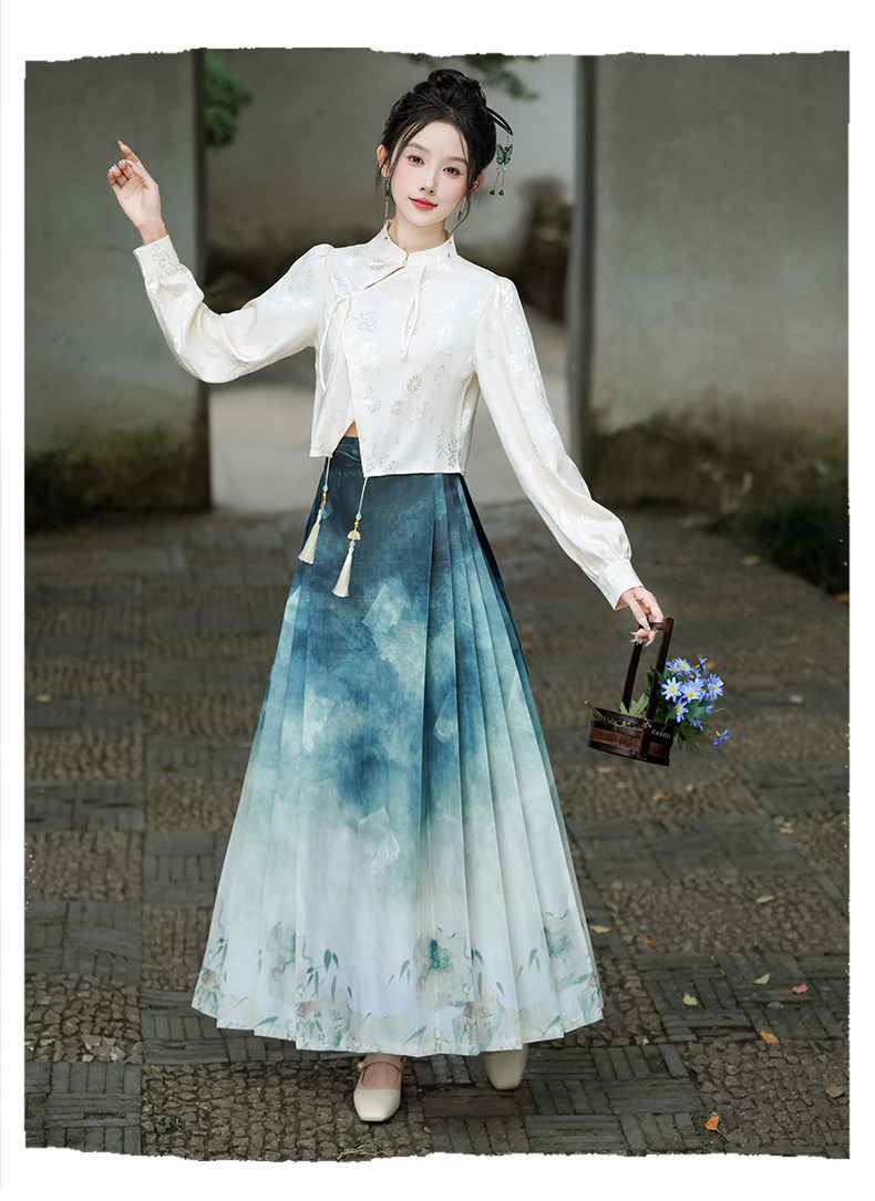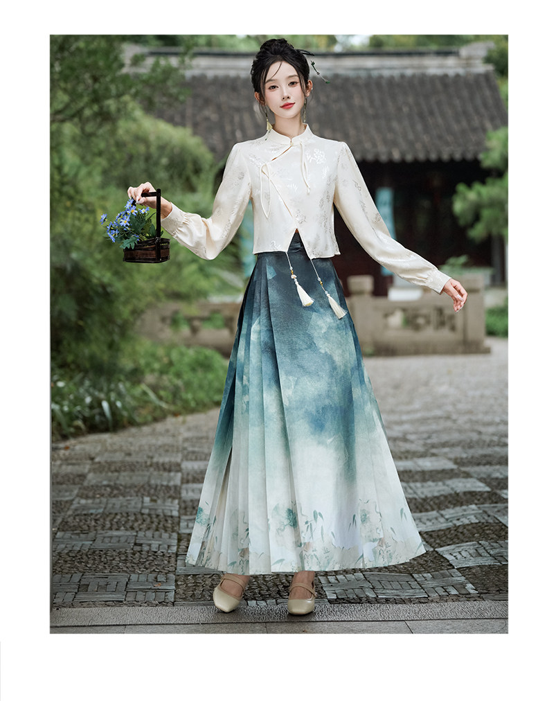 配搭馬面裙的上衣女夏季新款不規則設計感盤釦提花襯衫新中式國風