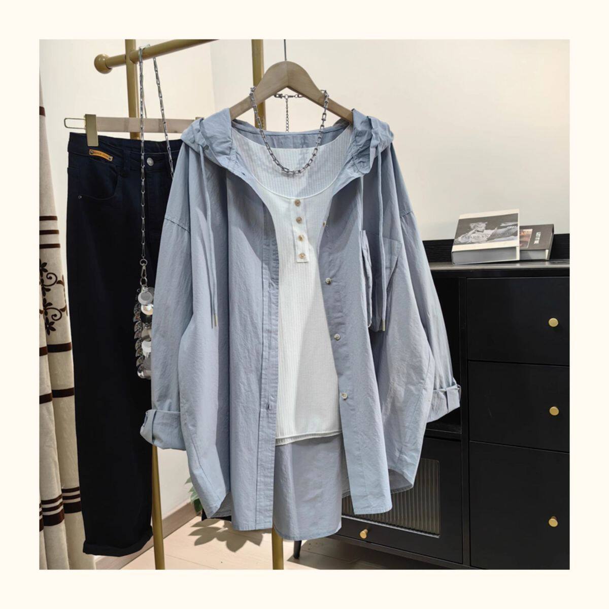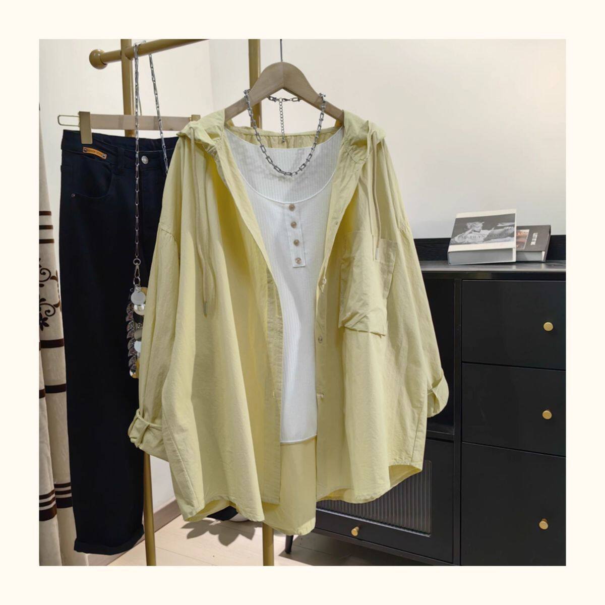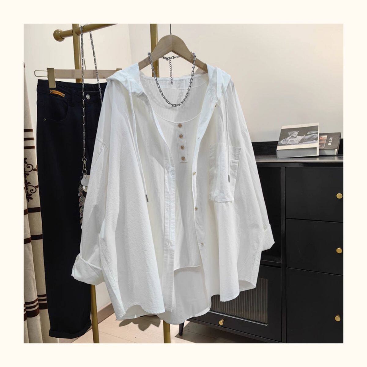超大碼300斤胖MM透氣連帽防曬襯衫女夏季慵懶風寬鬆休閒顯瘦外套