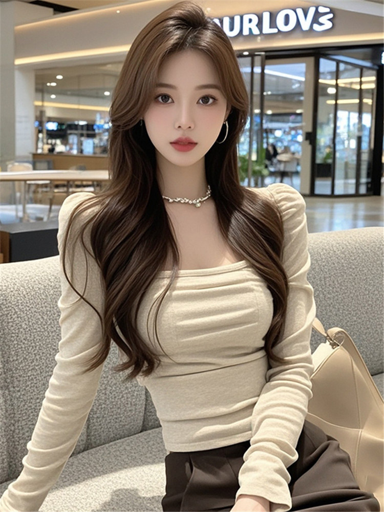 法式溫柔風杏色方領長袖上衣女2025新款小個子修身顯瘦短款上衣女