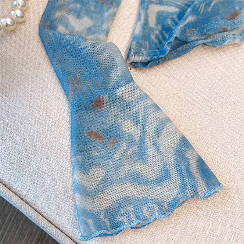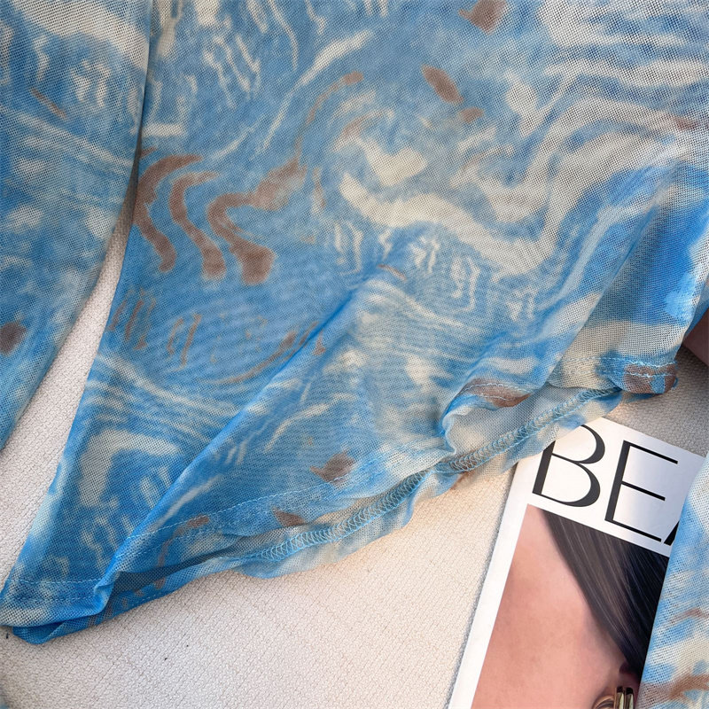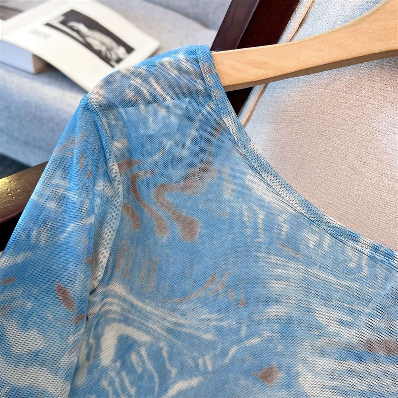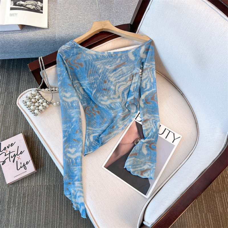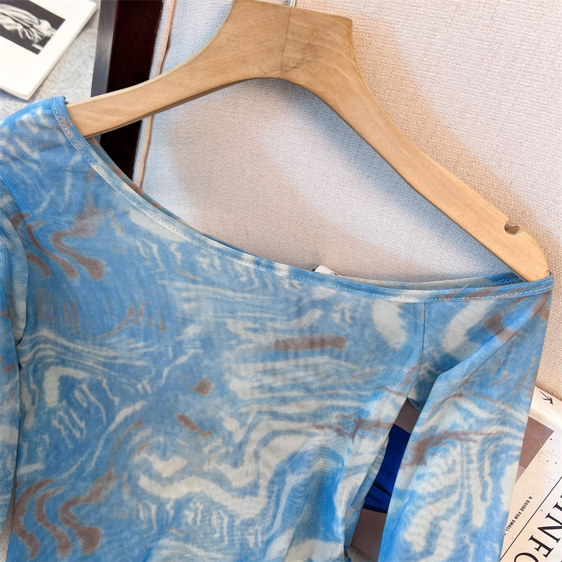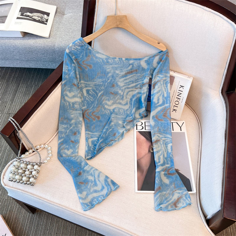 專櫃撤廻剪標美式紥染網紗斜肩長袖T恤女夏款不規則辣妹防曬罩衫