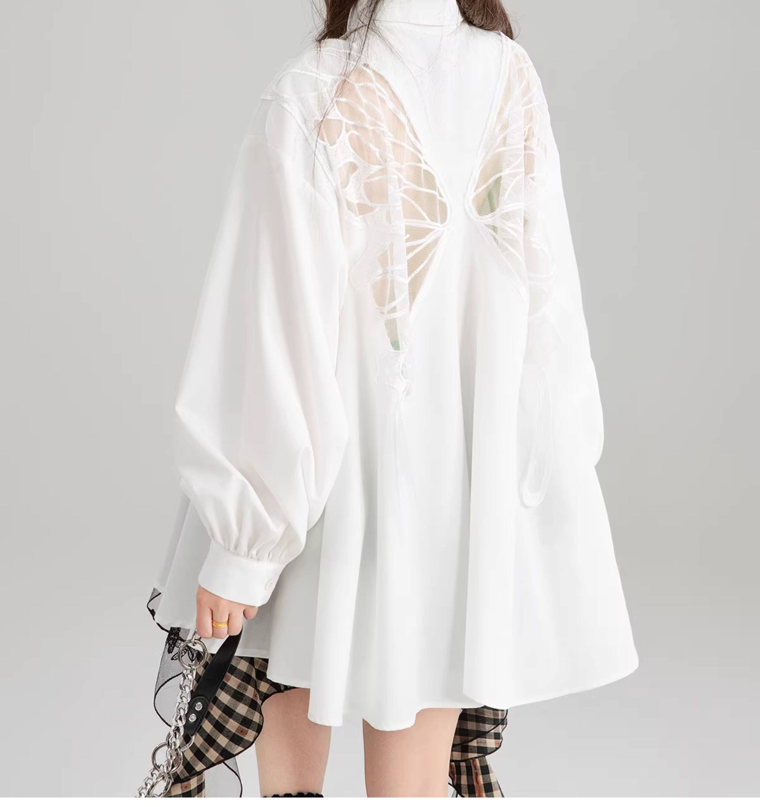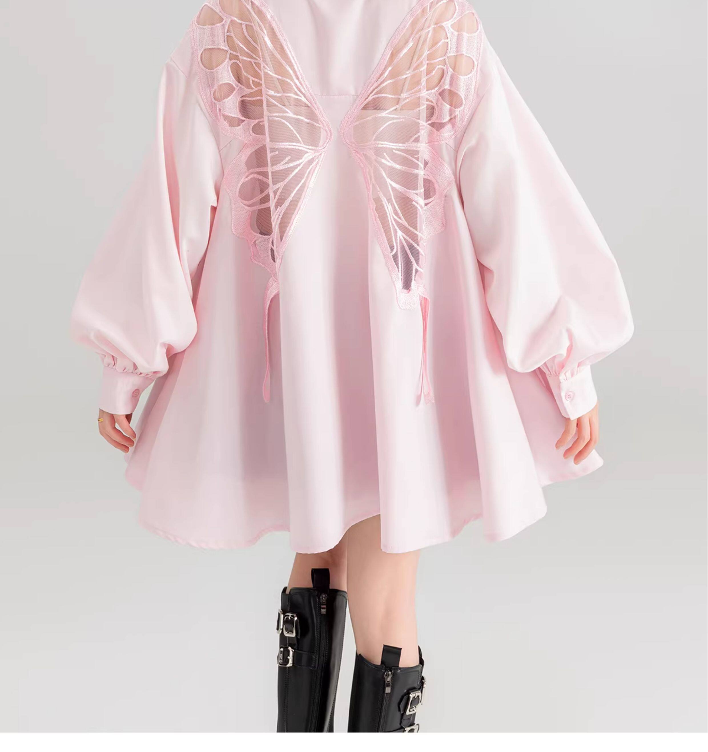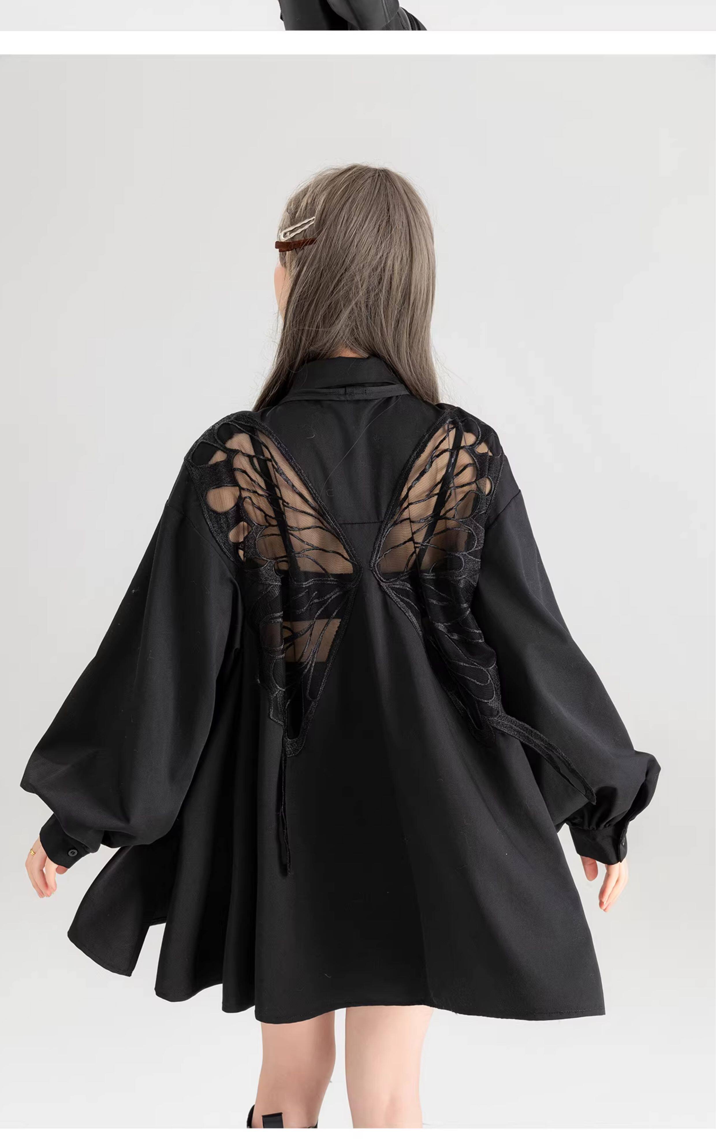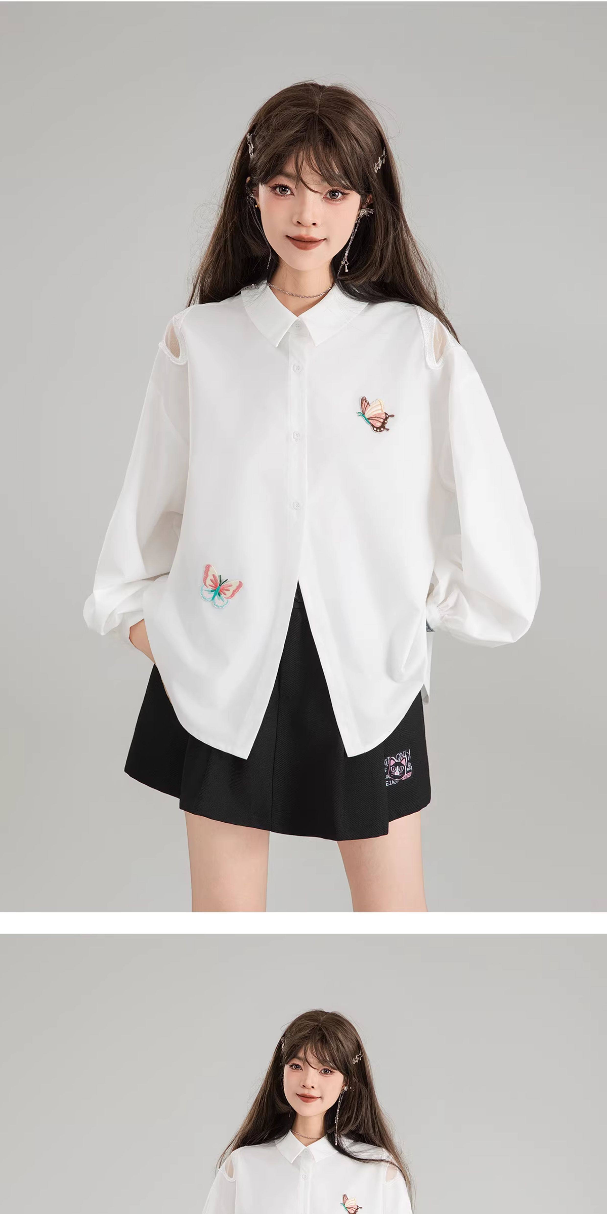 KEIKO 蝴蝶刺綉黑色短袖襯衫2026夏季高級感泡泡袖上衣寬鬆防曬衫