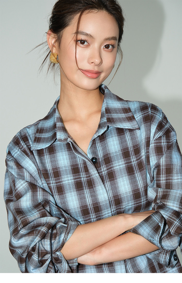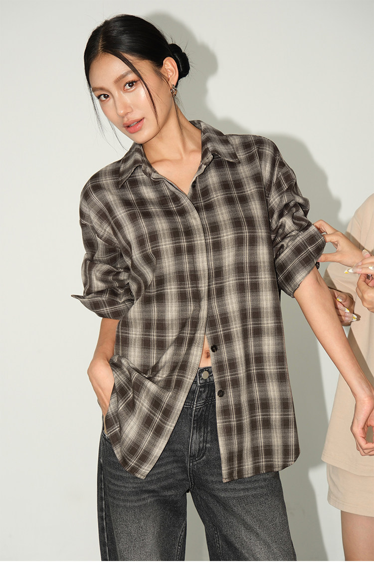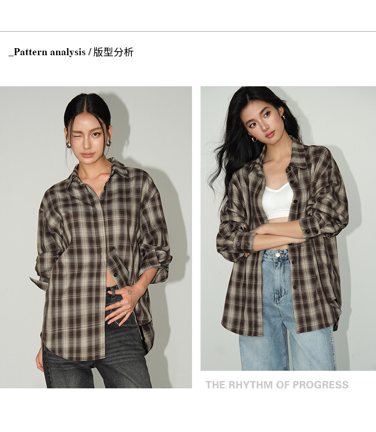 NEVA HU【7折】復古長袖格子襯衫外套女秋韓版bf襯衣外搭上衣
