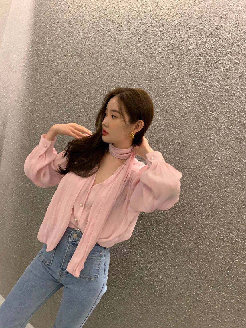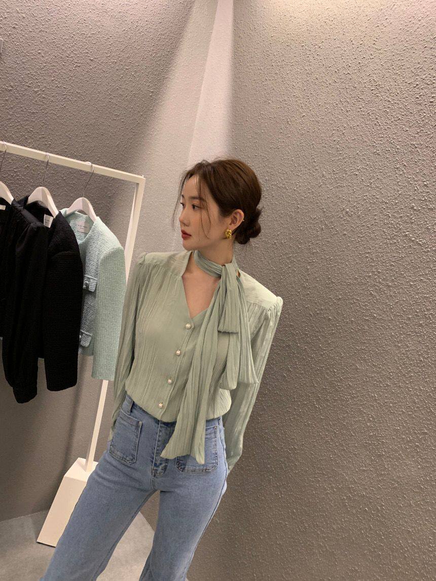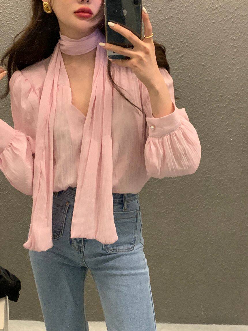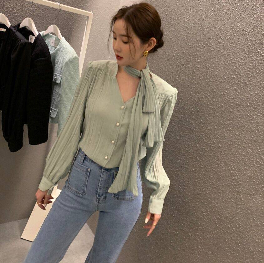 韓國chic春季法式氣質V領系脖飄帶單排釦褶皺感寬鬆長袖襯衫上衣