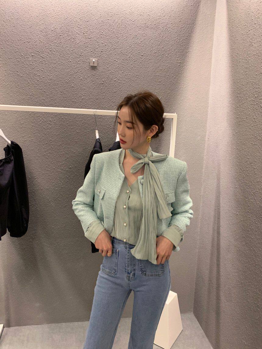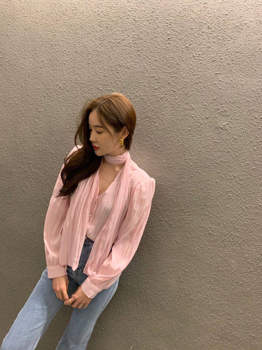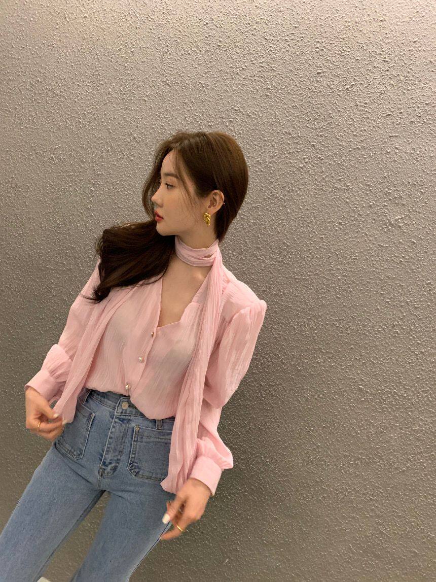韓國chic春季法式氣質V領系脖飄帶單排釦褶皺感寬鬆長袖襯衫上衣