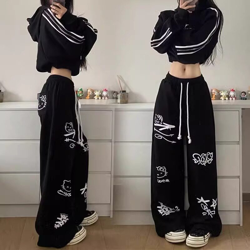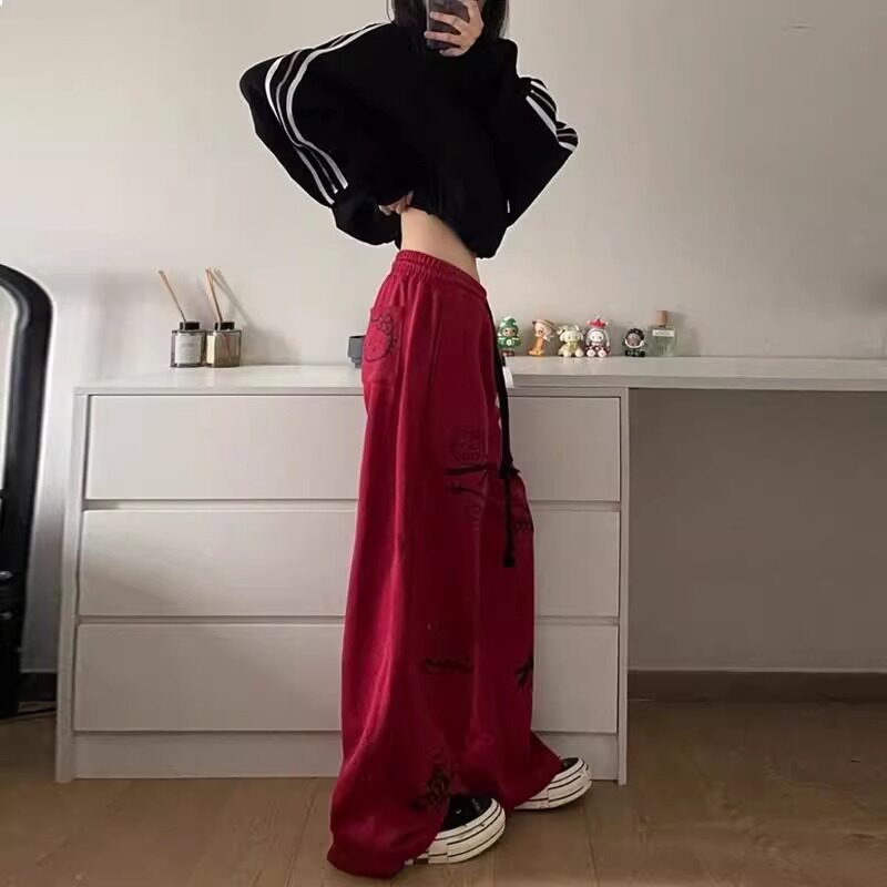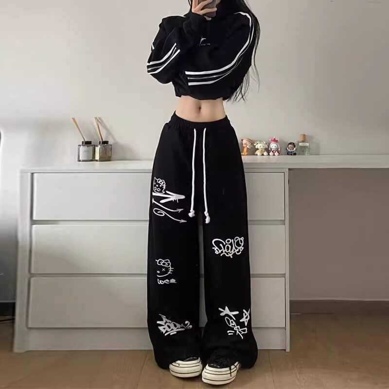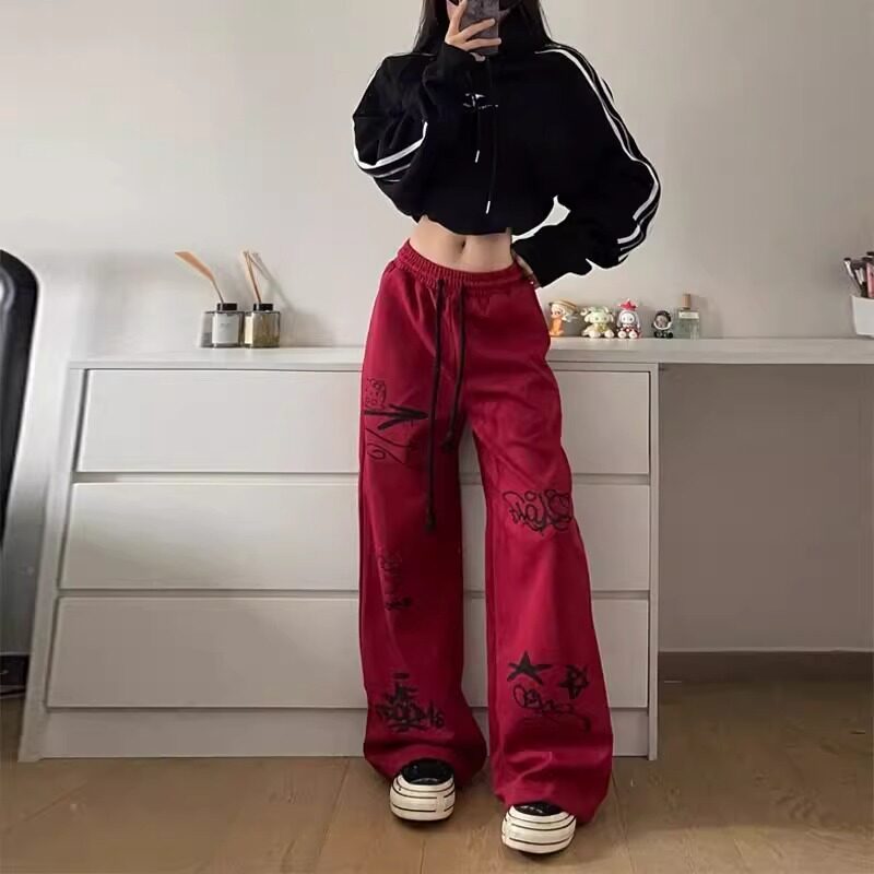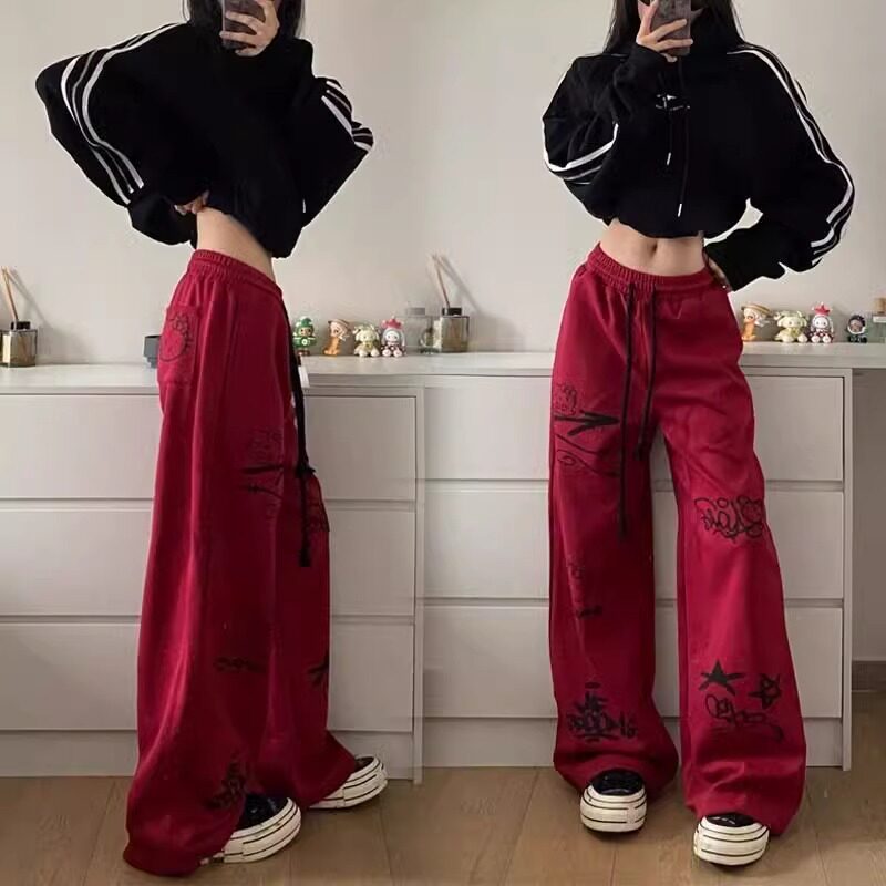 特大碼300斤美式復古街頭塗鴉運動褲女春夏季寬鬆高腰休閒濶腿褲