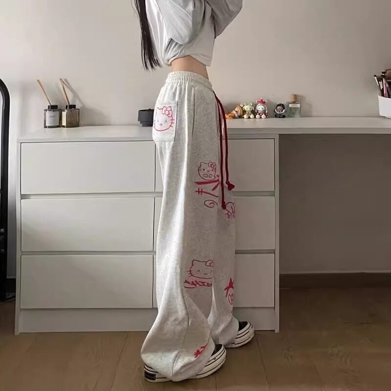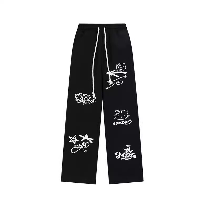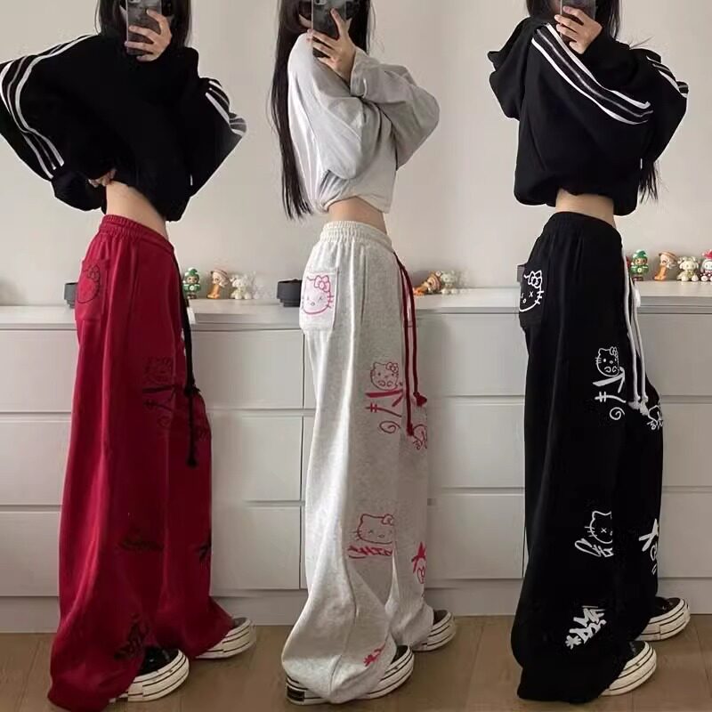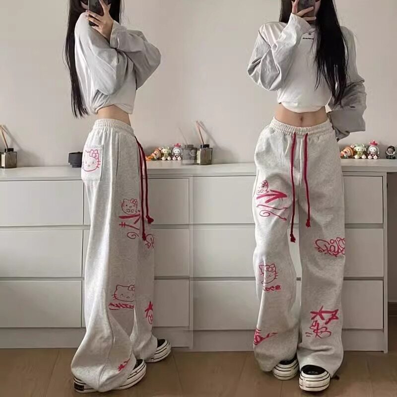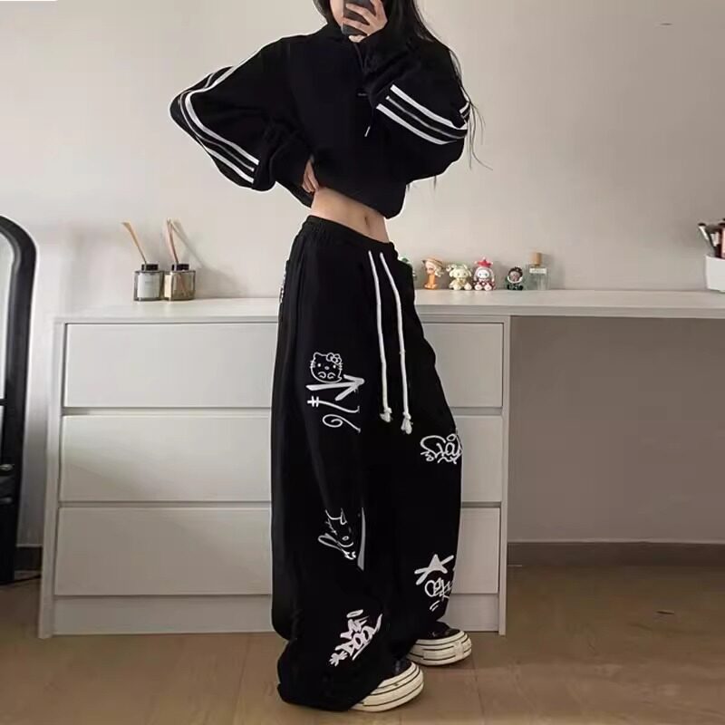 特大碼300斤美式復古街頭塗鴉運動褲女春夏季寬鬆高腰休閒濶腿褲