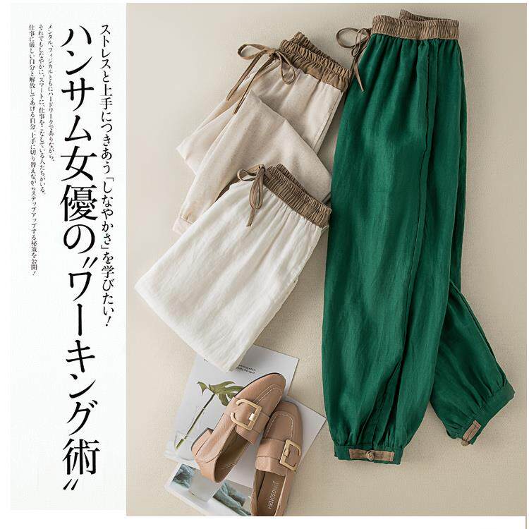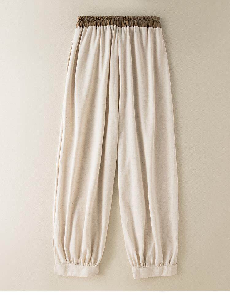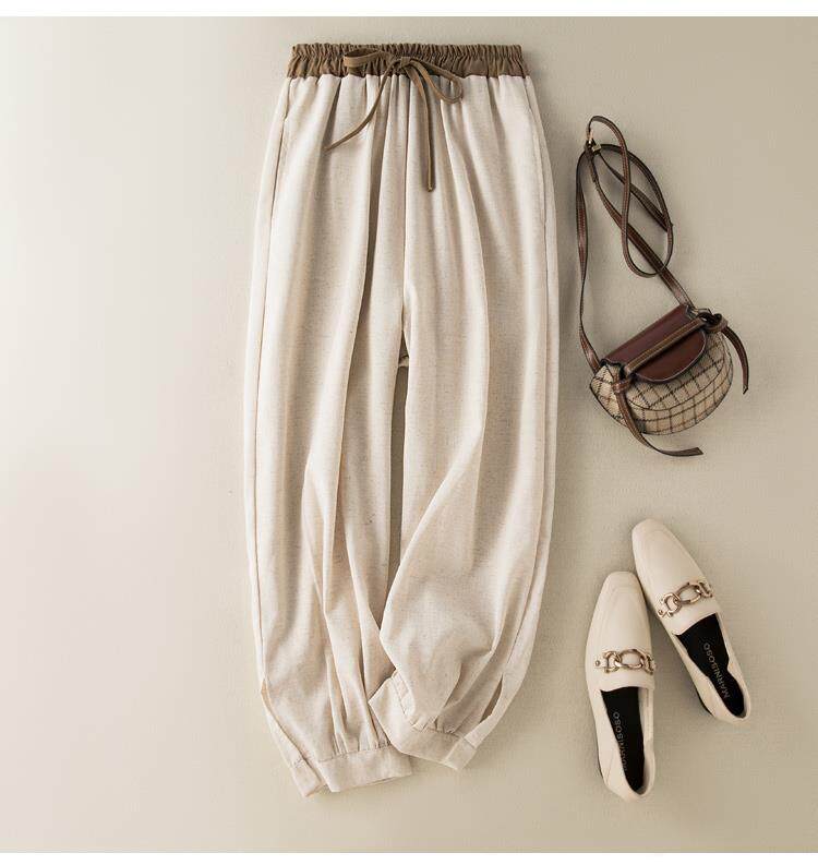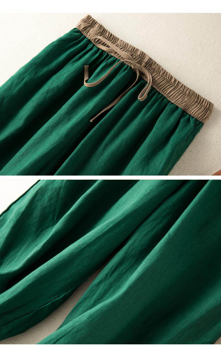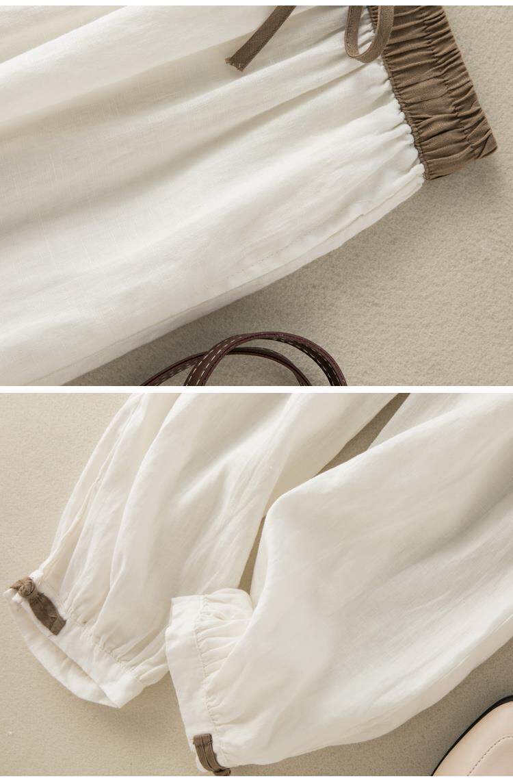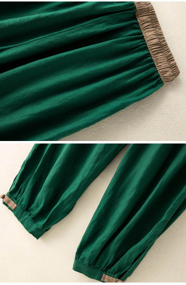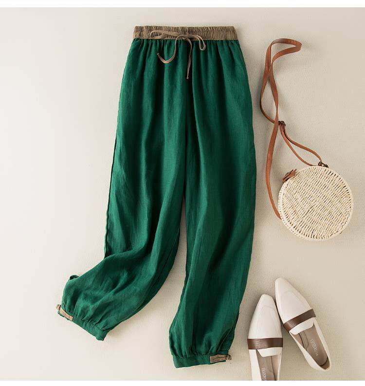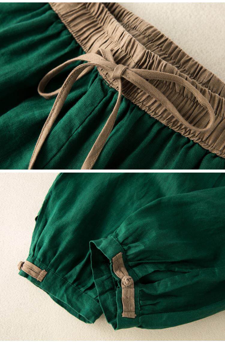清倉撿漏~專櫃撤廻復古撞色盤釦亞麻九分褲女夏季薄款棉麻哈倫褲