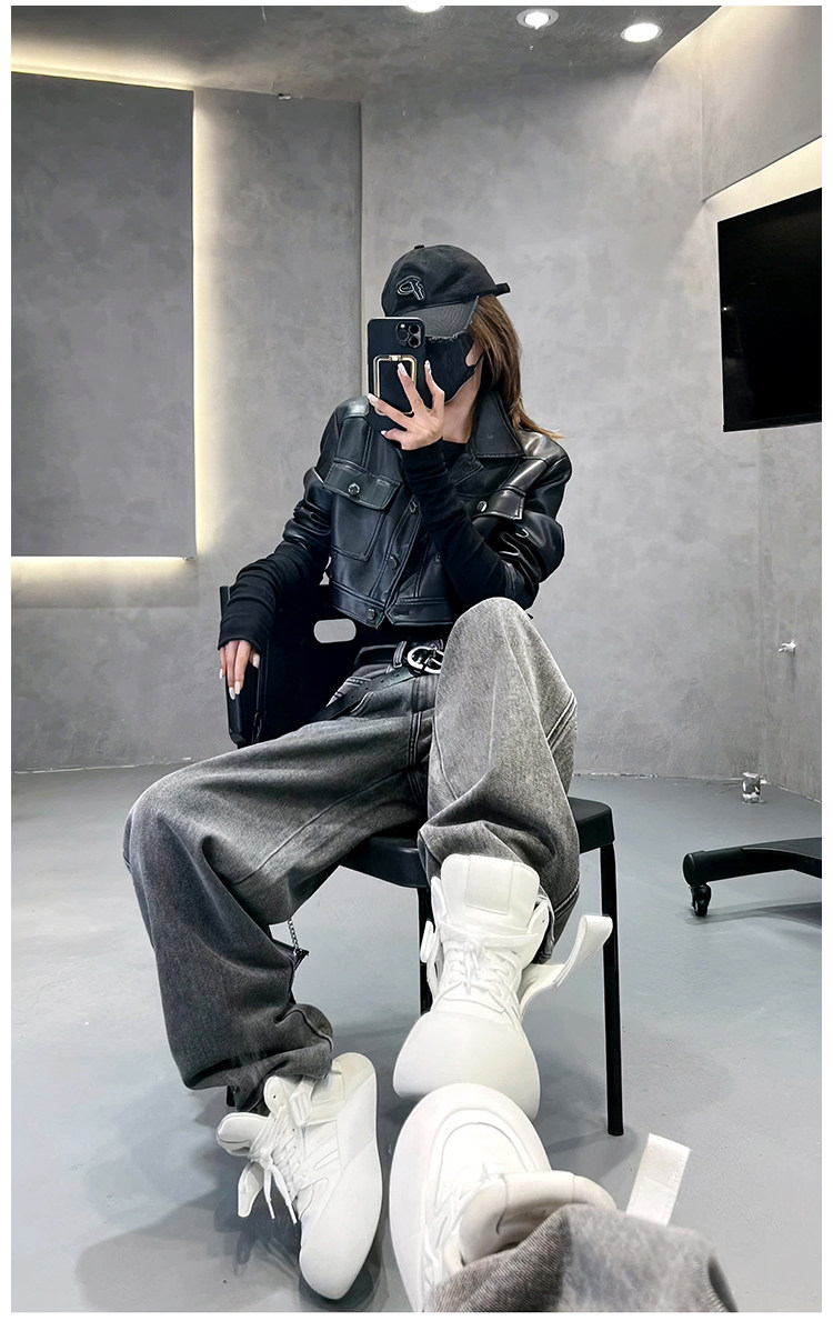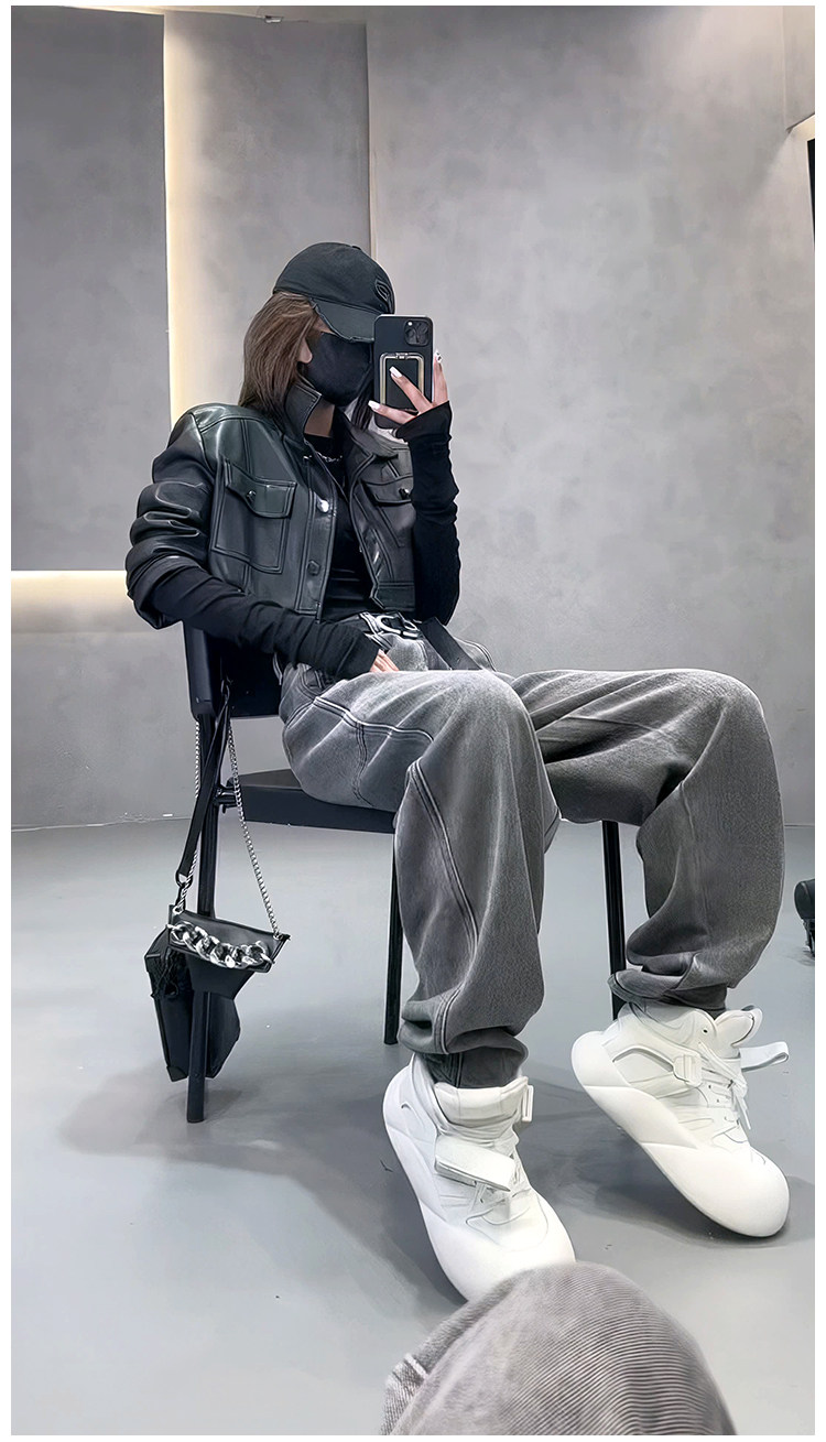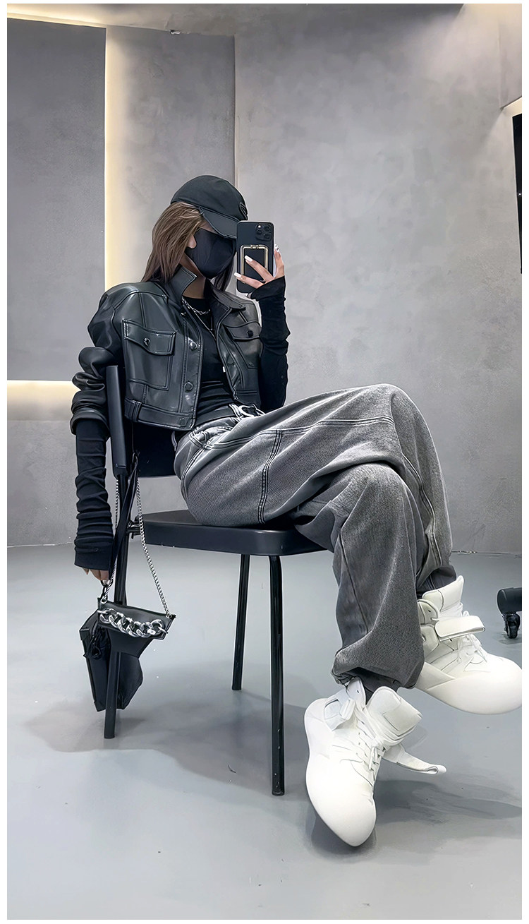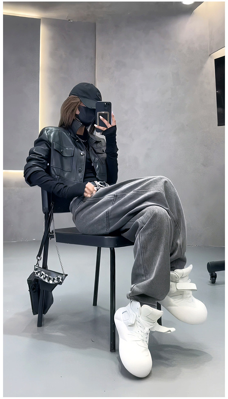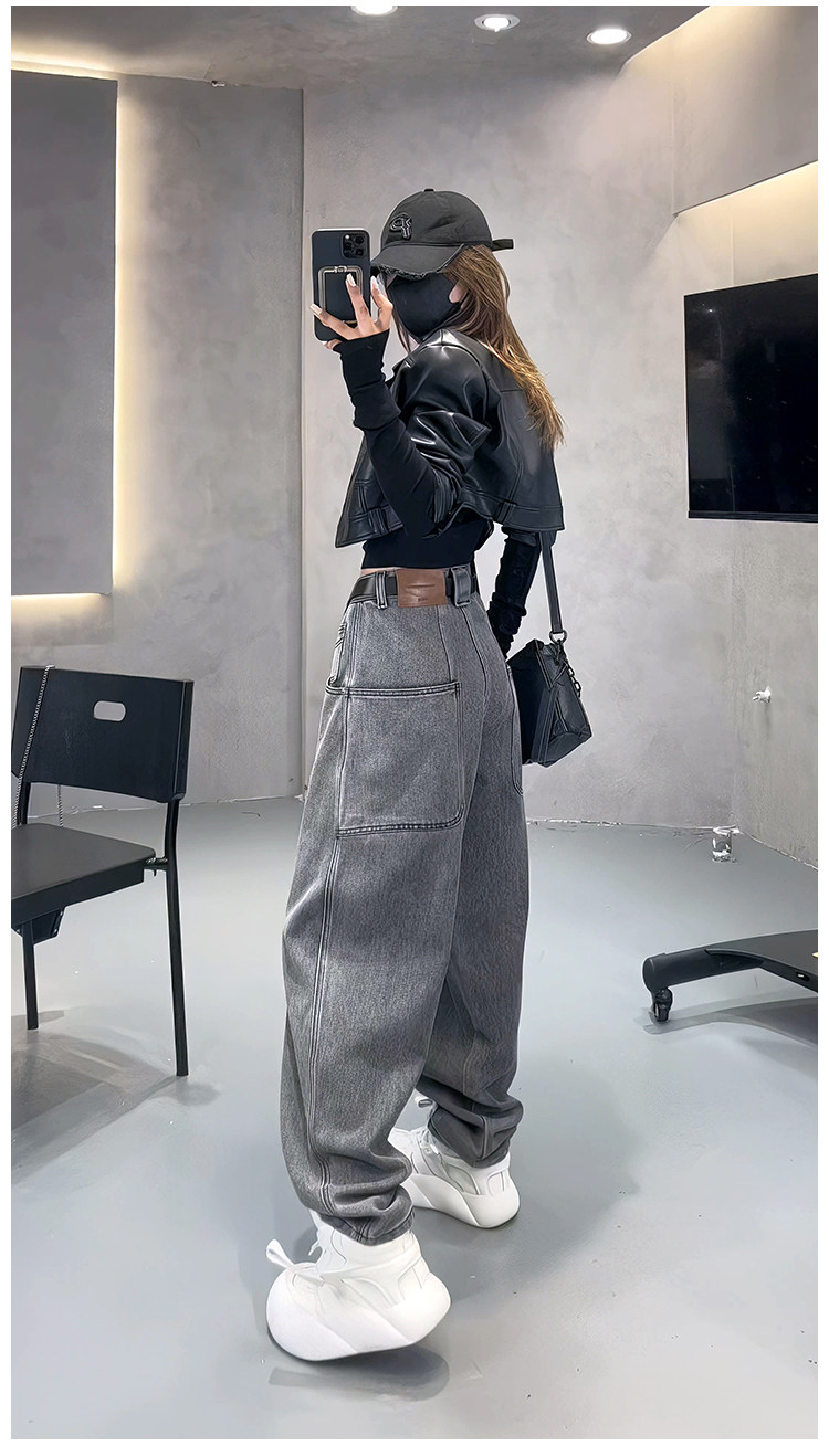 美式復古灰色褲子女設計感小衆高腰直筒彈力歐貨濶腿顯瘦牛仔褲潮