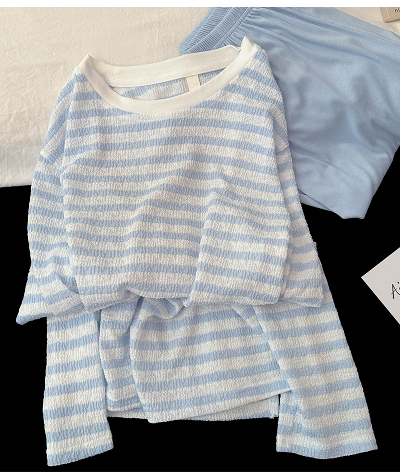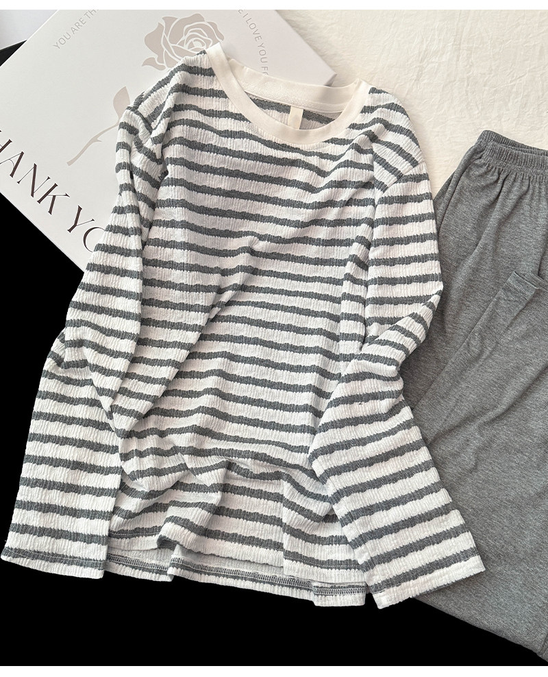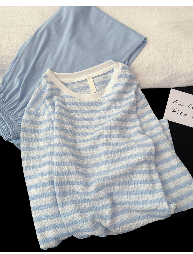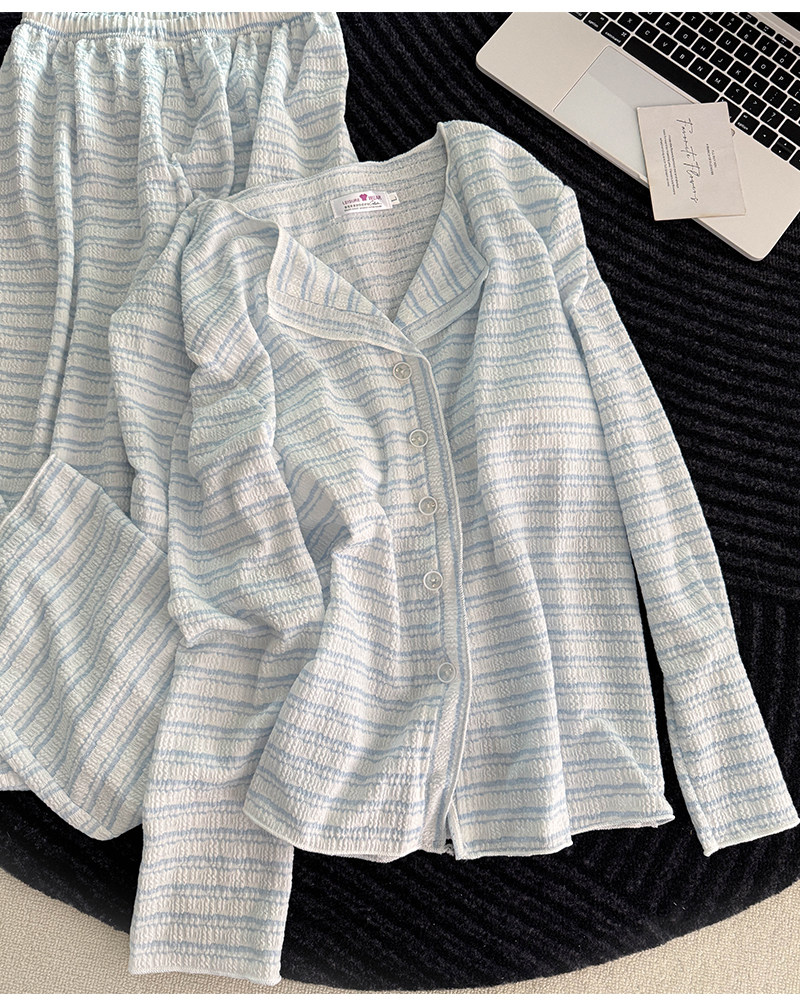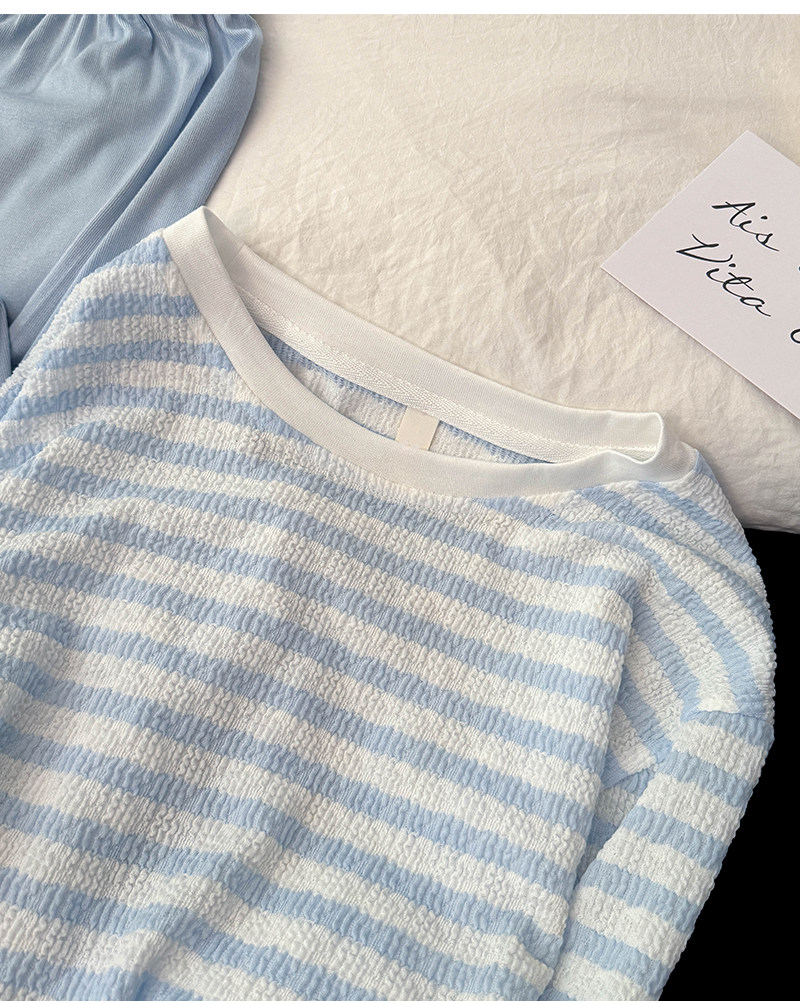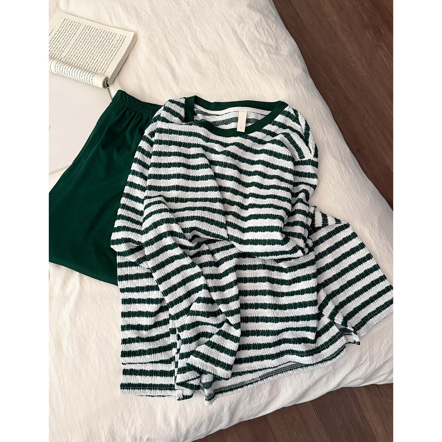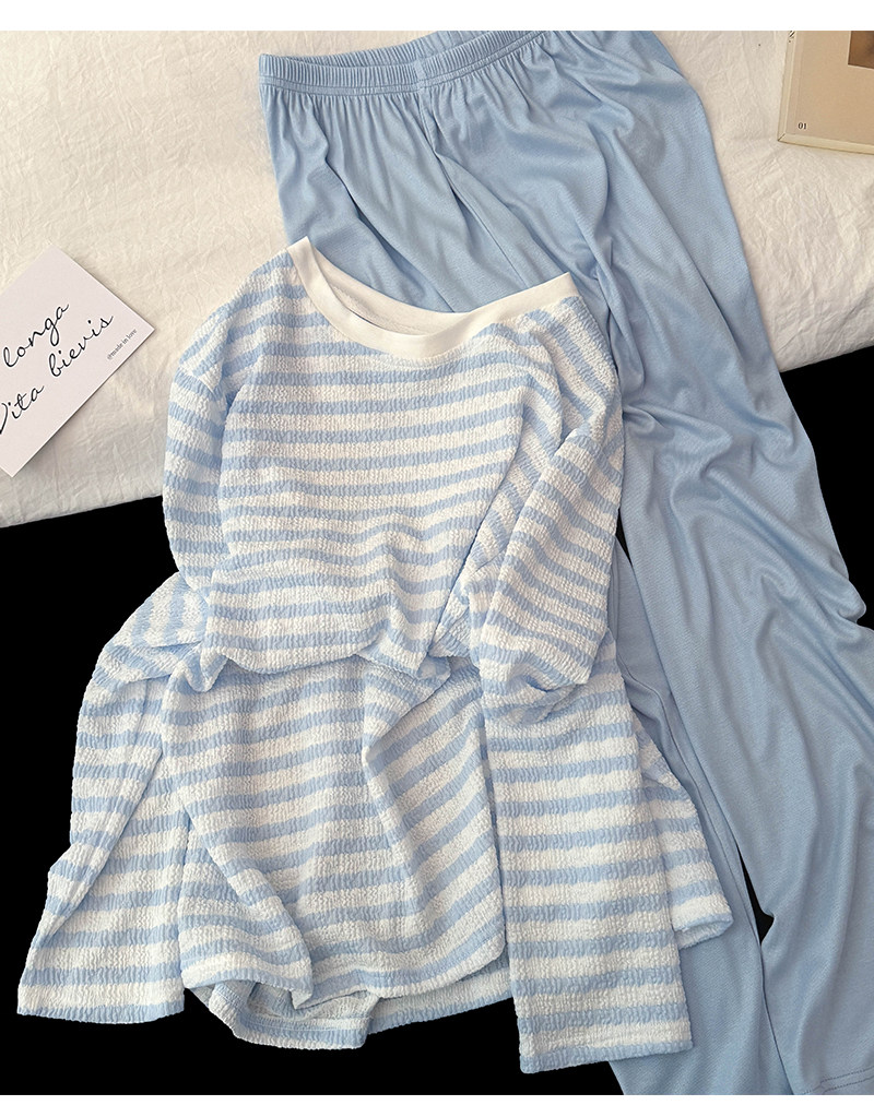莫代爾棉睡衣女款春秋季韓系ins小清新條紋長袖長褲家居服可外穿