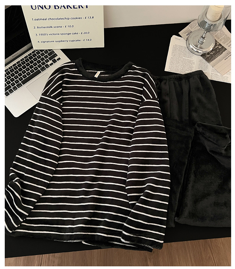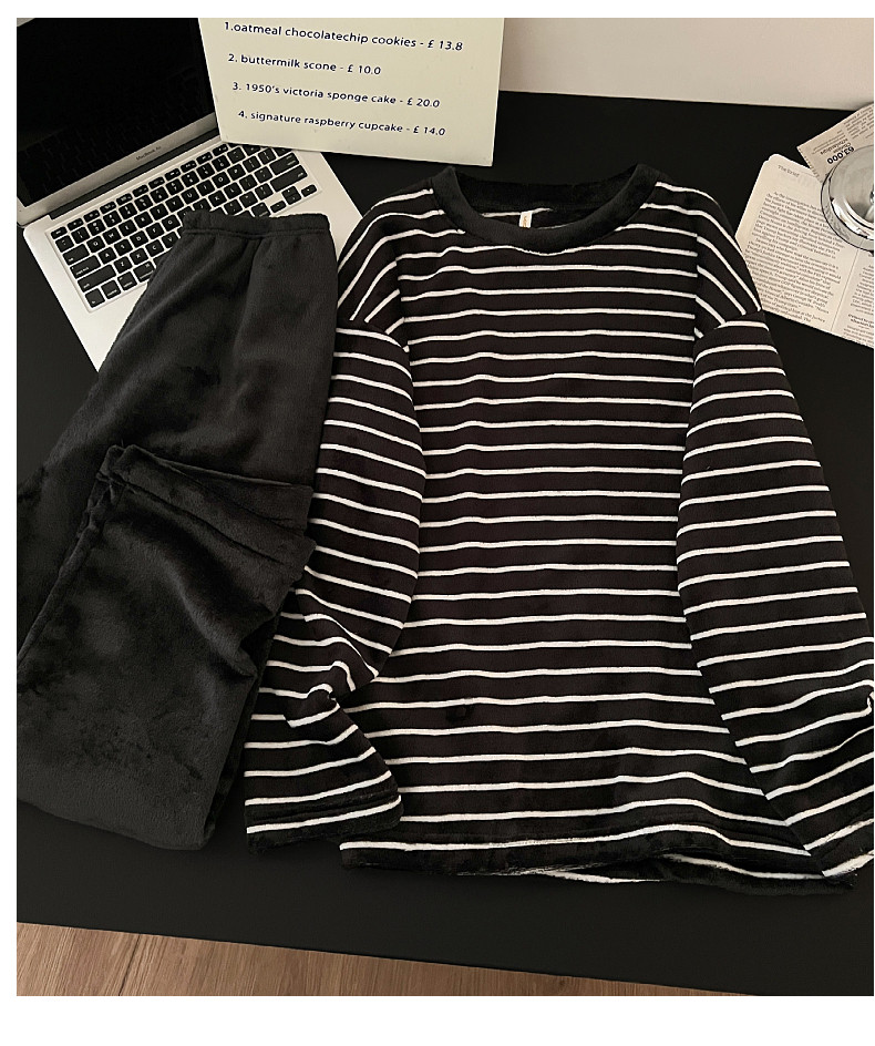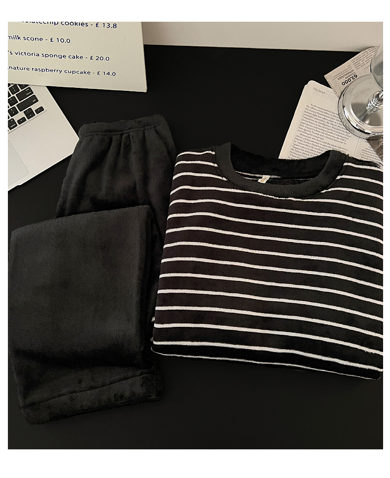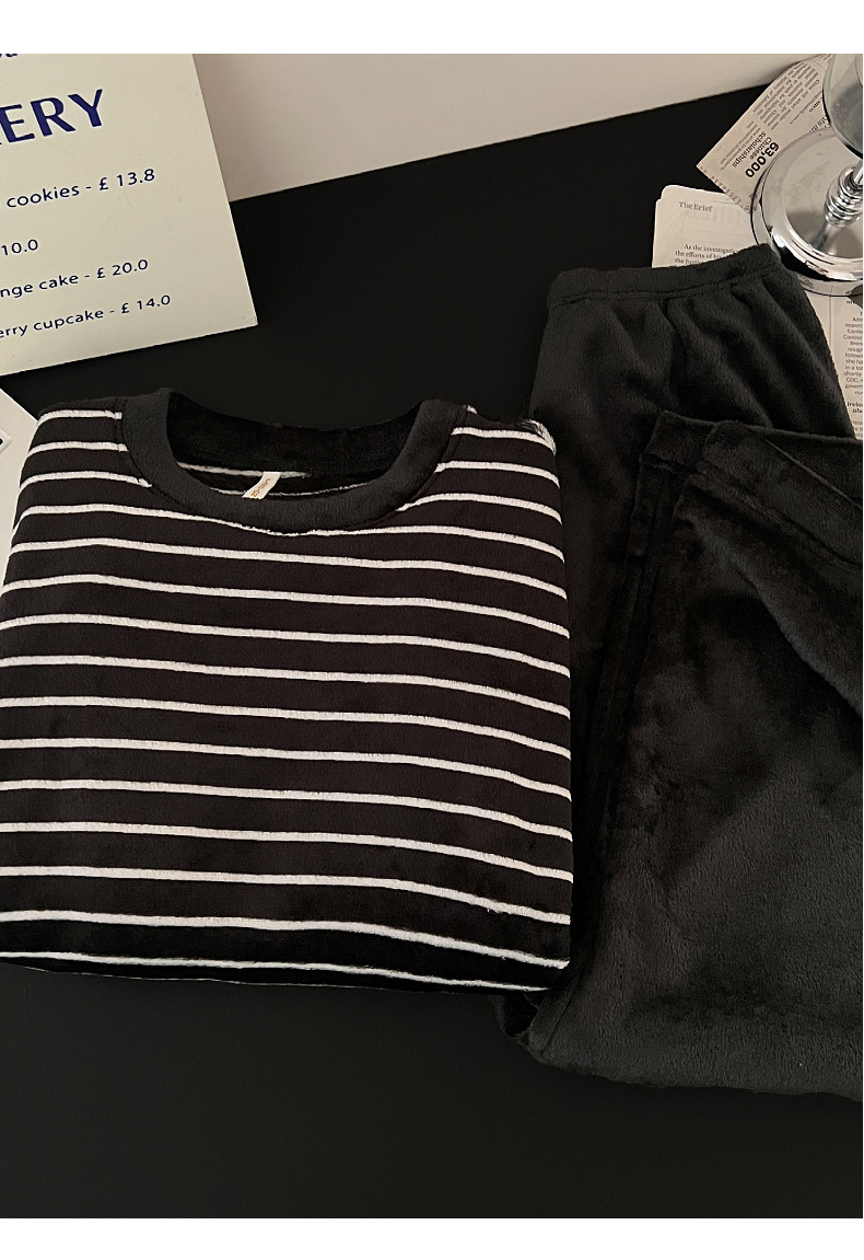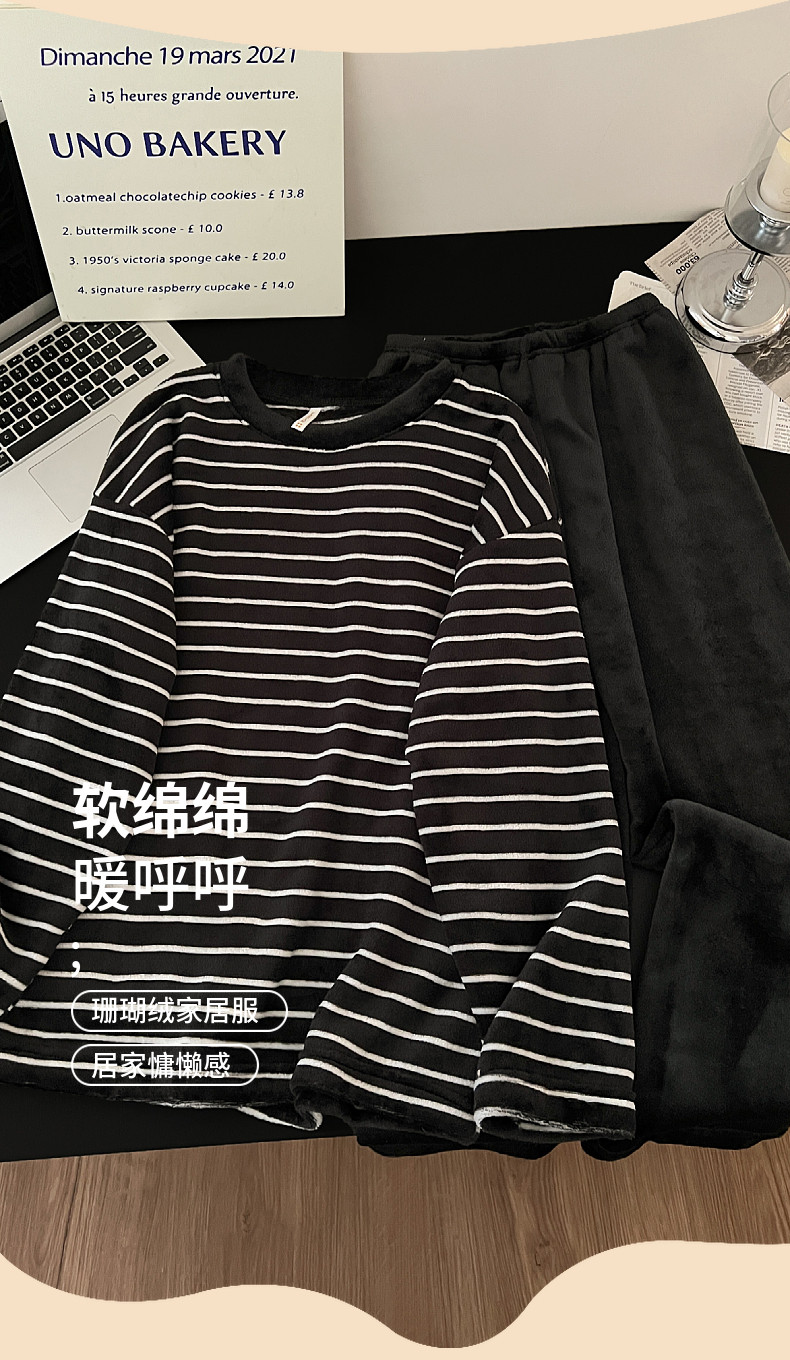 珊瑚絨情侶睡衣秋冬季加絨保暖男士女條紋可外穿法蘭絨家居服套裝