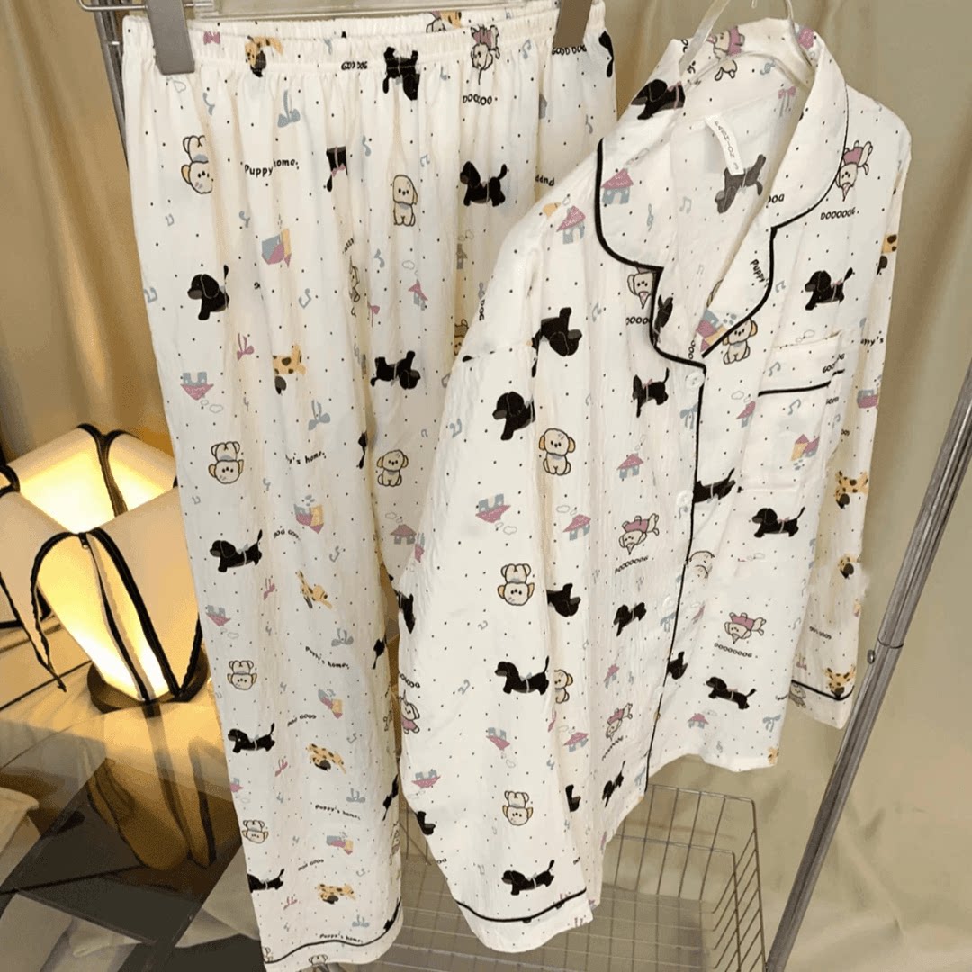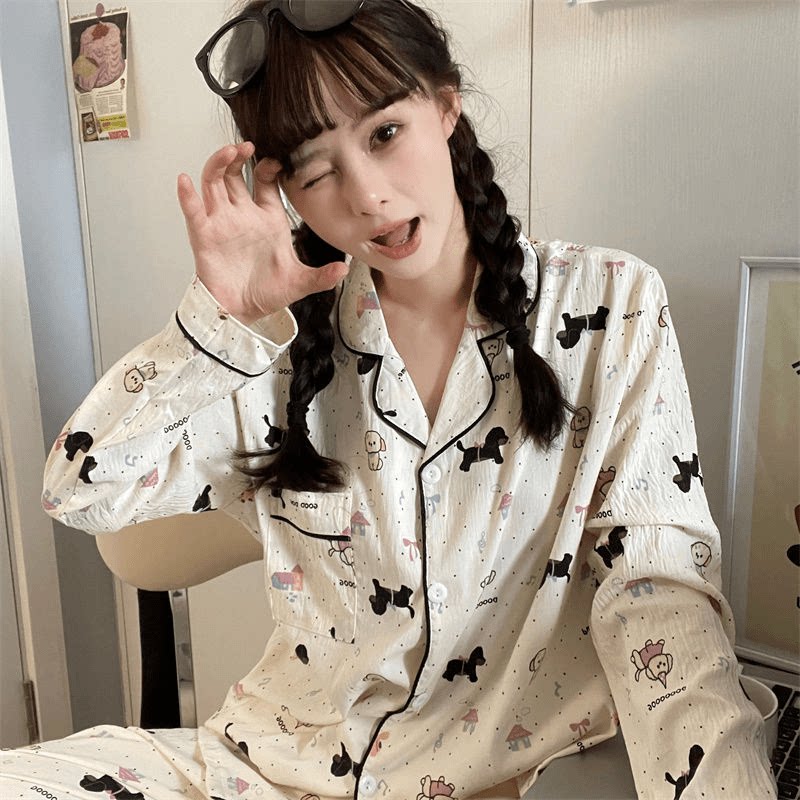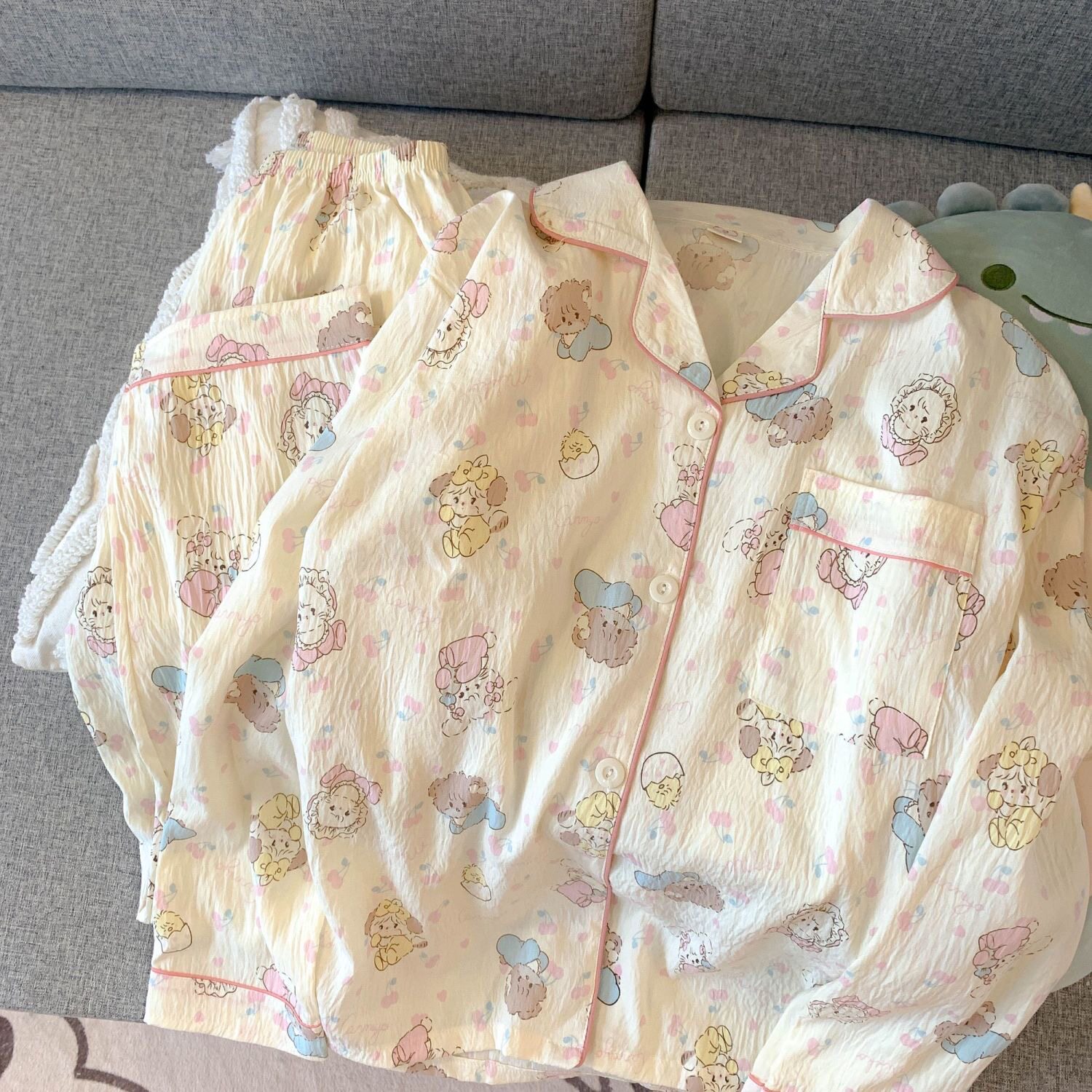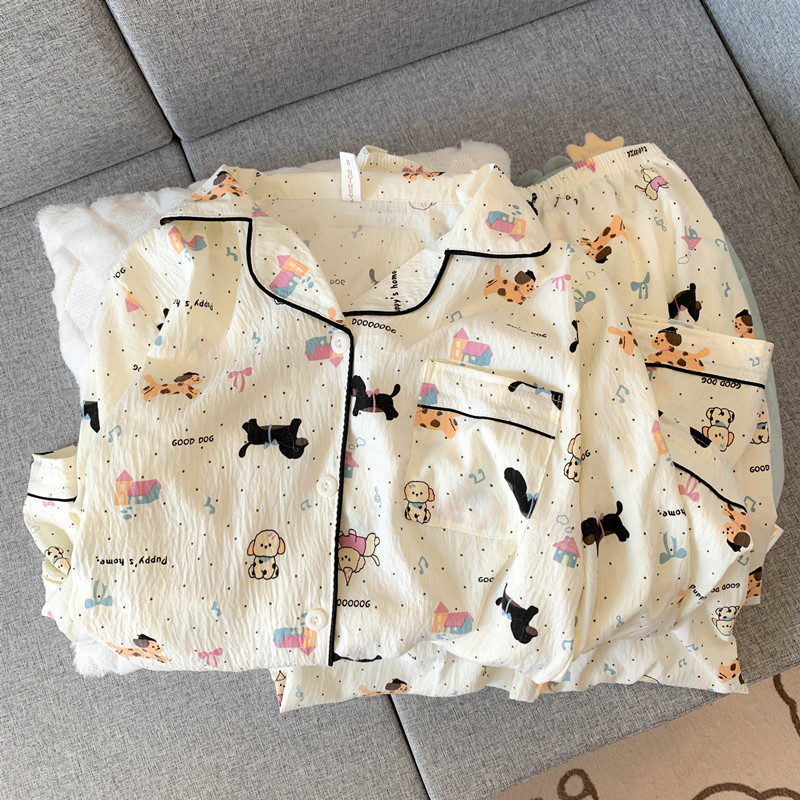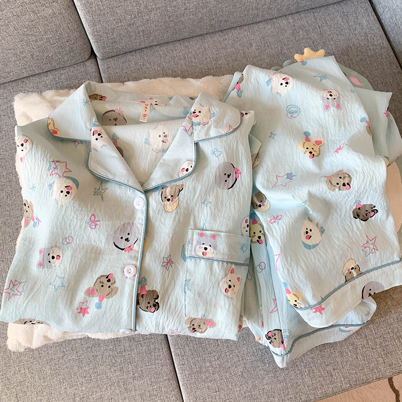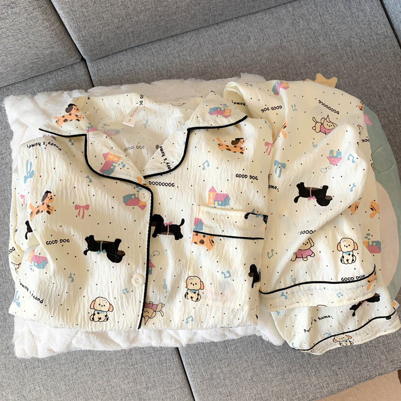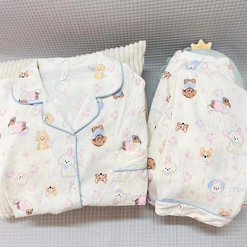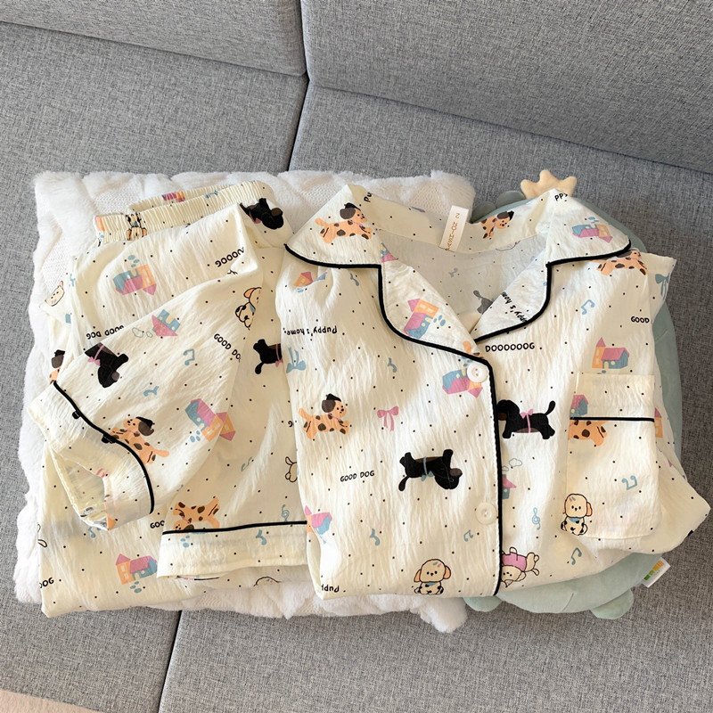 2025年新款睡衣女款春秋季純棉紗布長袖長褲日系ins小狗家居服夏