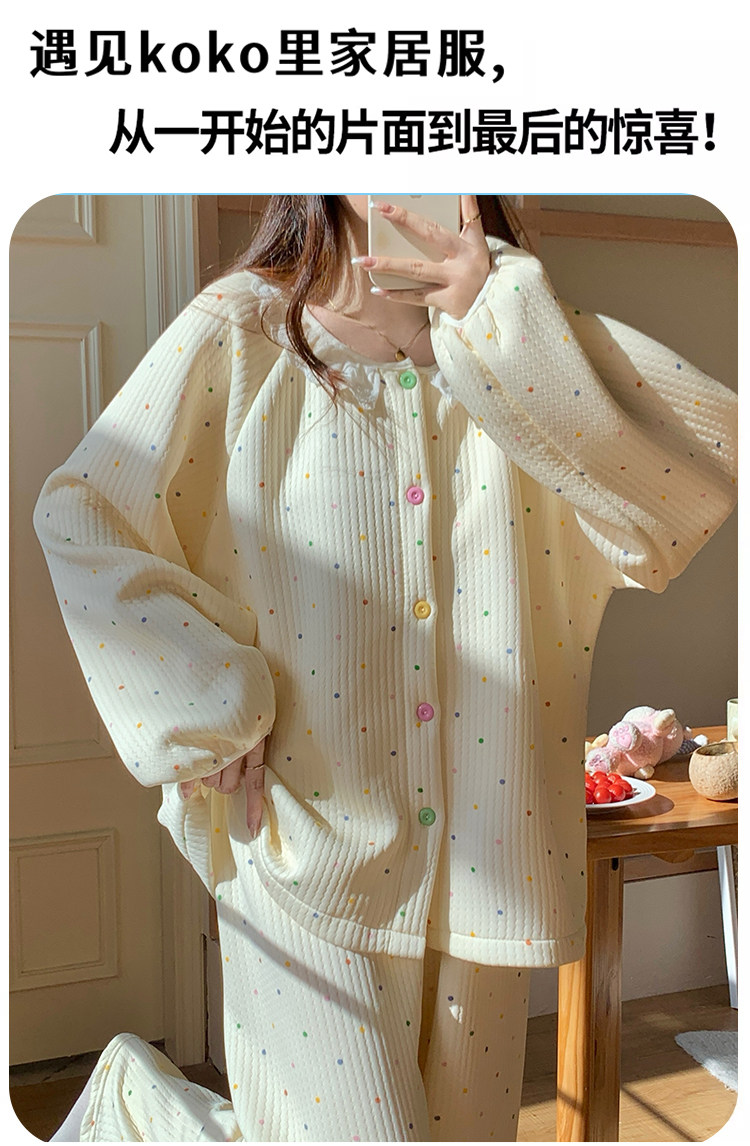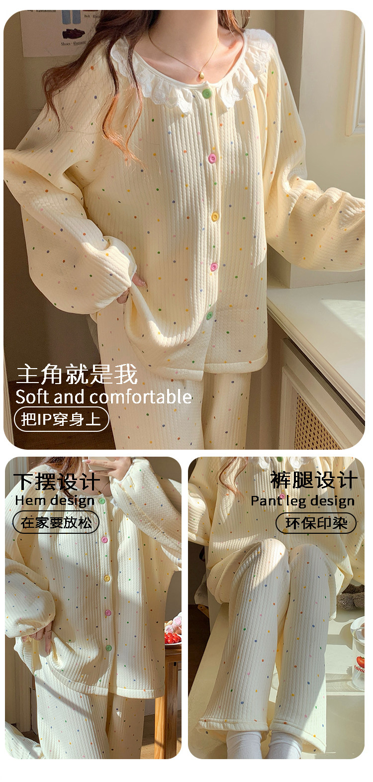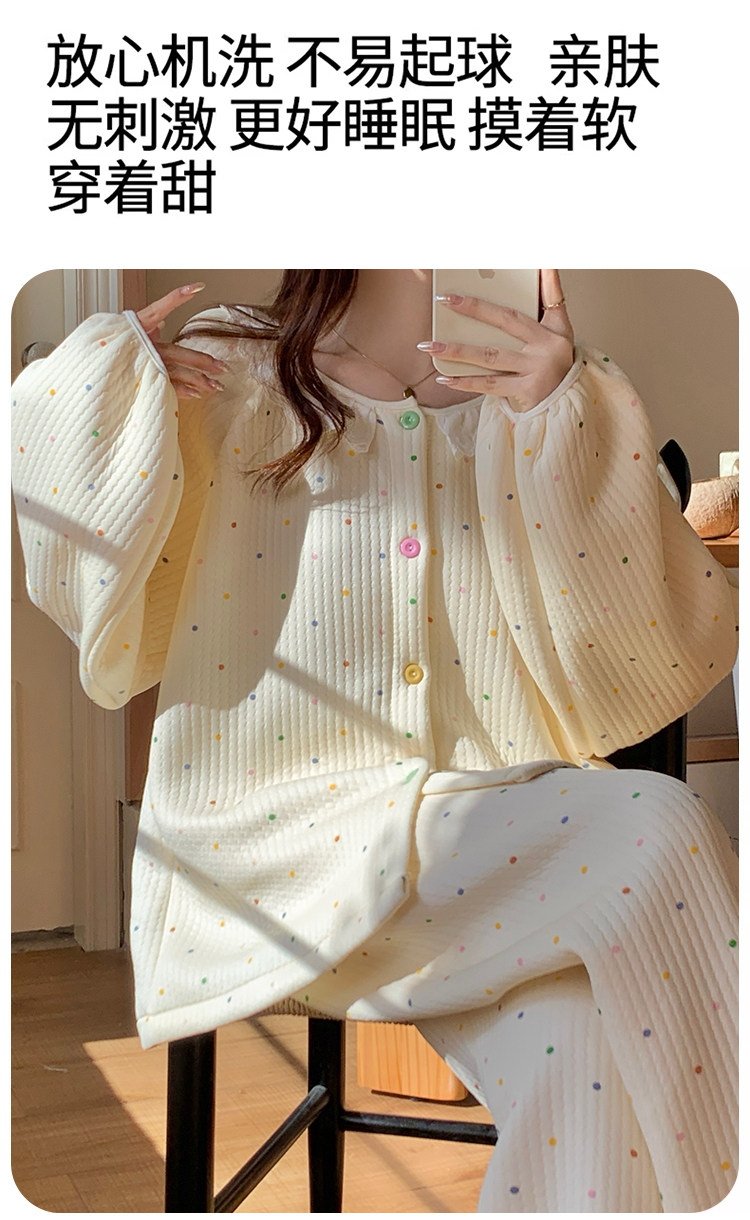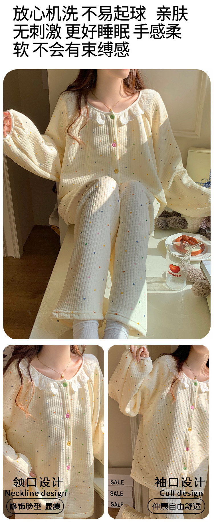 甜美波點睡衣女款秋冬季空氣棉夾層加厚保暖高級感家居服套裝大碼