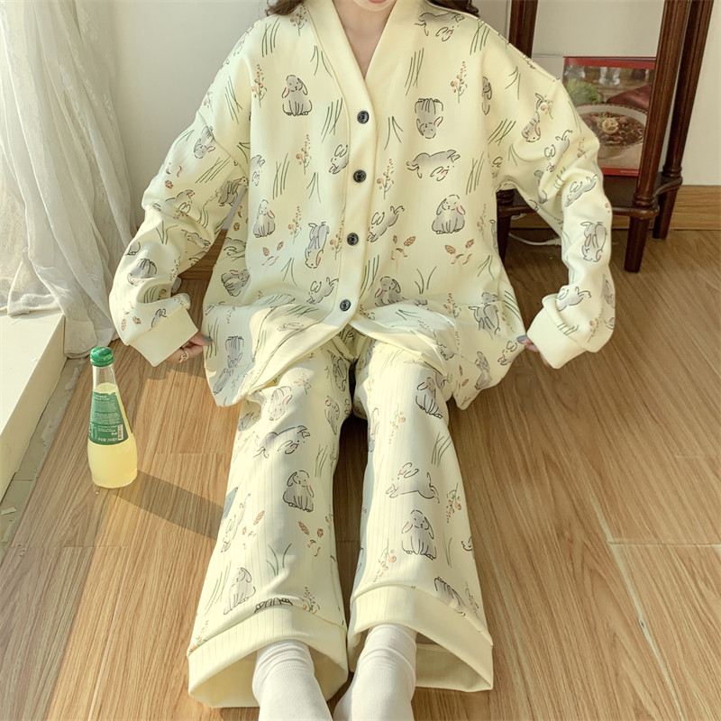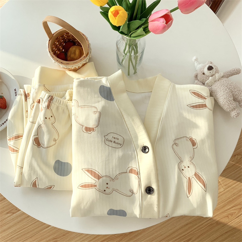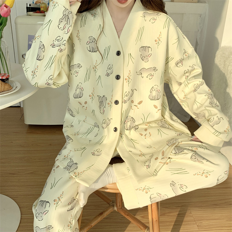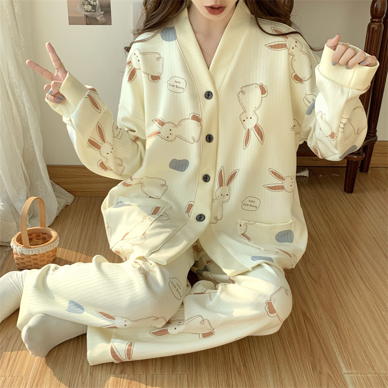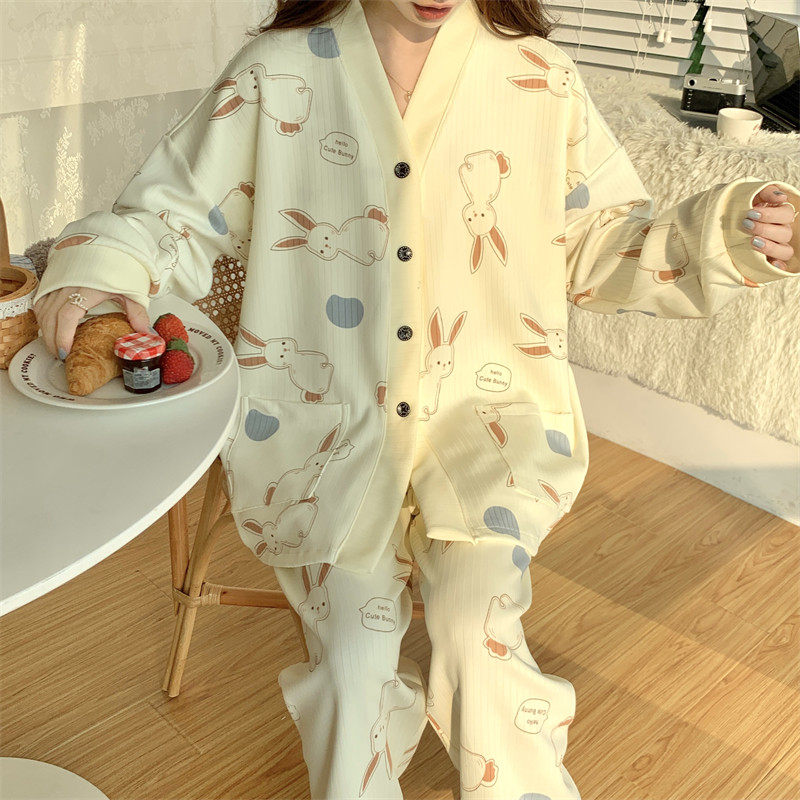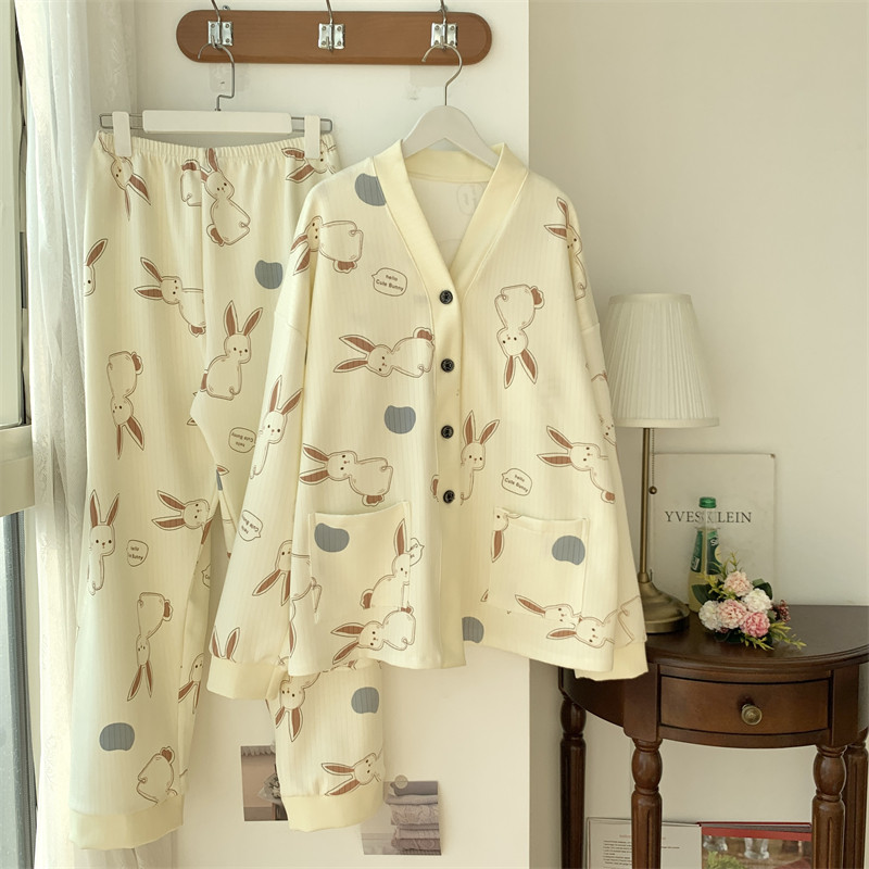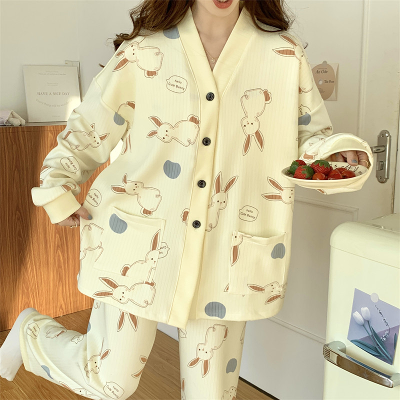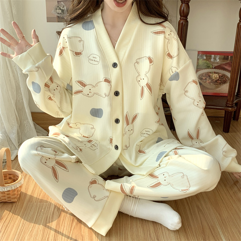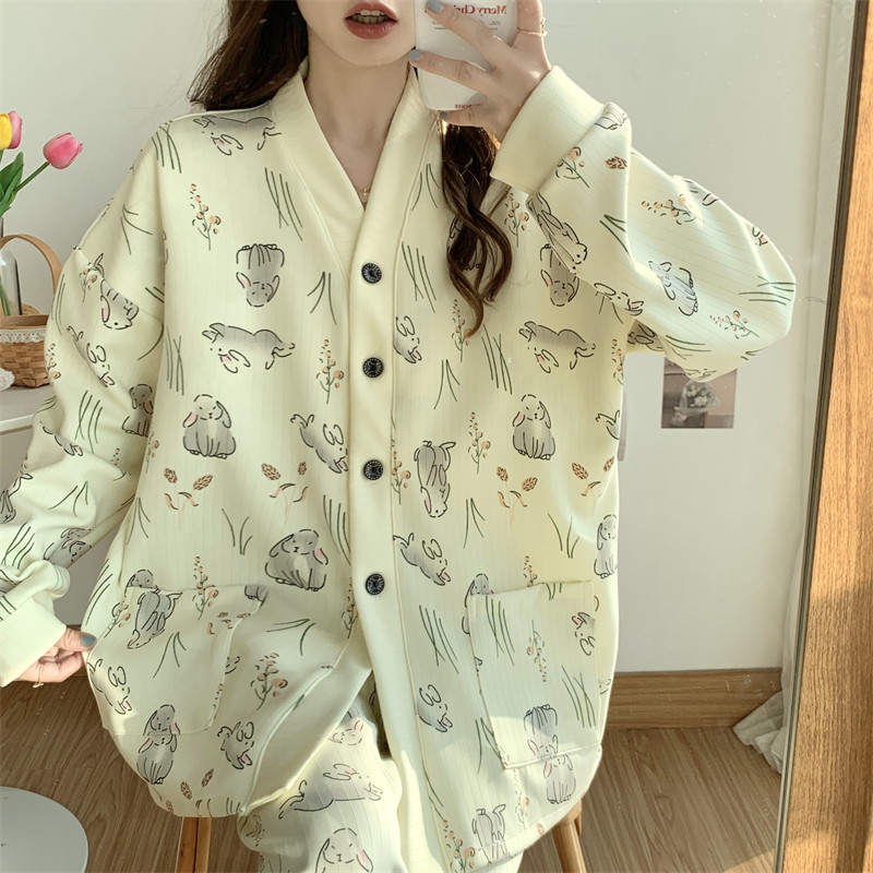 春秋睡衣女大碼200斤帶胸墊防凸點薄款開衫兔子長袖寬鬆家居服