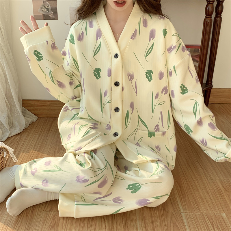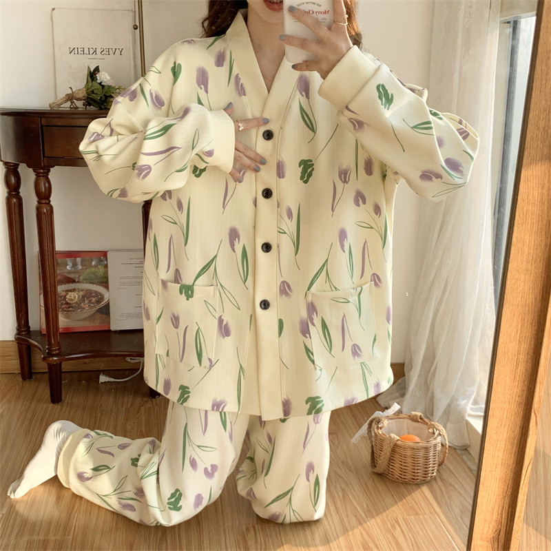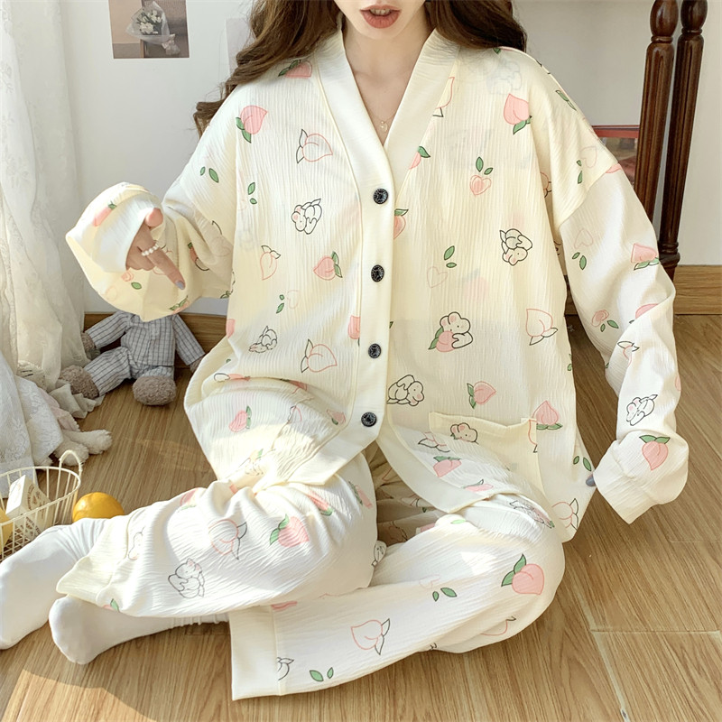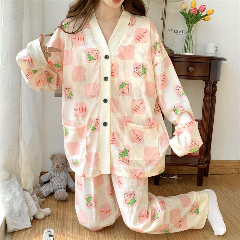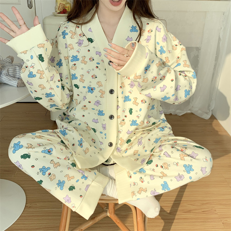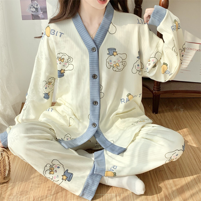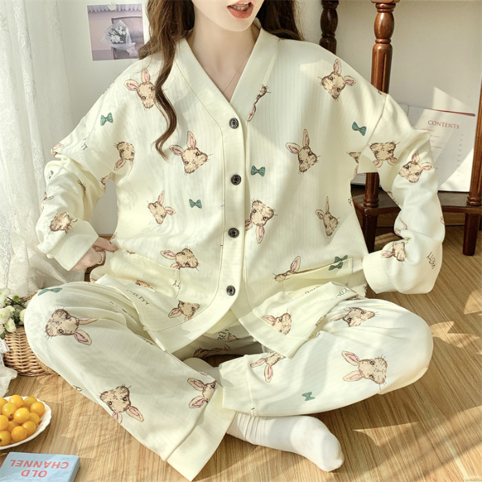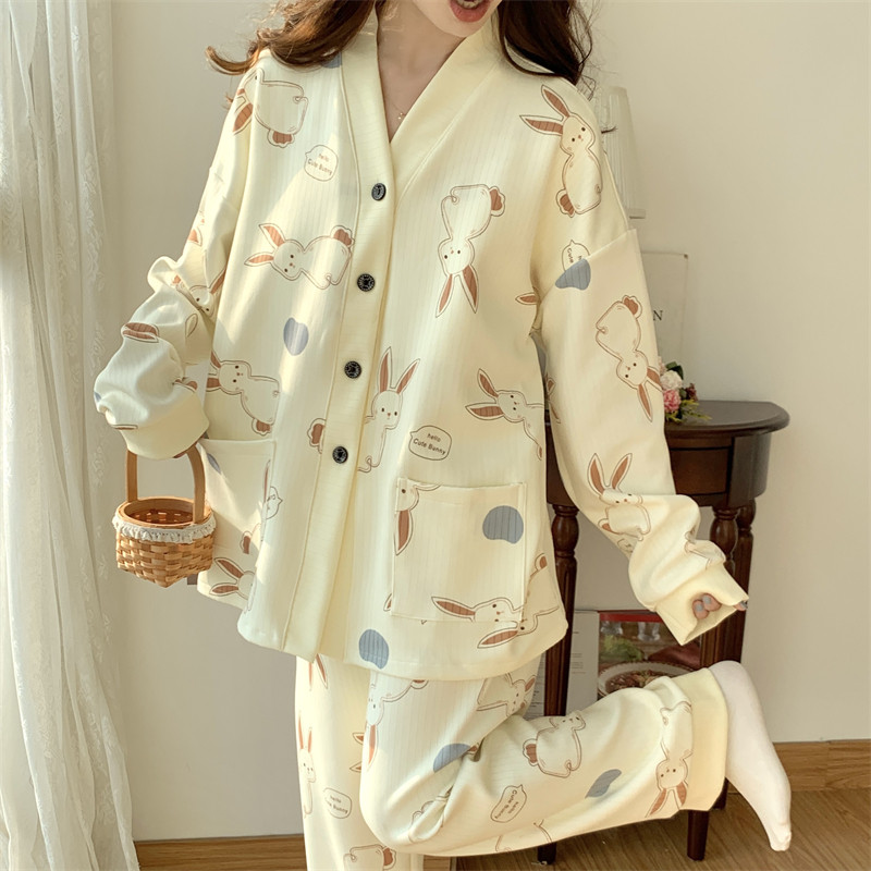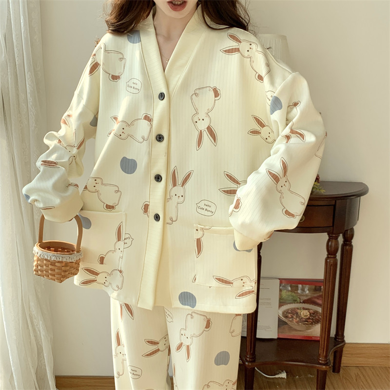 春秋睡衣女大碼200斤帶胸墊防凸點薄款開衫兔子長袖寬鬆家居服