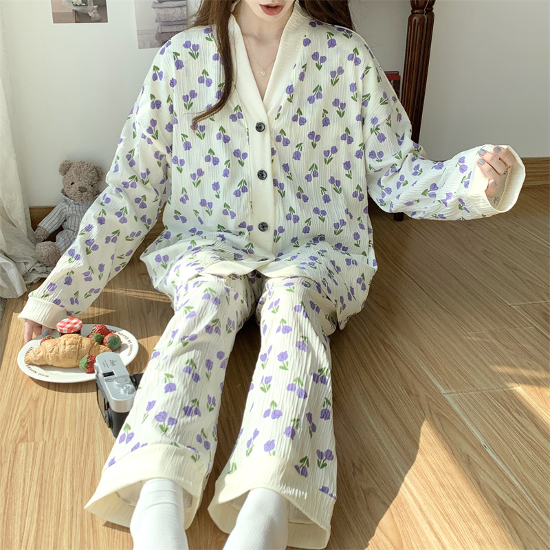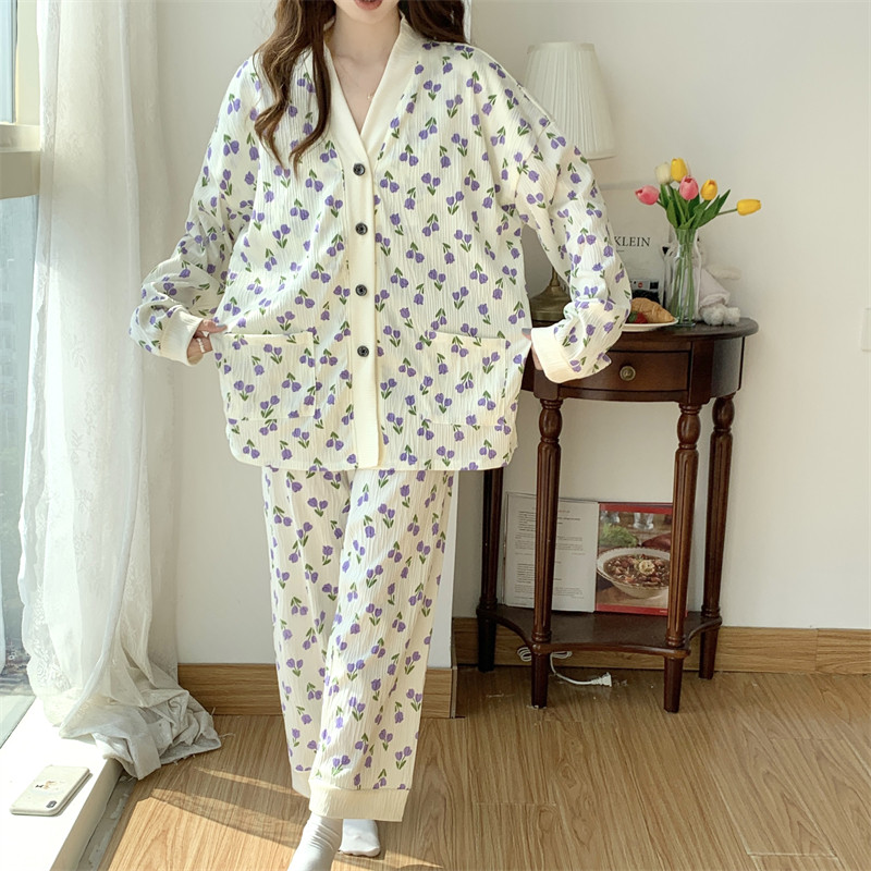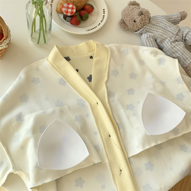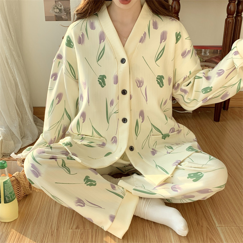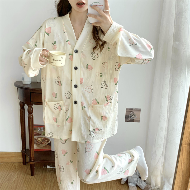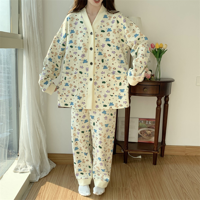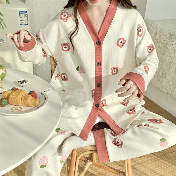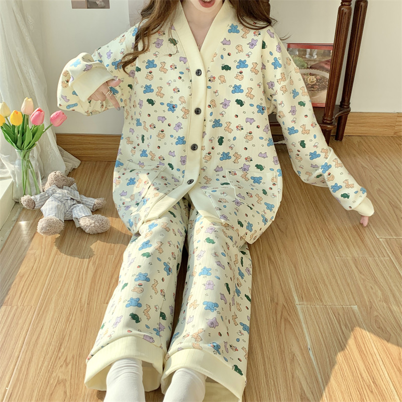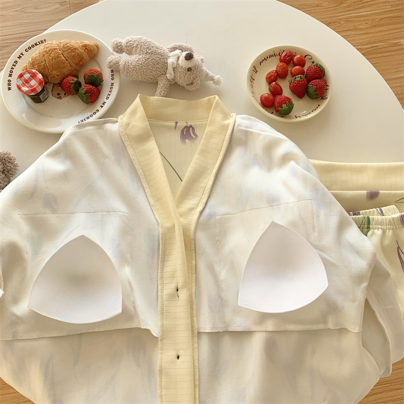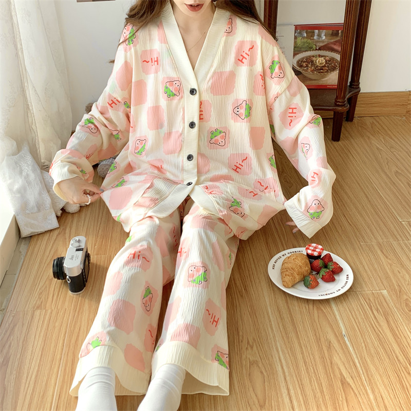 春秋睡衣女大碼200斤帶胸墊防凸點薄款開衫兔子長袖寬鬆家居服