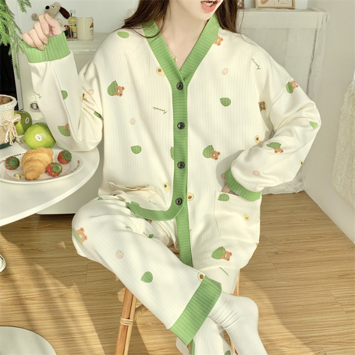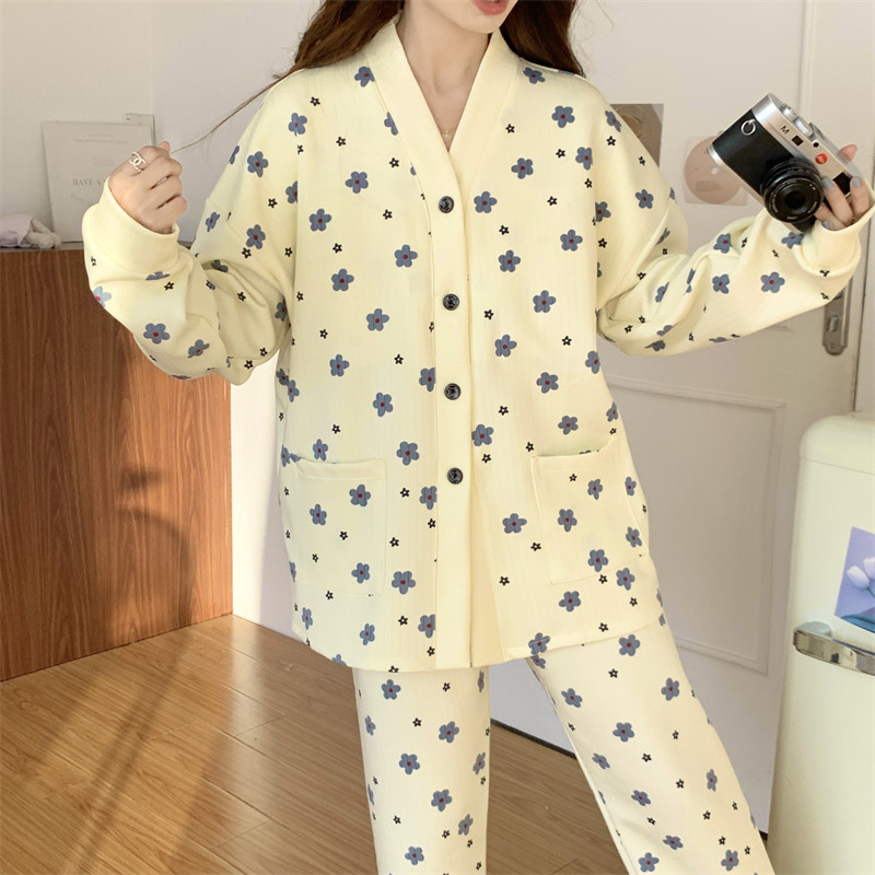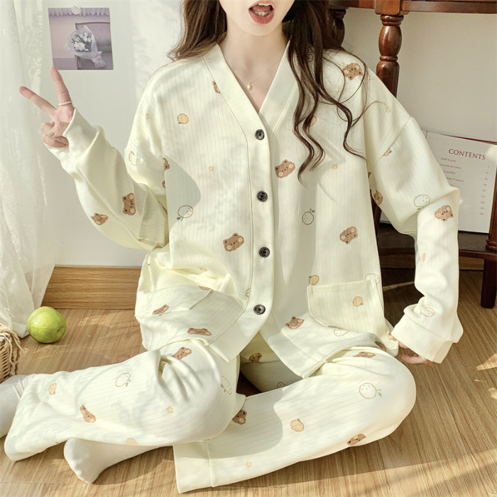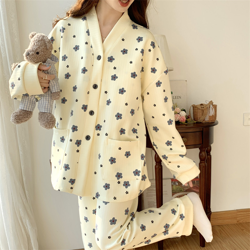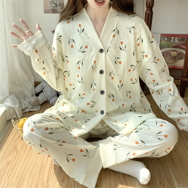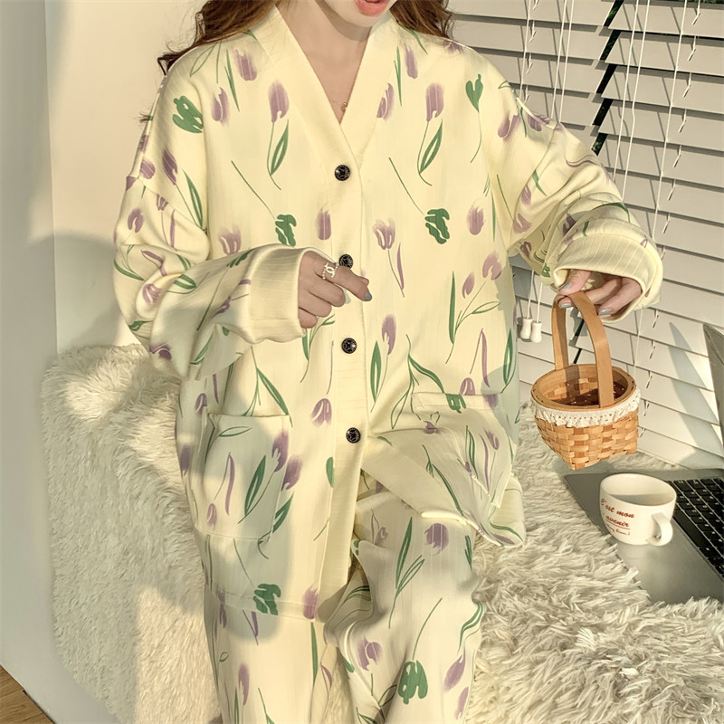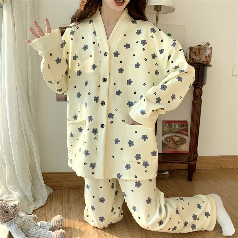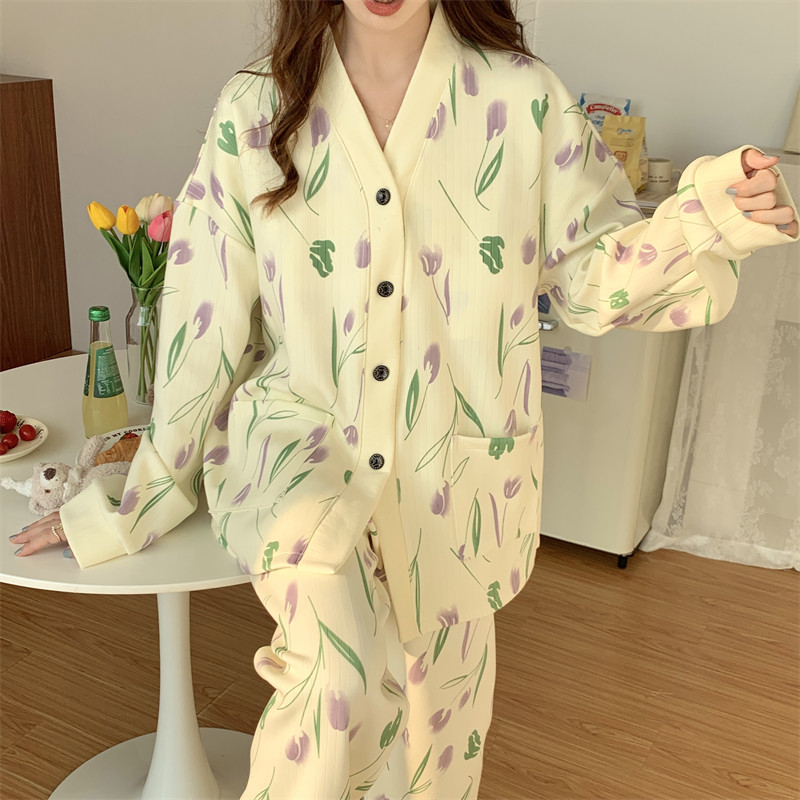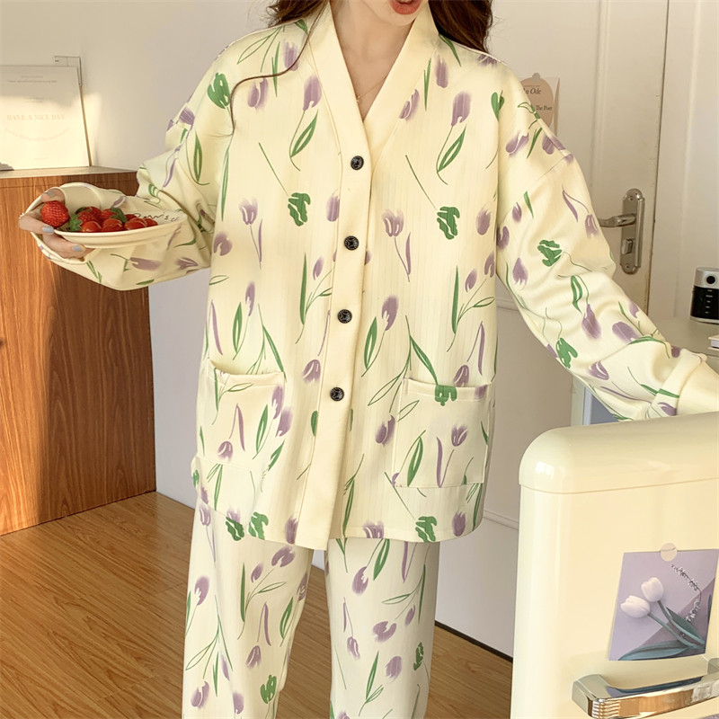 春秋睡衣女大碼200斤帶胸墊防凸點薄款開衫兔子長袖寬鬆家居服