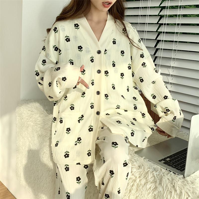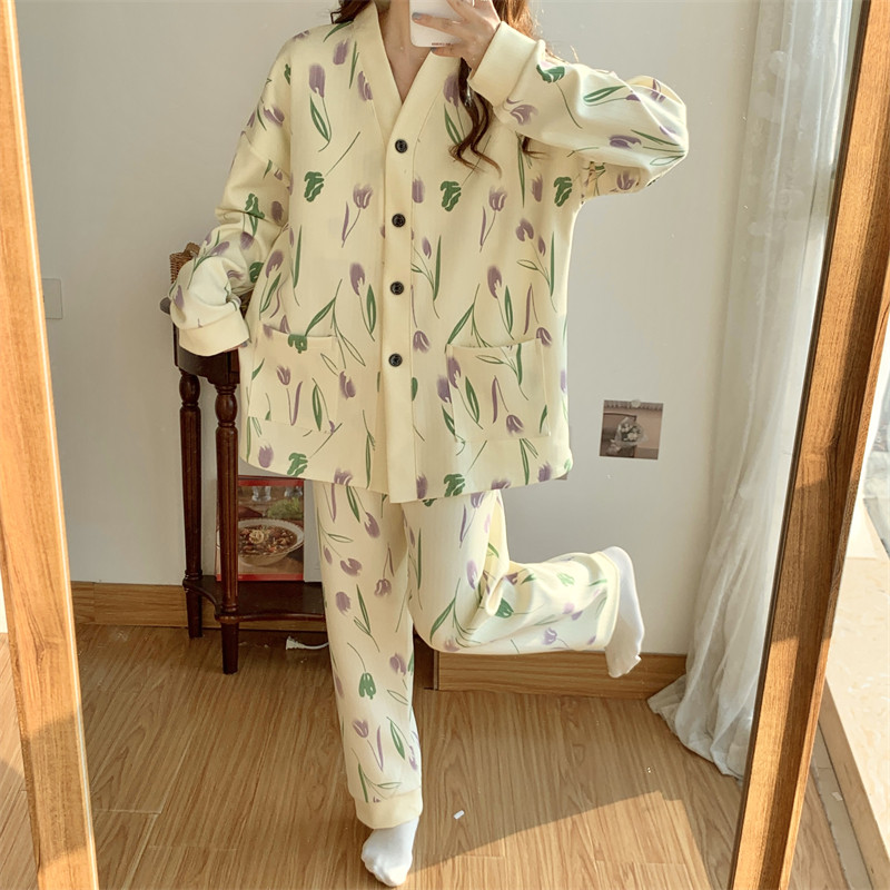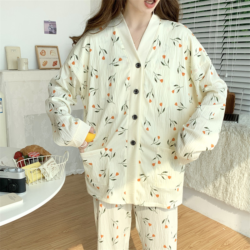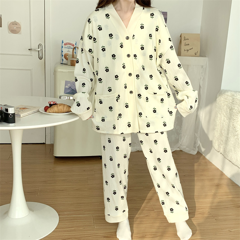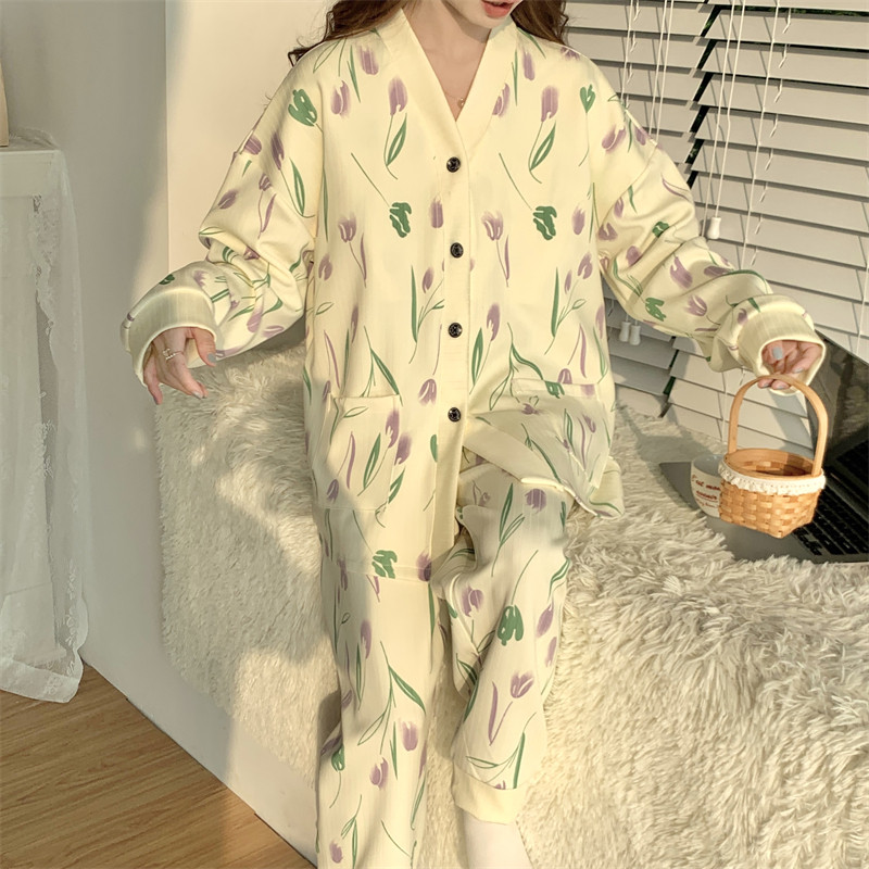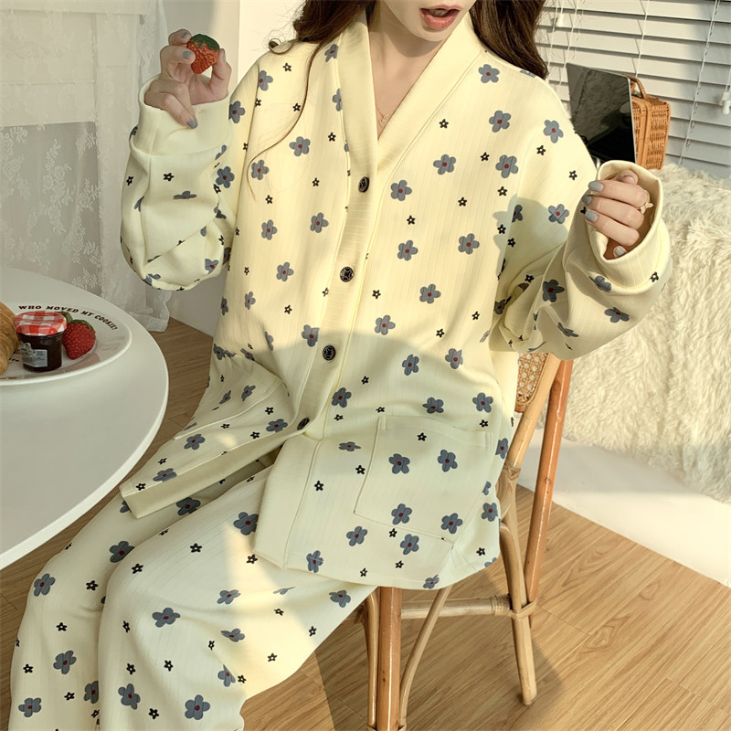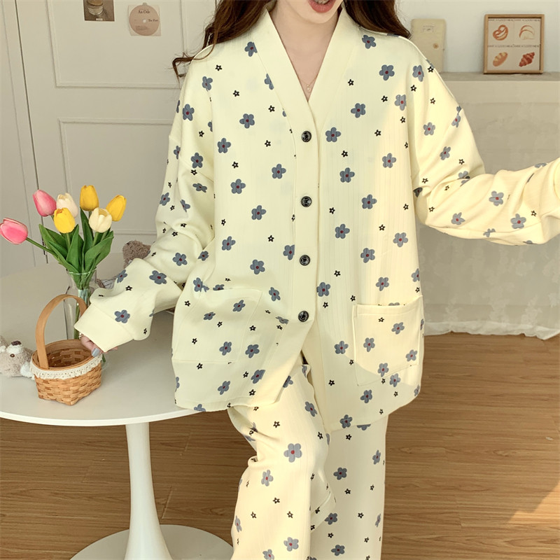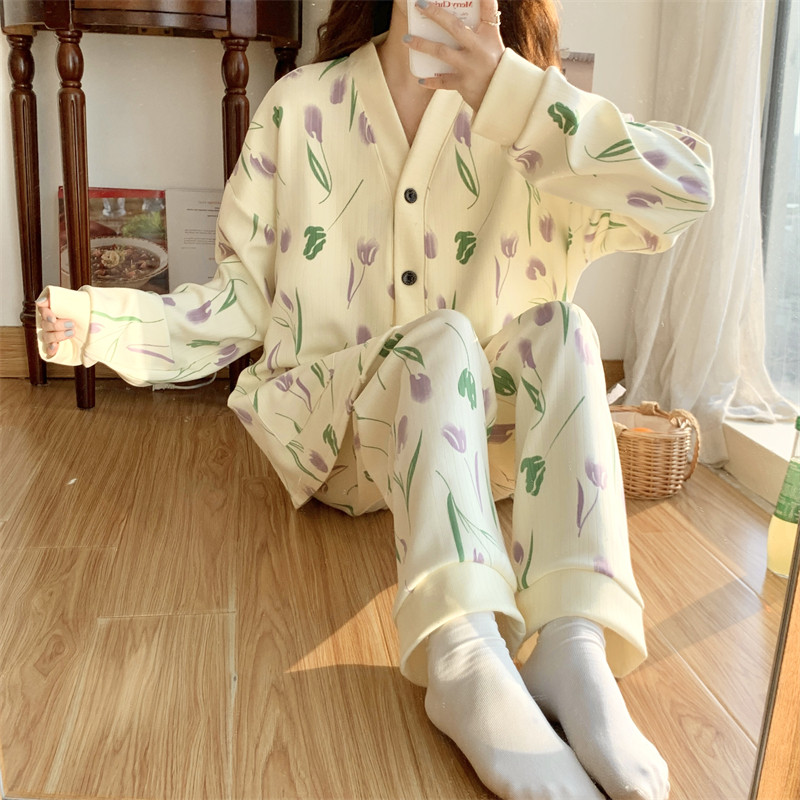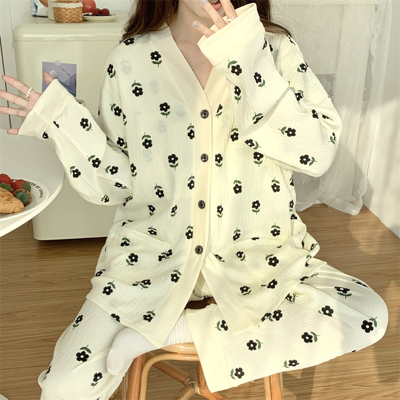 春秋睡衣女大碼200斤帶胸墊防凸點薄款開衫兔子長袖寬鬆家居服