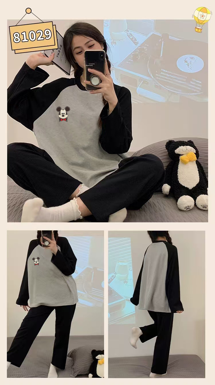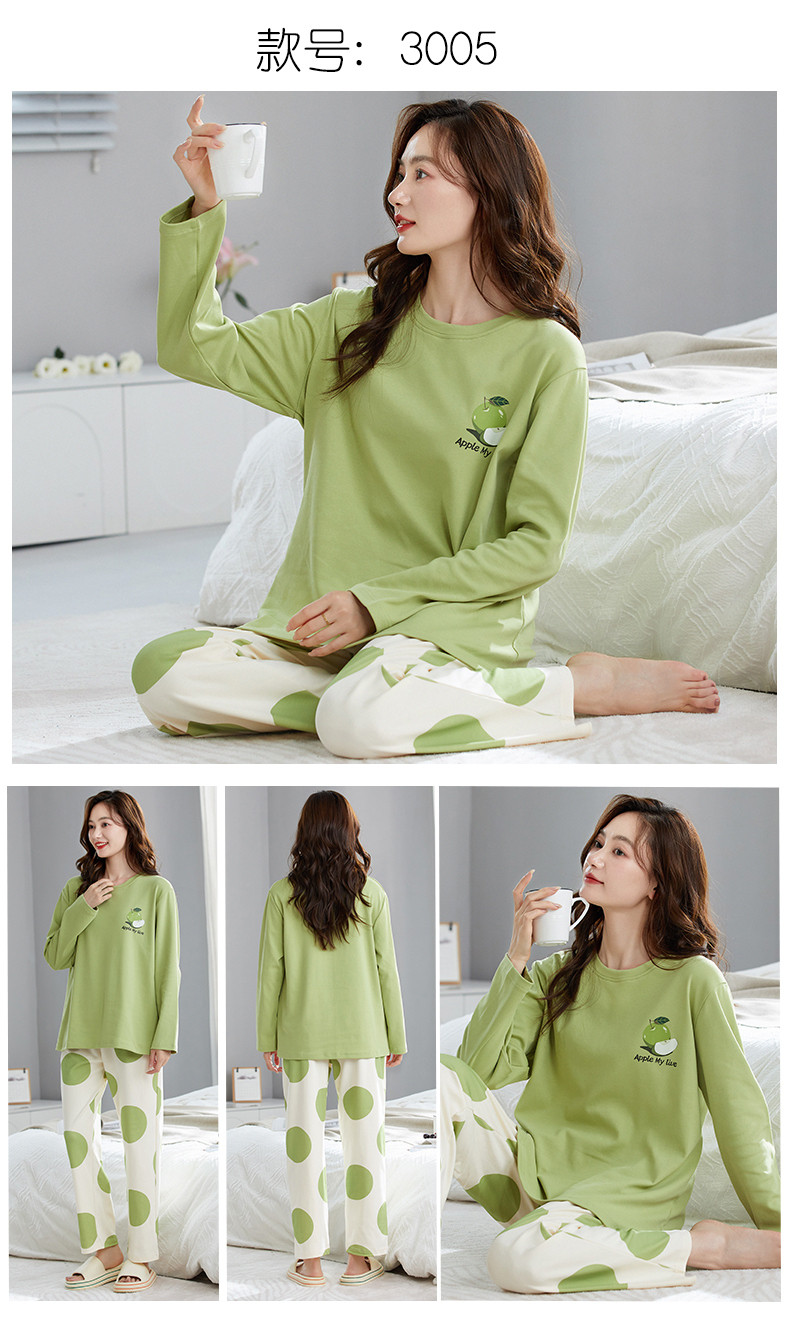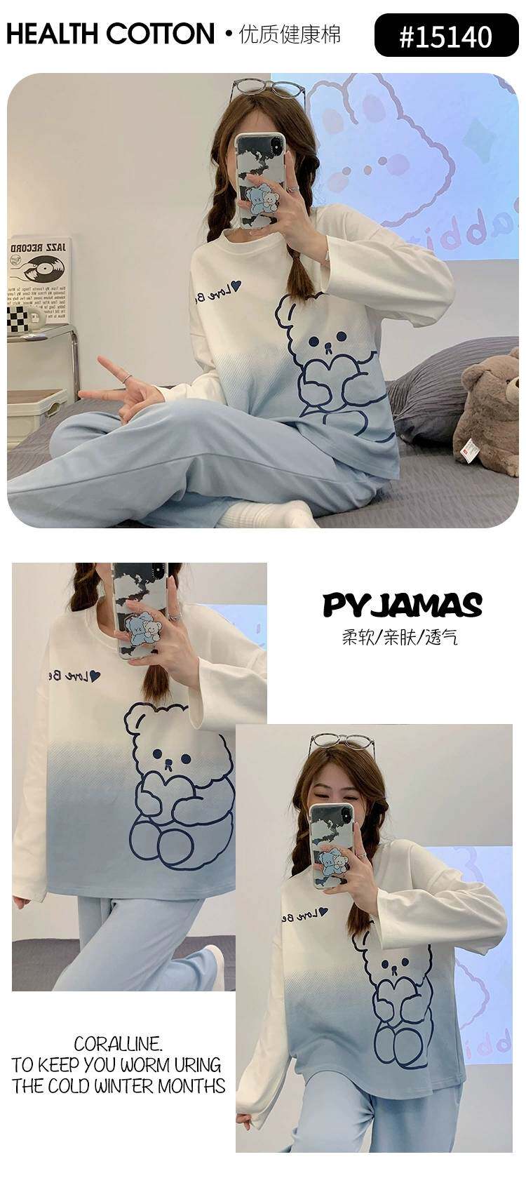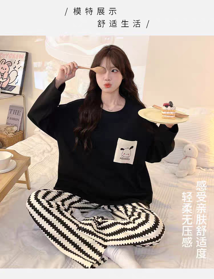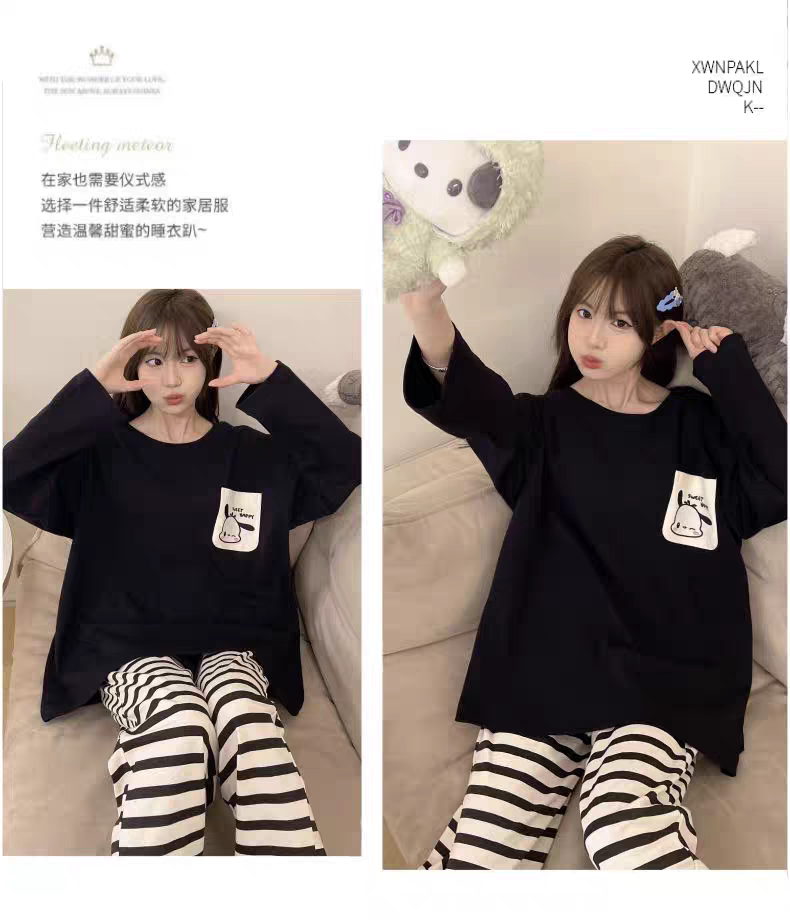 帶胸墊睡衣女春秋款純棉長袖一體防凸點條紋卡通加大碼可外穿套裝