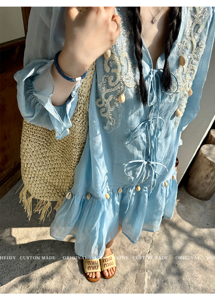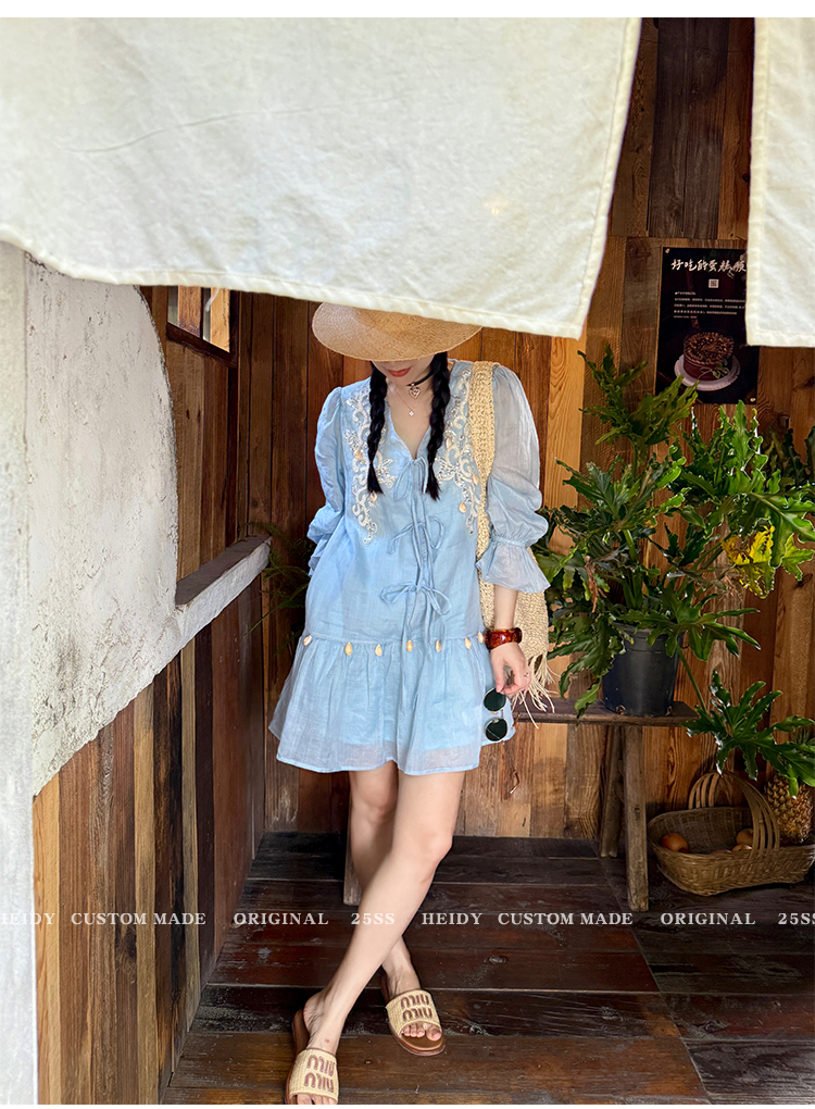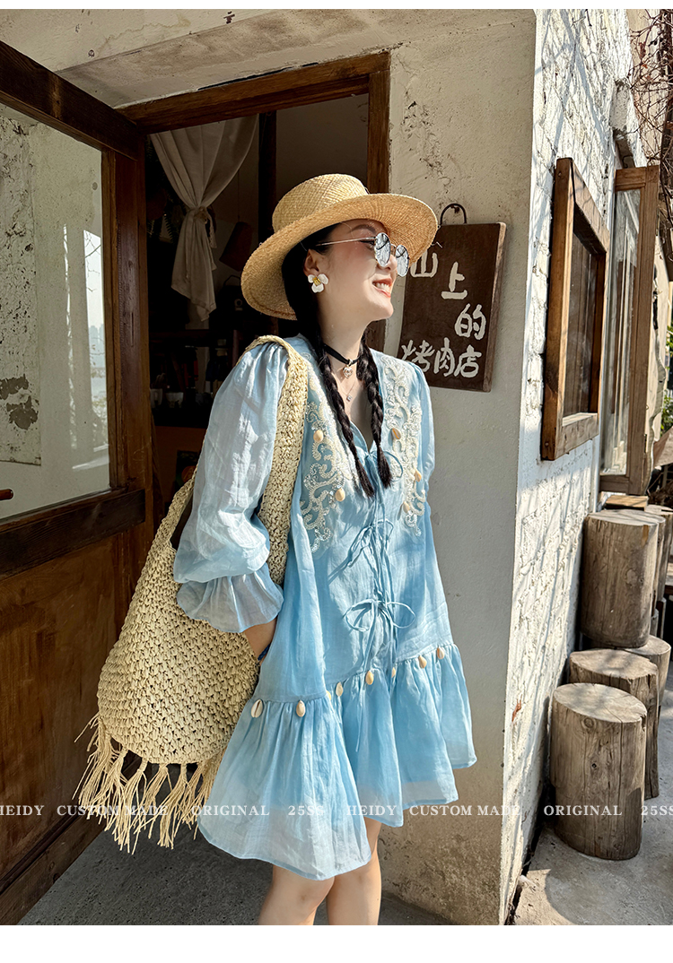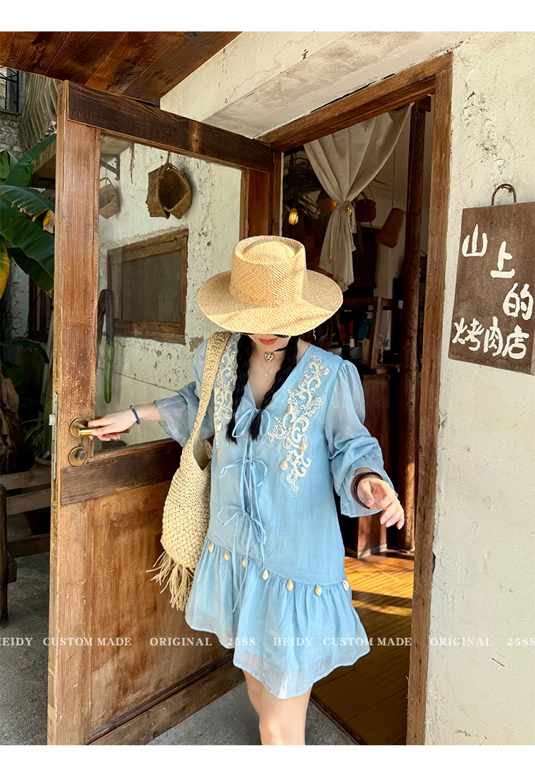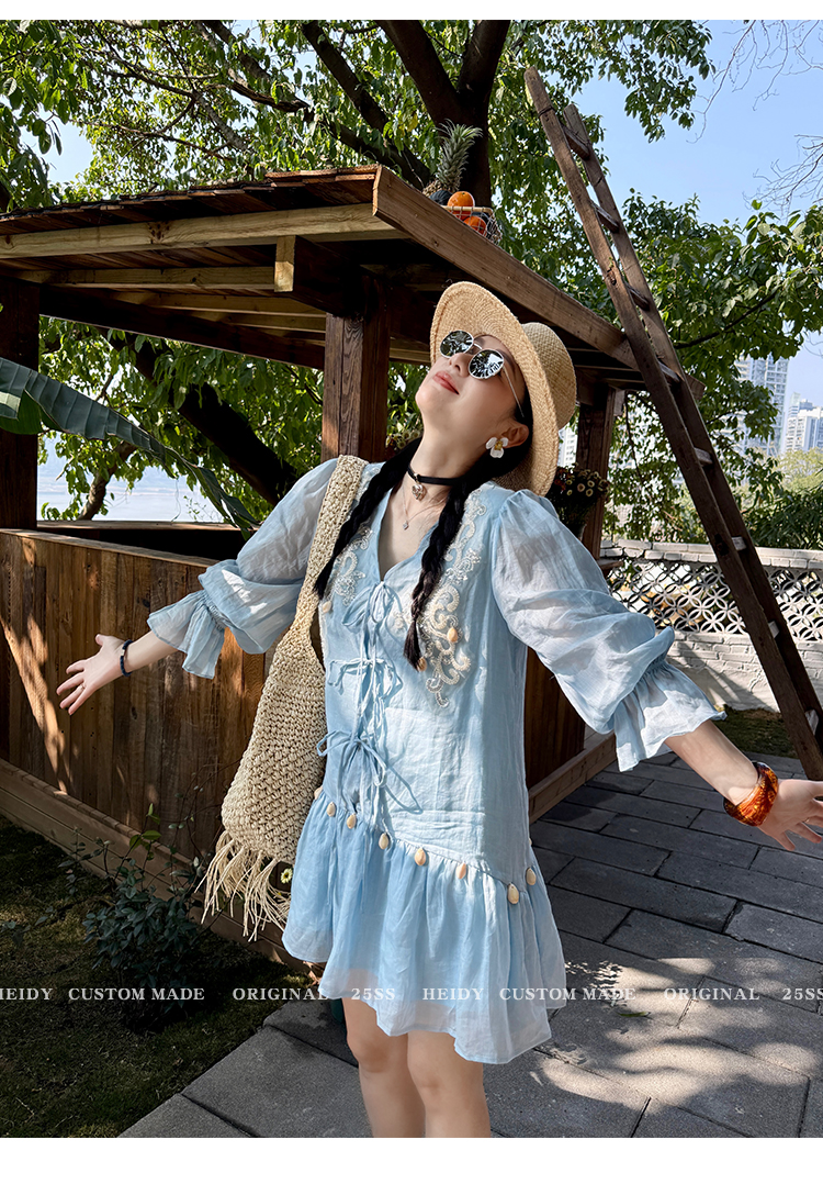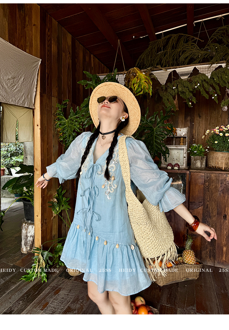 heidy海蒂 藍色海洋 串珠刺綉海螺裝飾苧麻連衣裙V領寬松娃娃裙