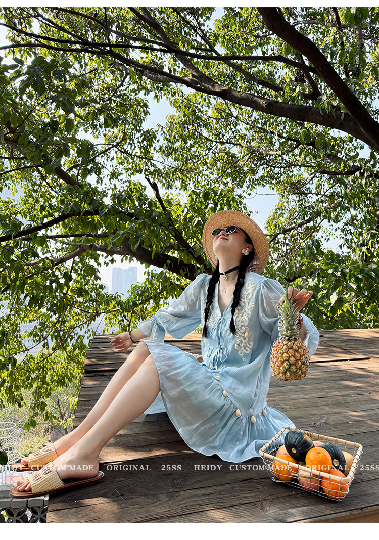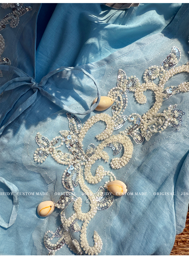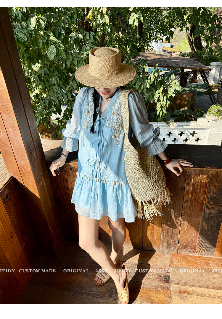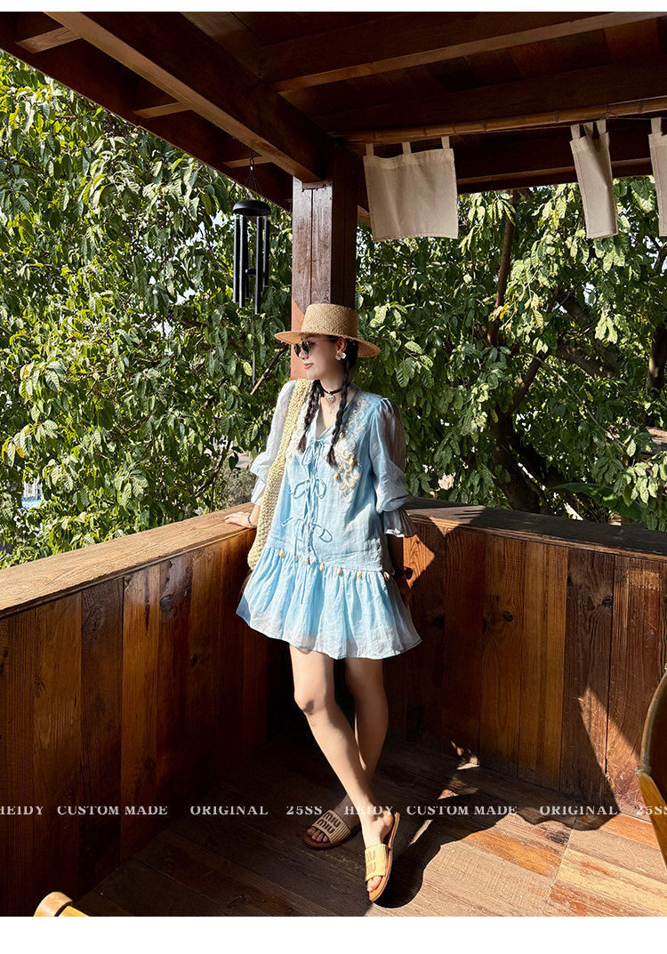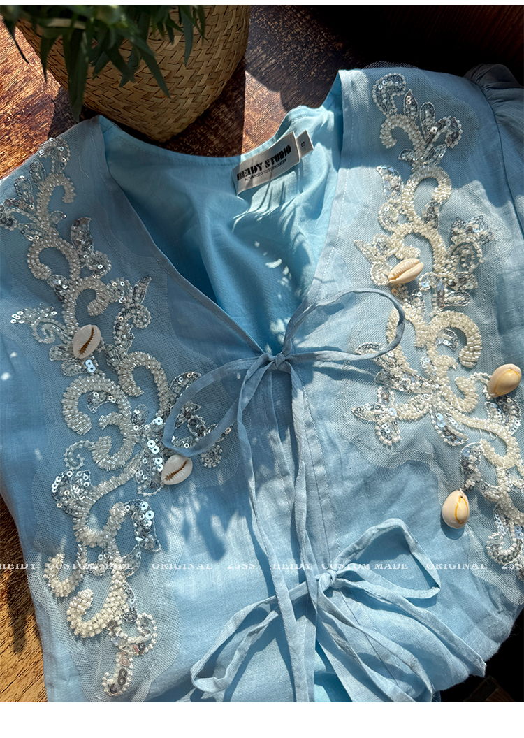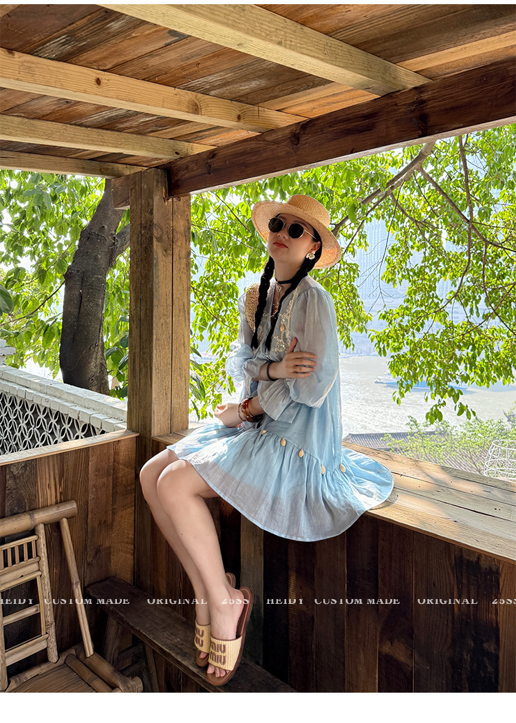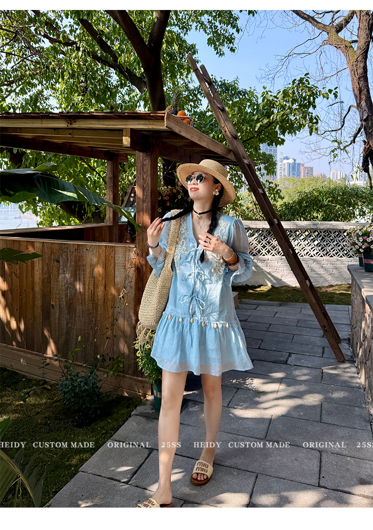 heidy海蒂 藍色海洋 串珠刺綉海螺裝飾苧麻連衣裙V領寬松娃娃裙