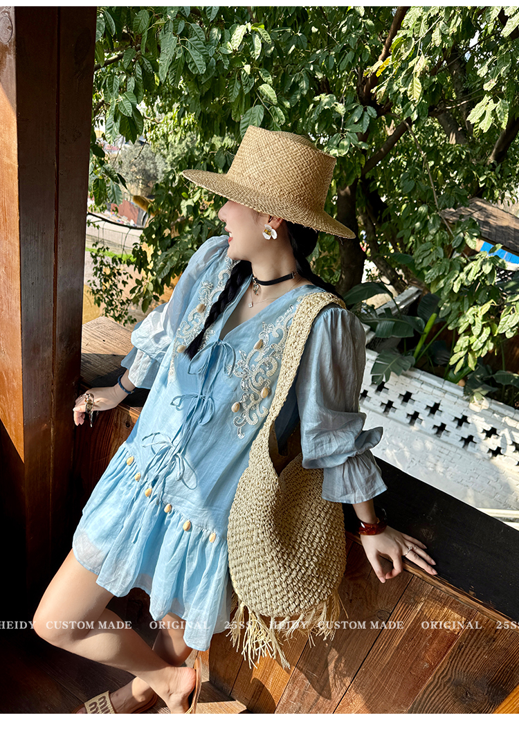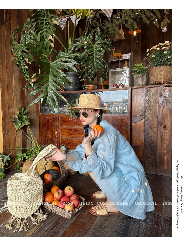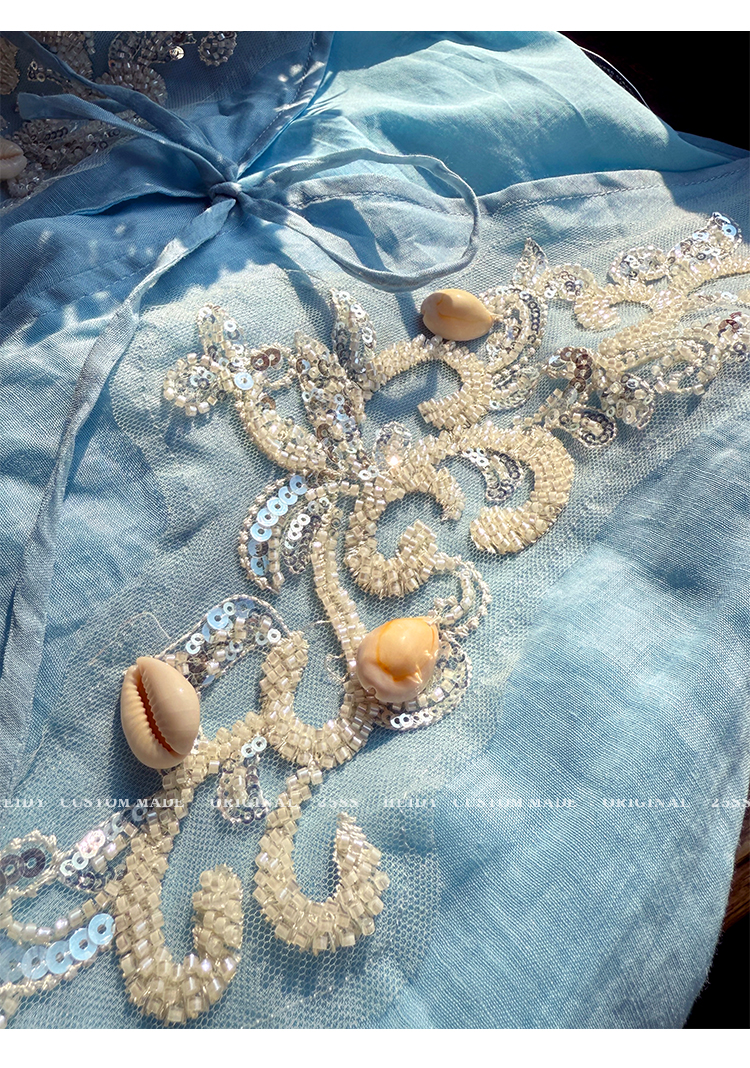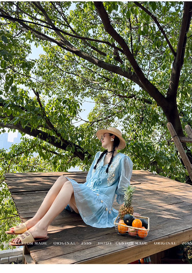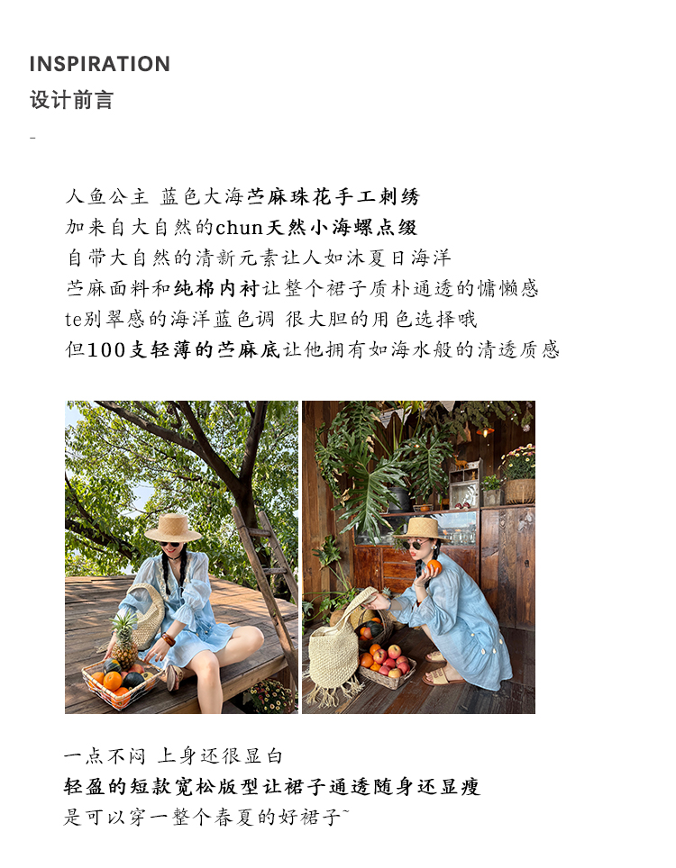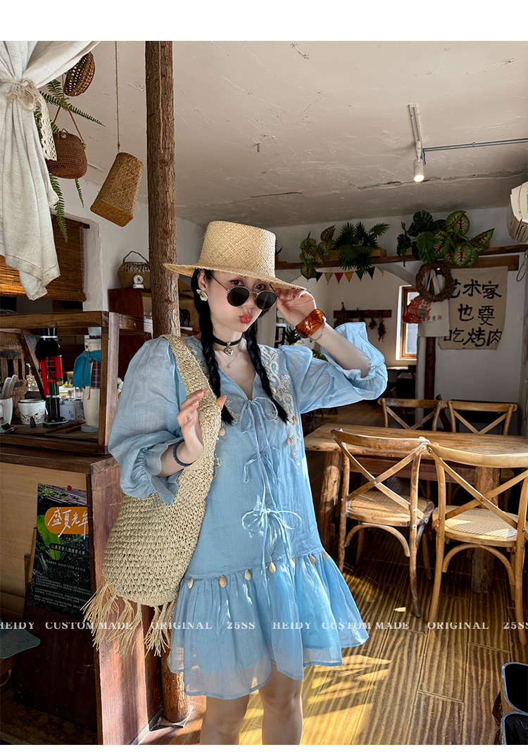 heidy海蒂 藍色海洋 串珠刺綉海螺裝飾苧麻連衣裙V領寬松娃娃裙