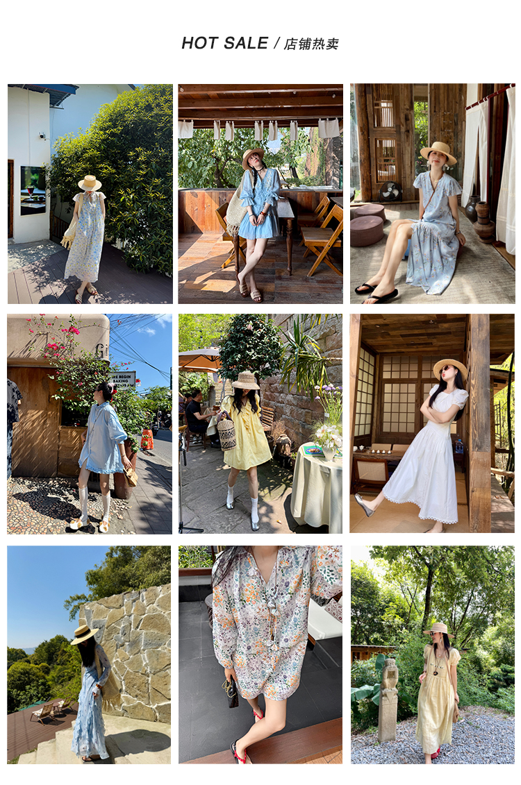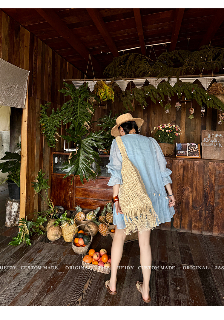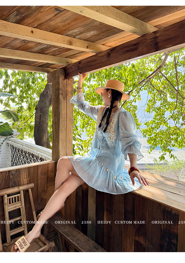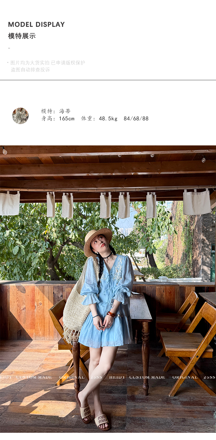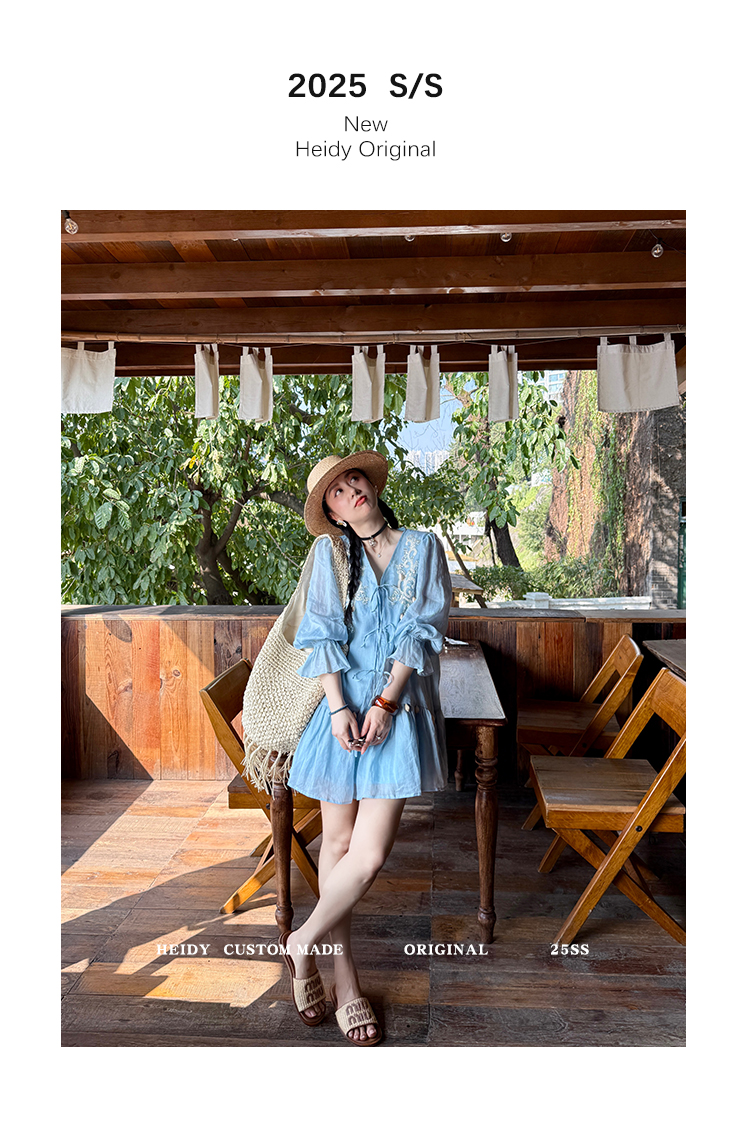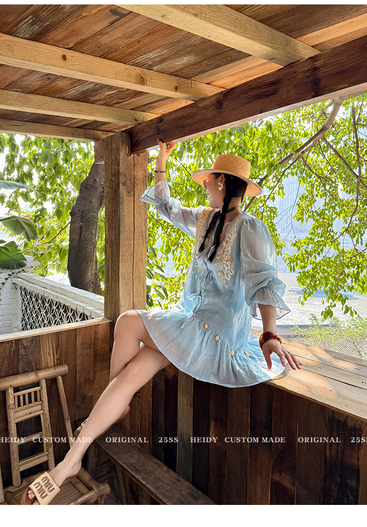heidy海蒂 藍色海洋 串珠刺綉海螺裝飾苧麻連衣裙V領寬松娃娃裙