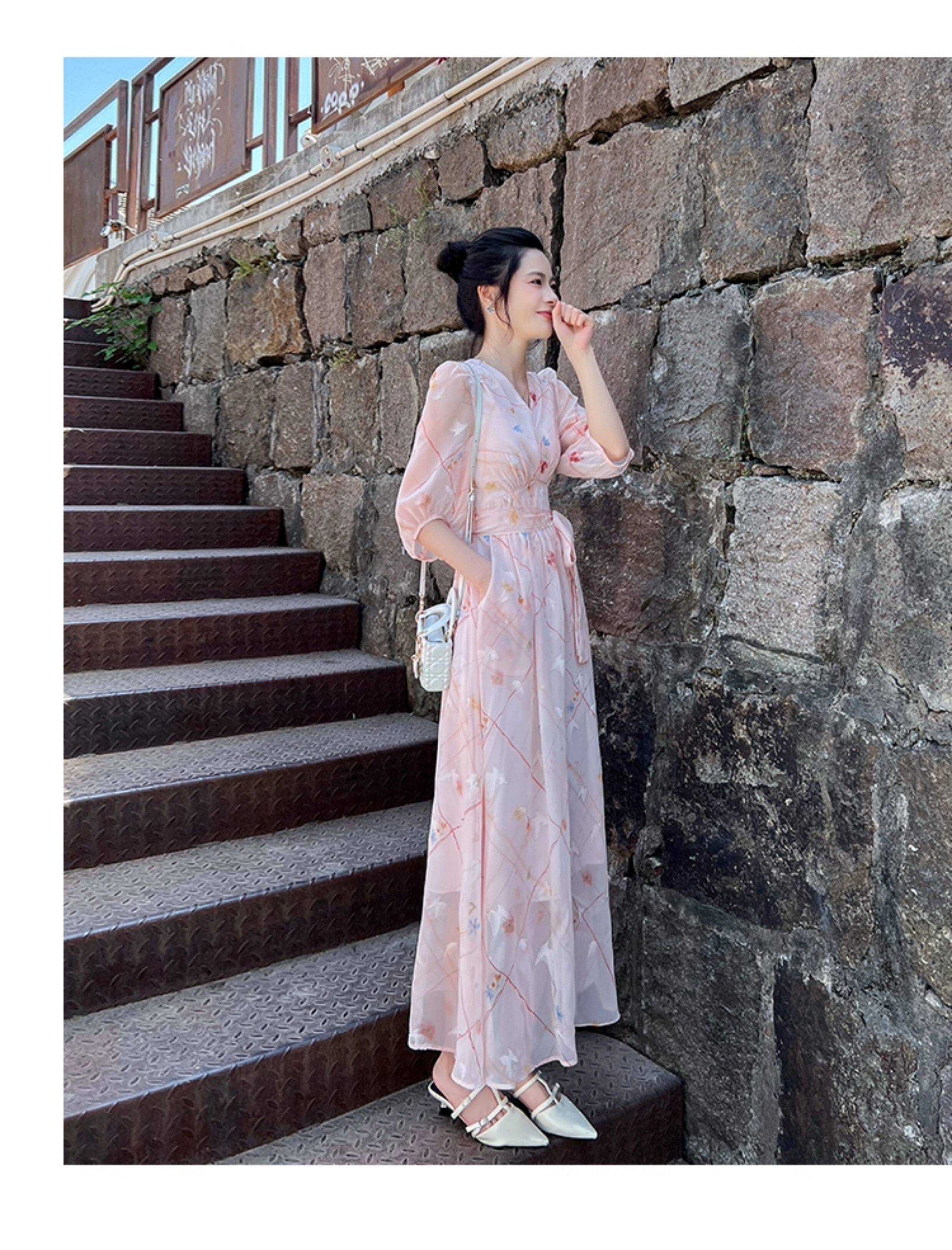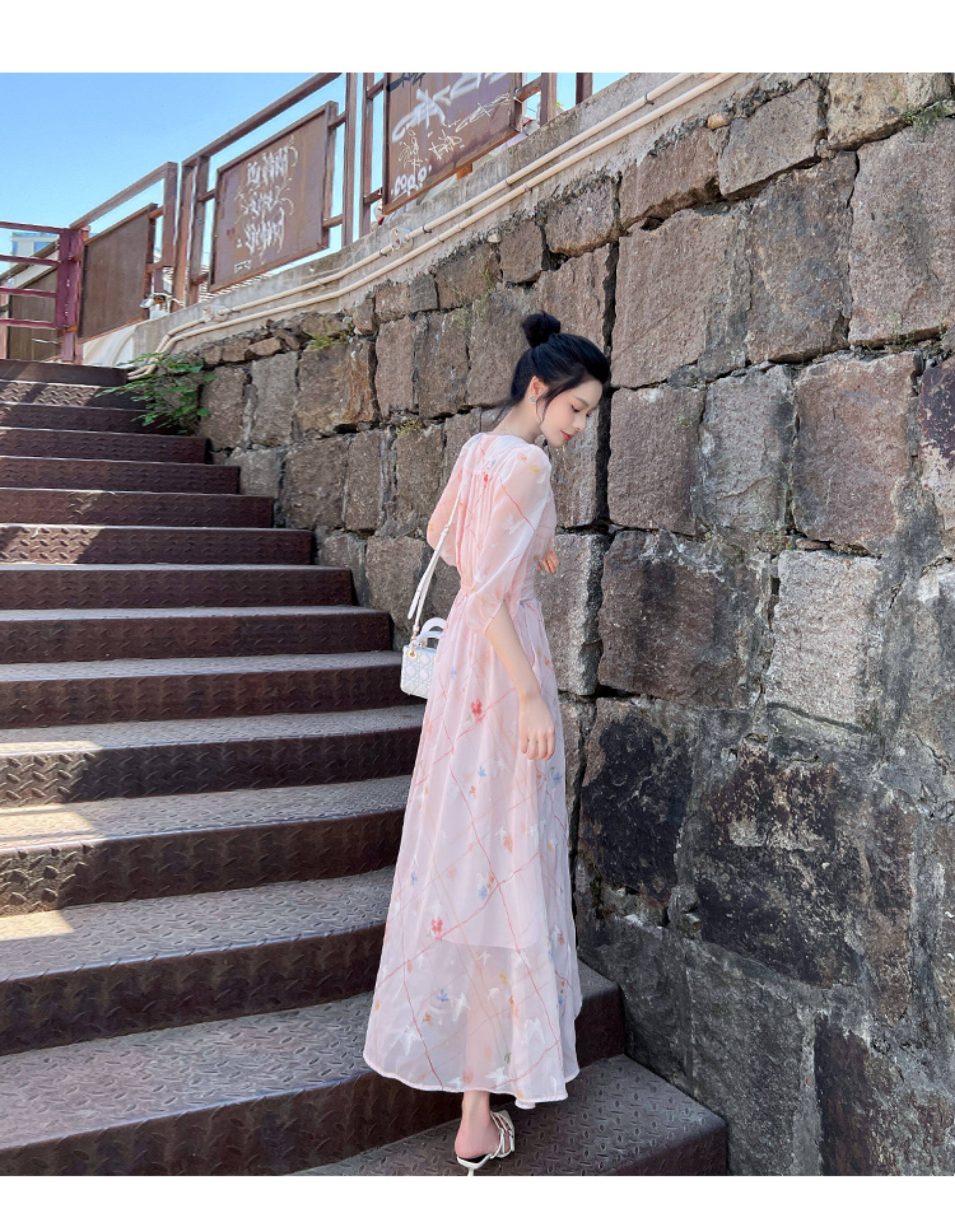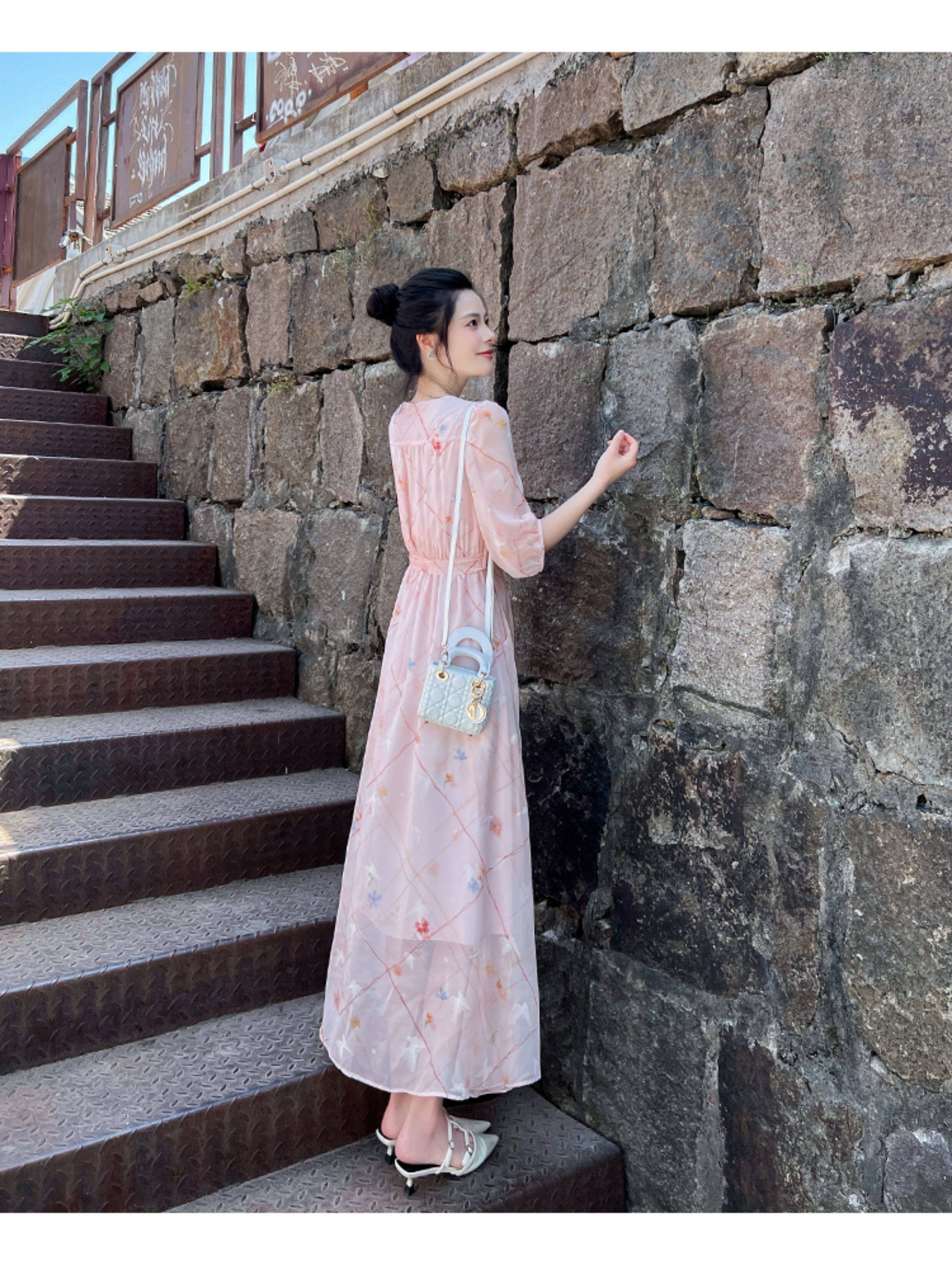 粉色碎花連衣裙女2026夏季新款小衆設計感氣質收腰顯瘦長裙大裙擺