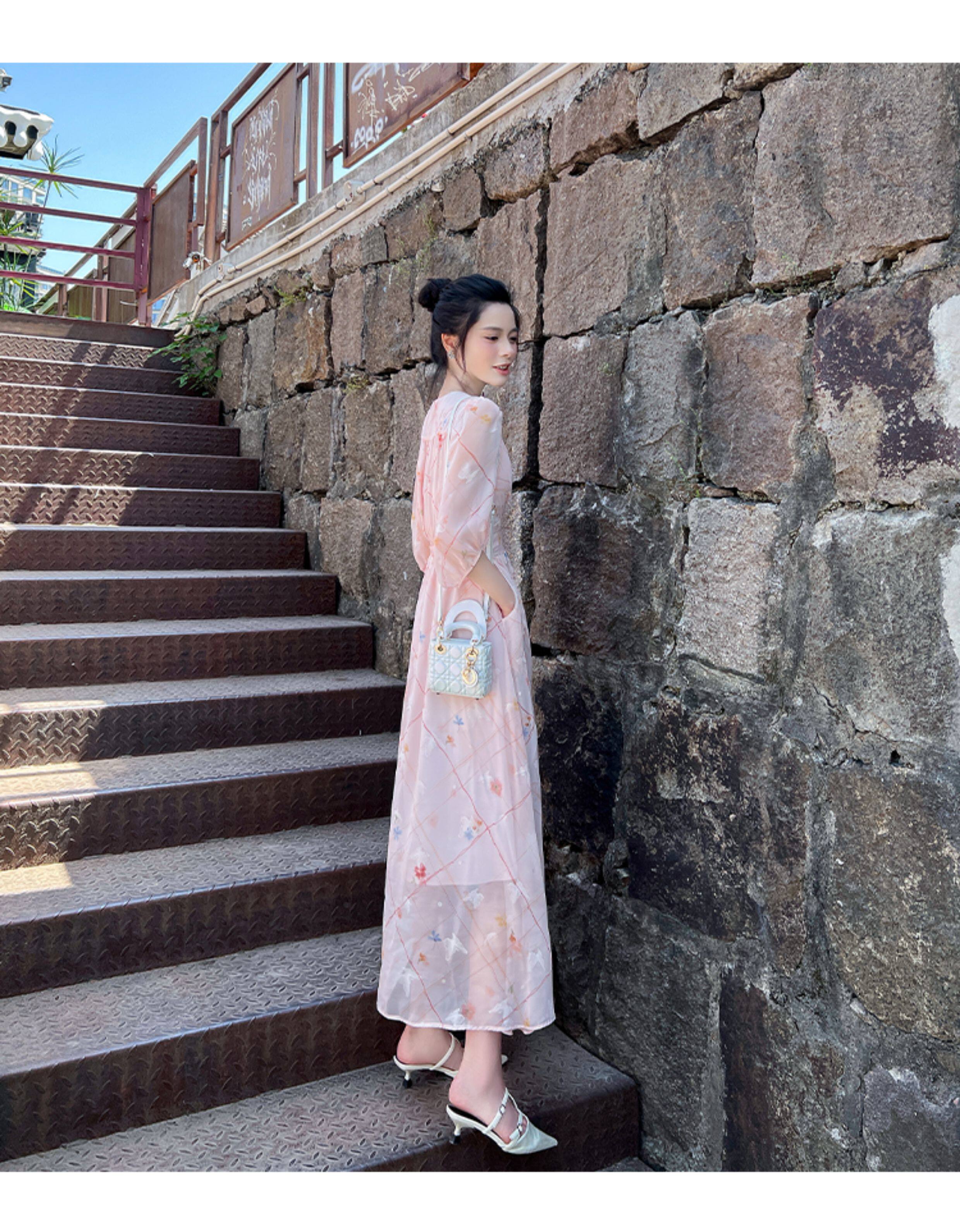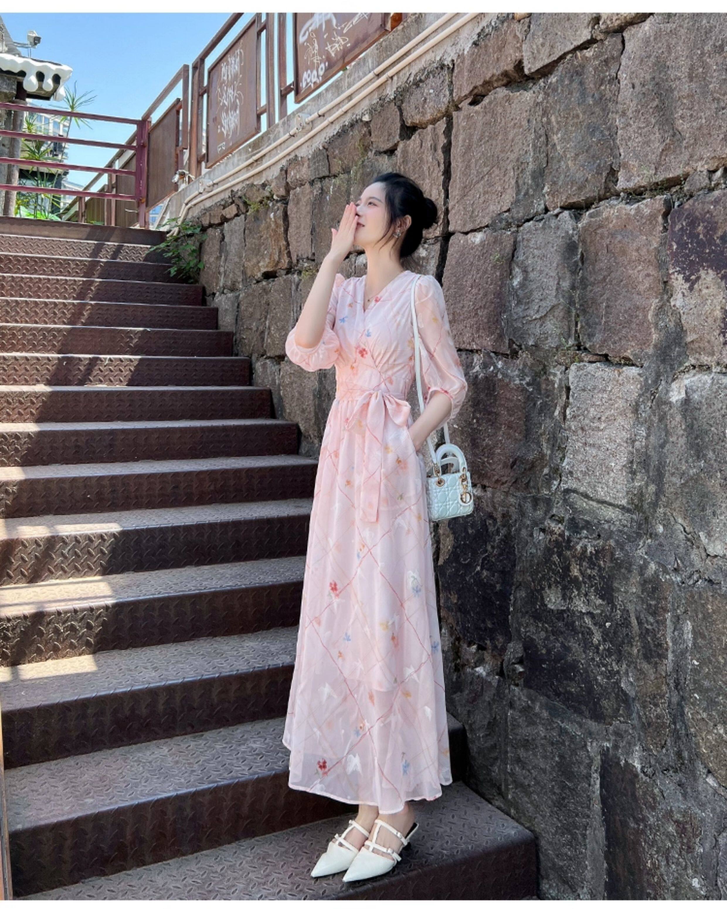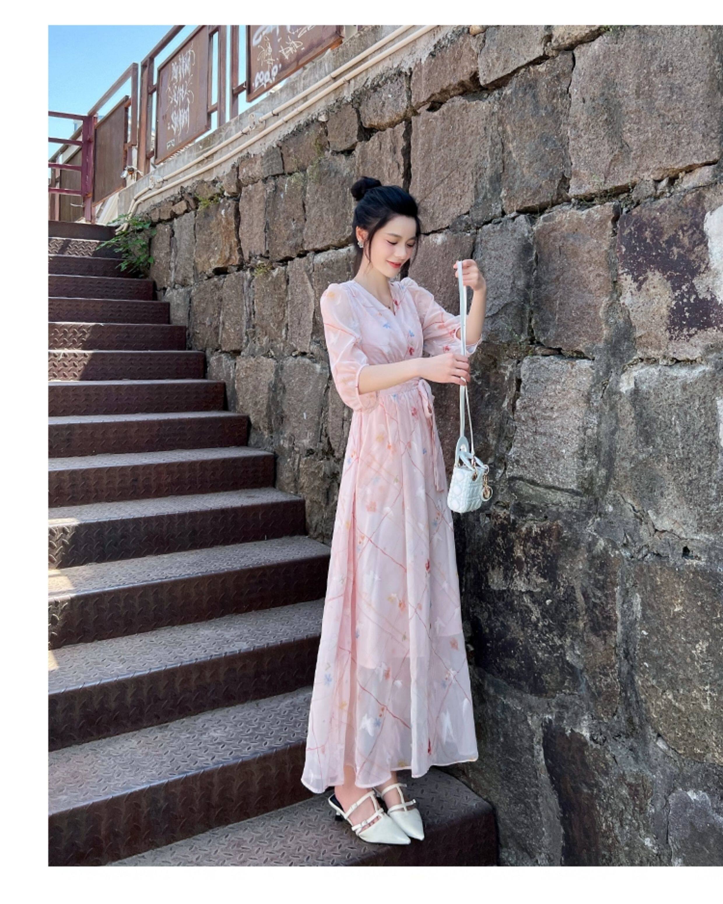 粉色碎花連衣裙女2026夏季新款小衆設計感氣質收腰顯瘦長裙大裙擺