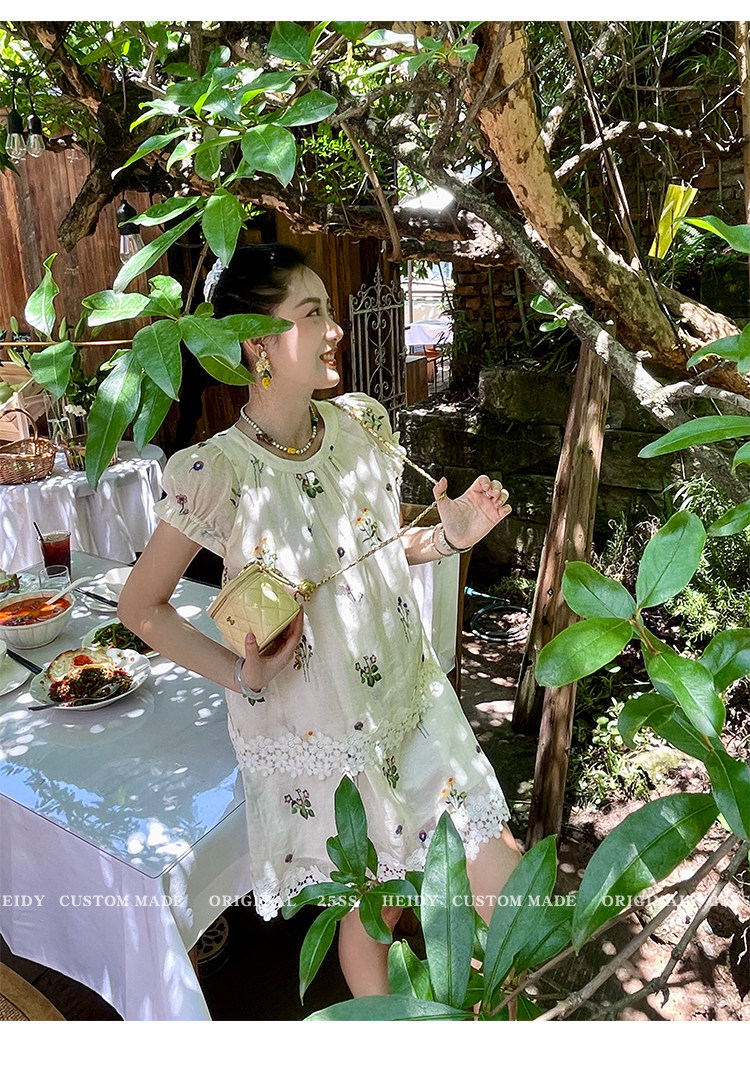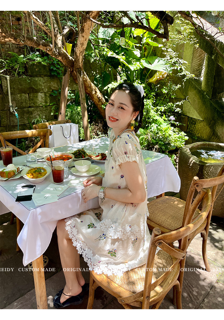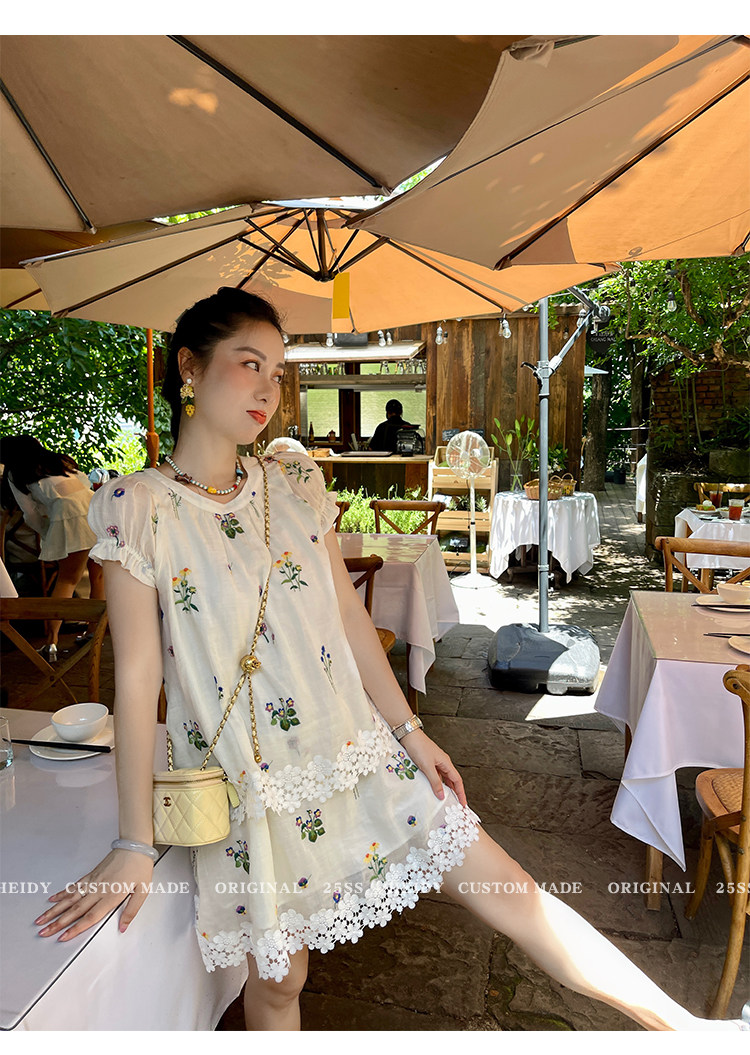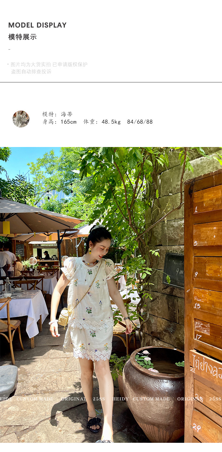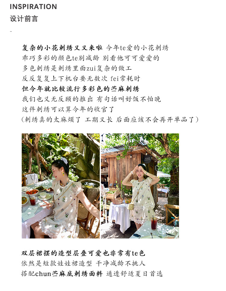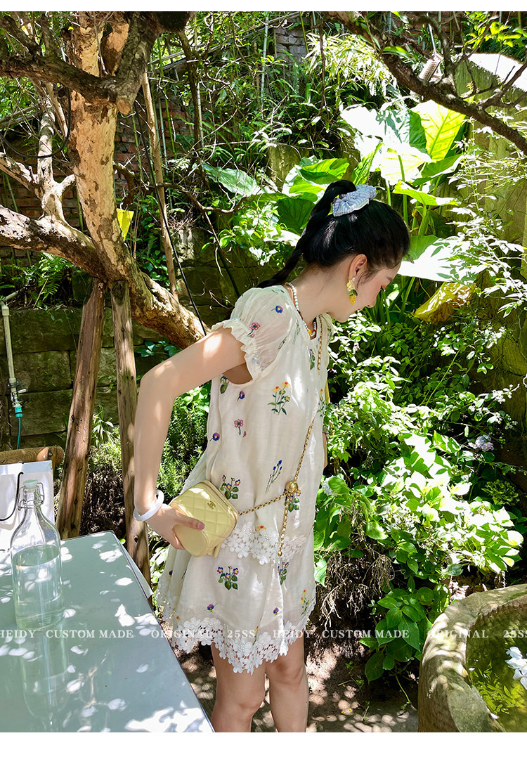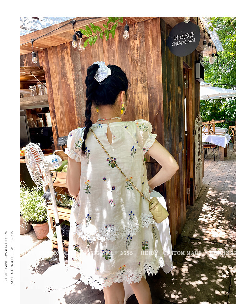 heidy海蒂 100苧麻10000針多色刺綉假兩件雙層連衣裙夏季娃娃裙