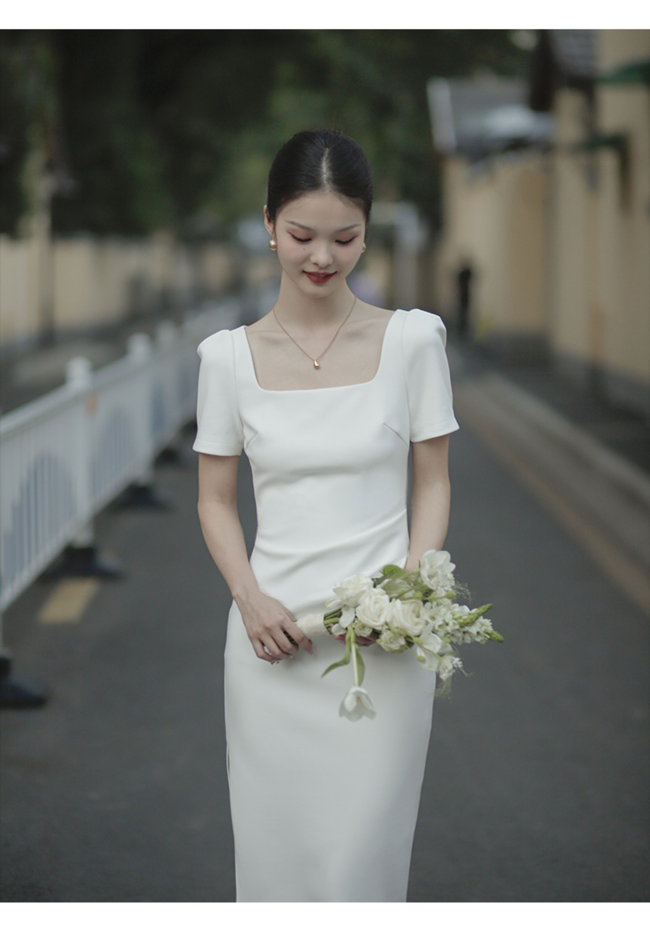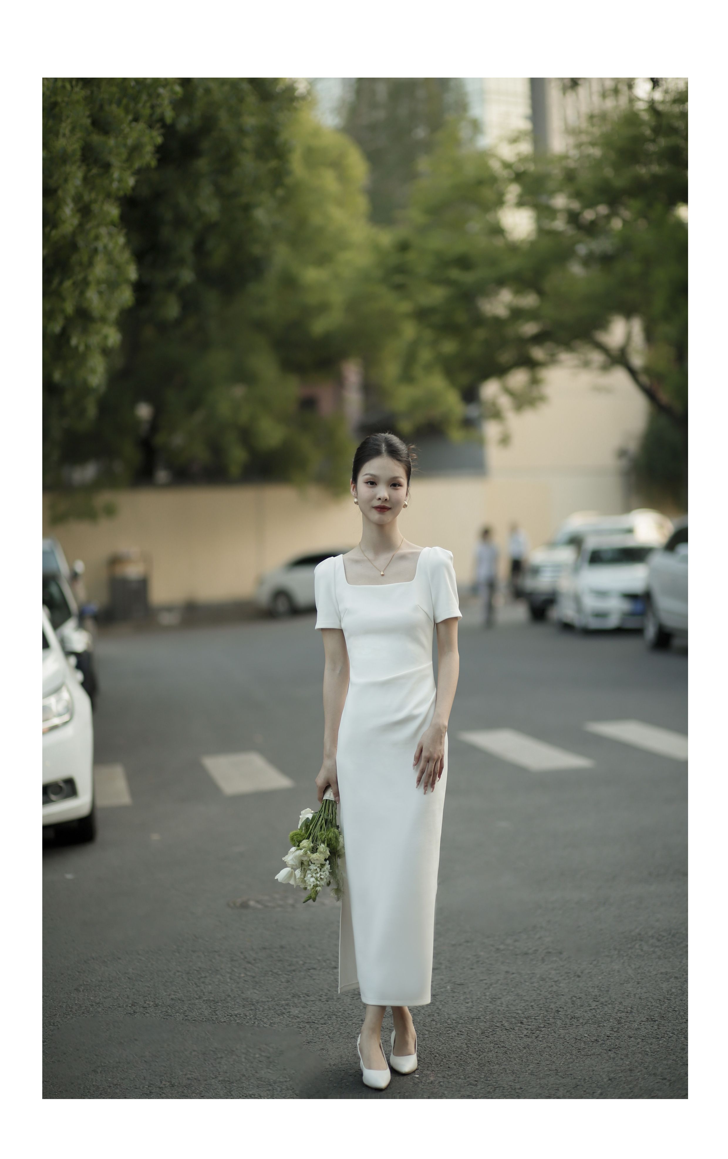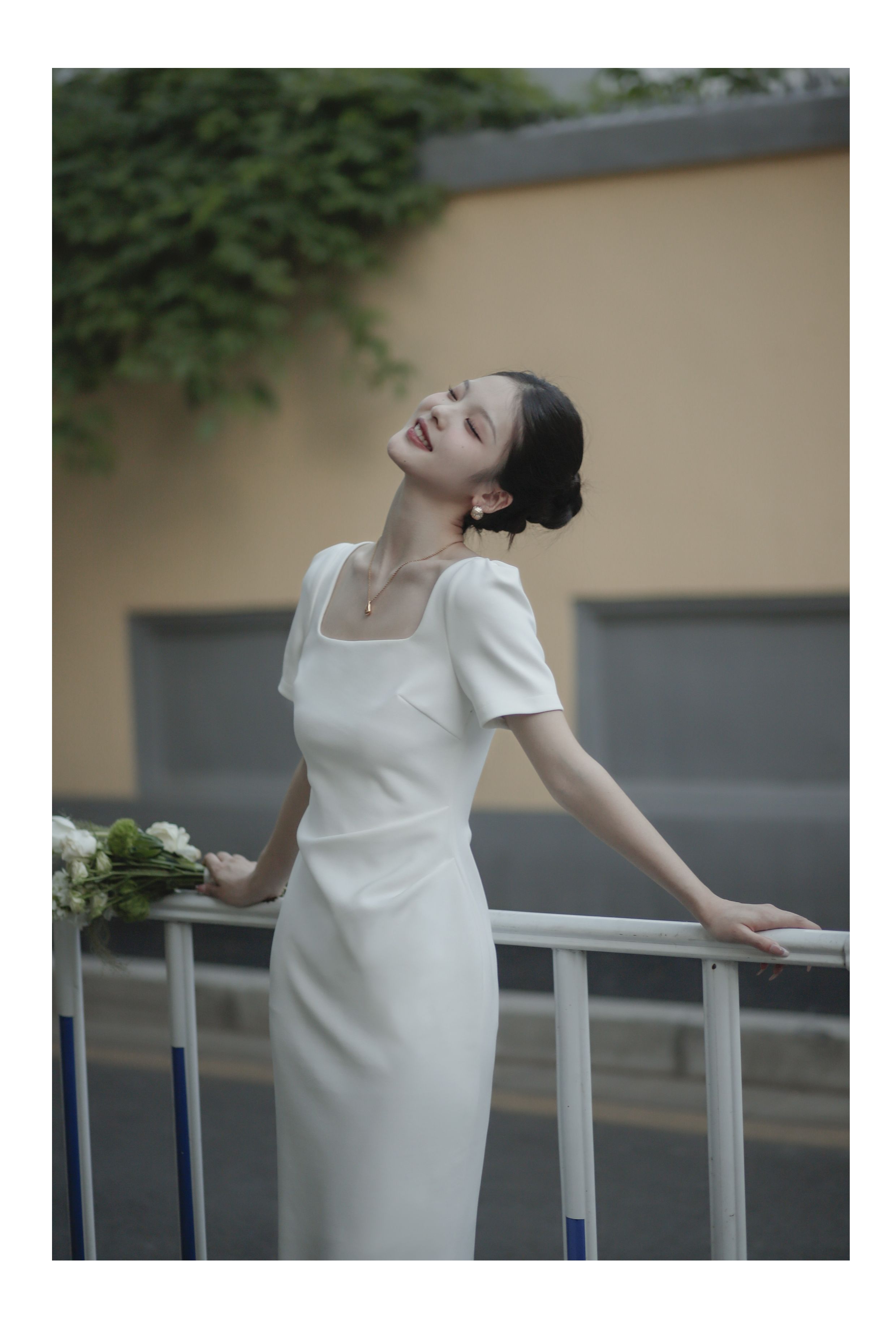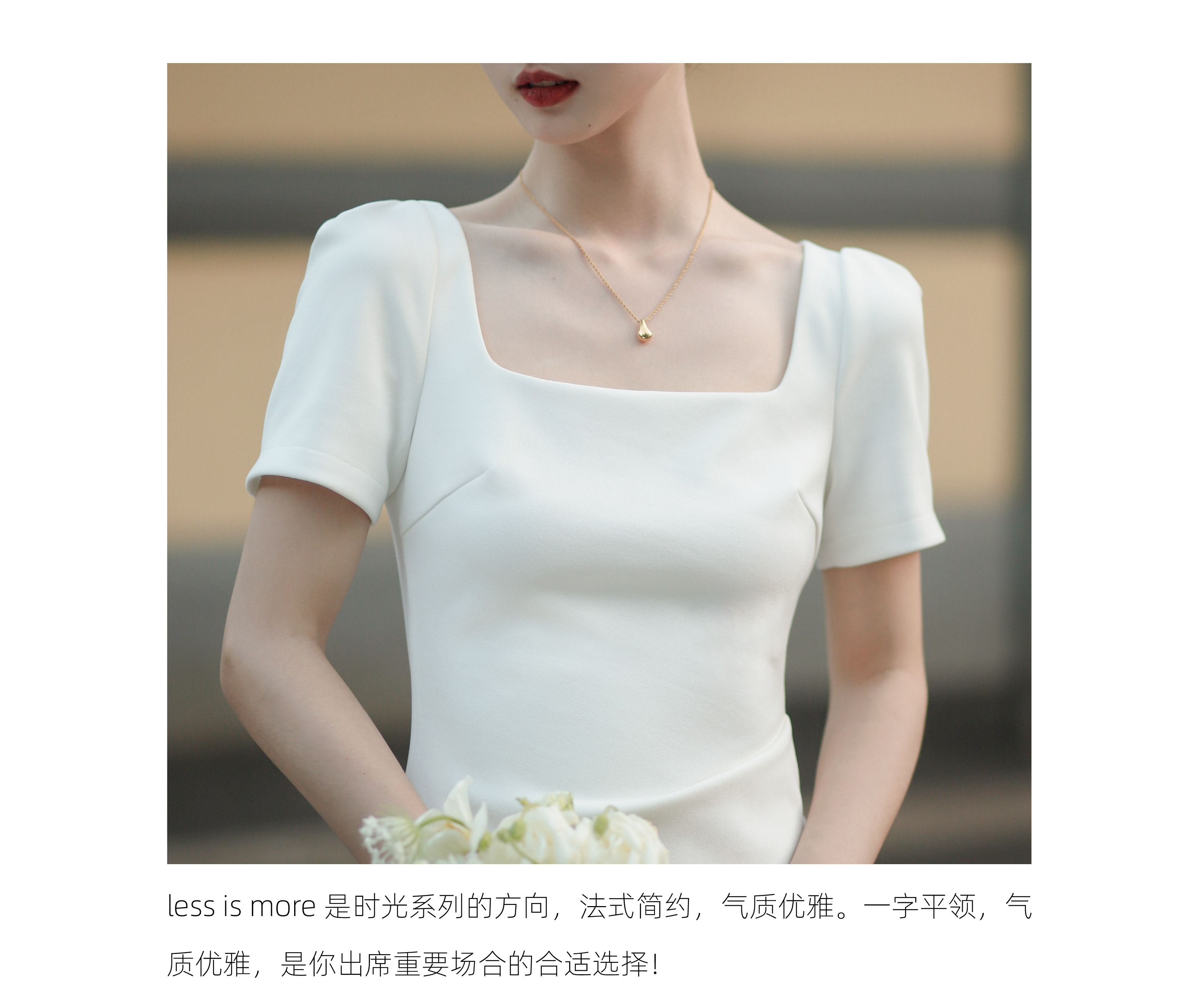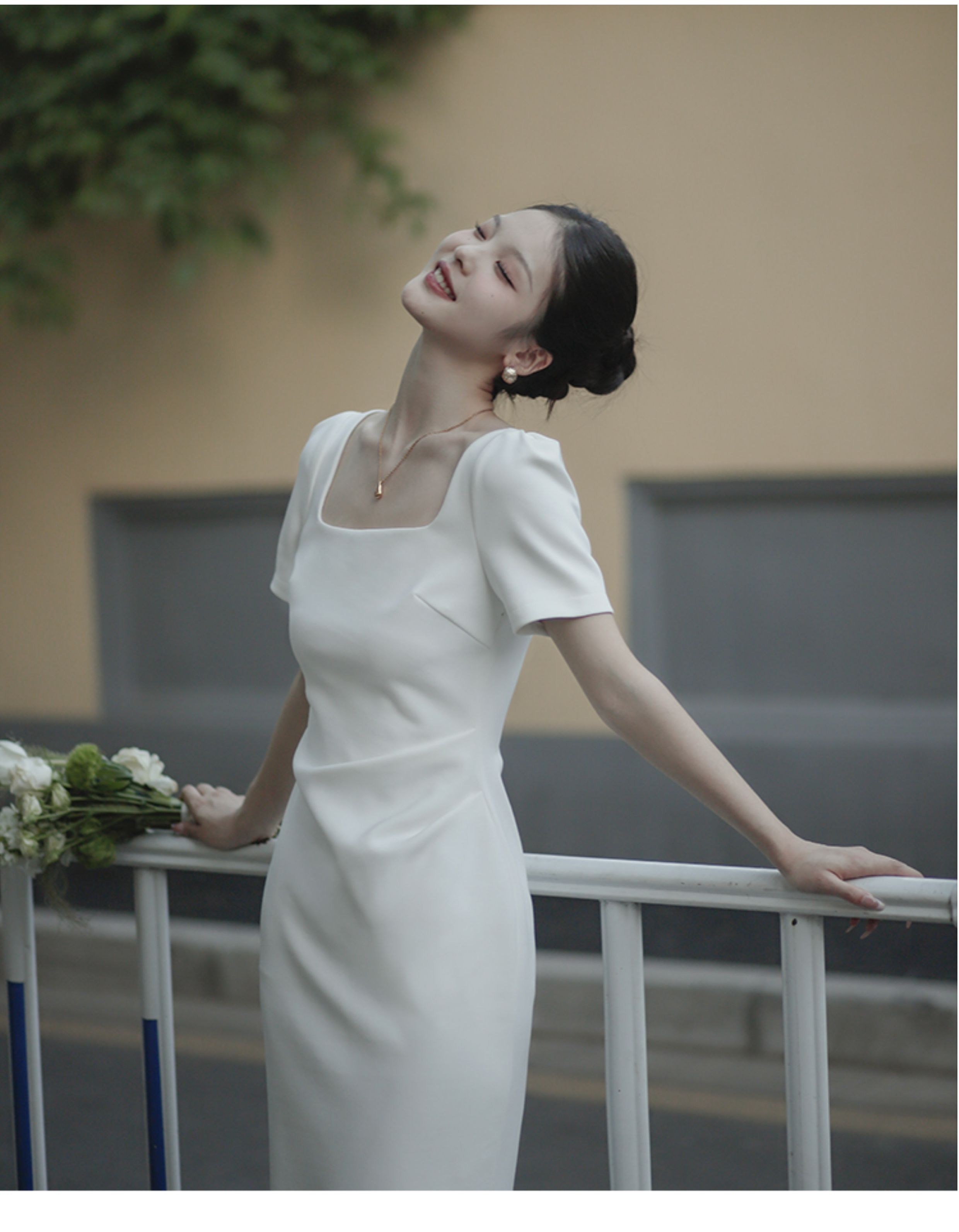 白月|拜托鹿先生法式方領短袖修身彈力長款領証訂婚小禮服連衣裙