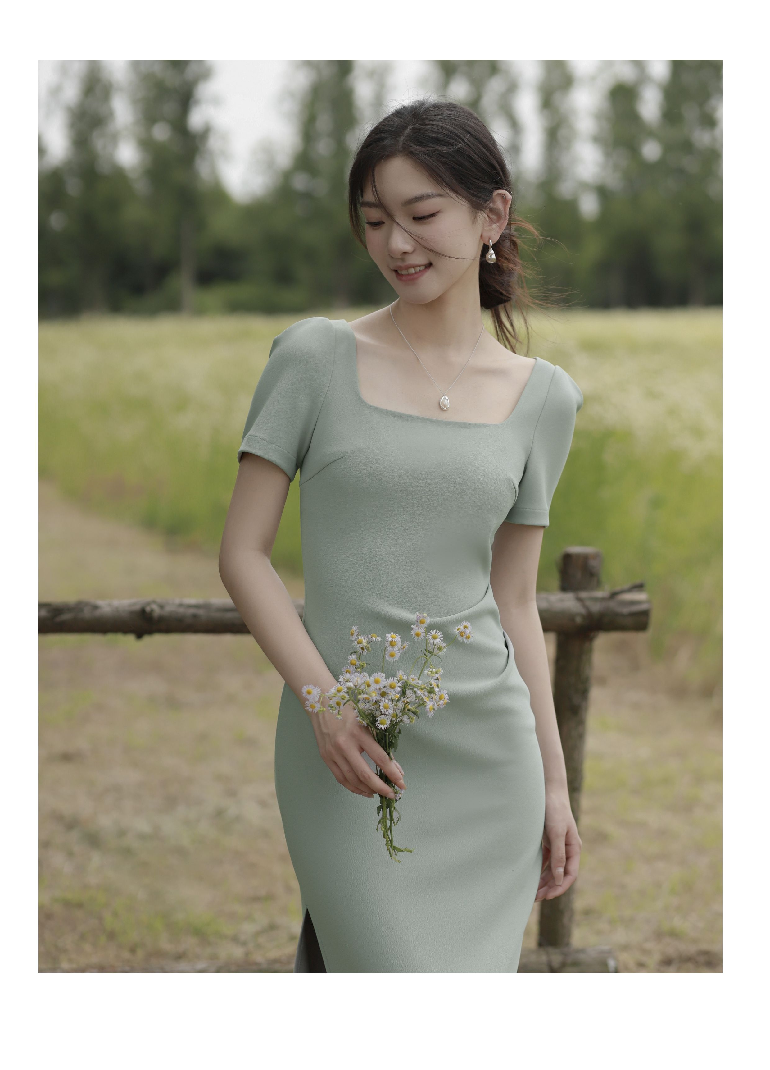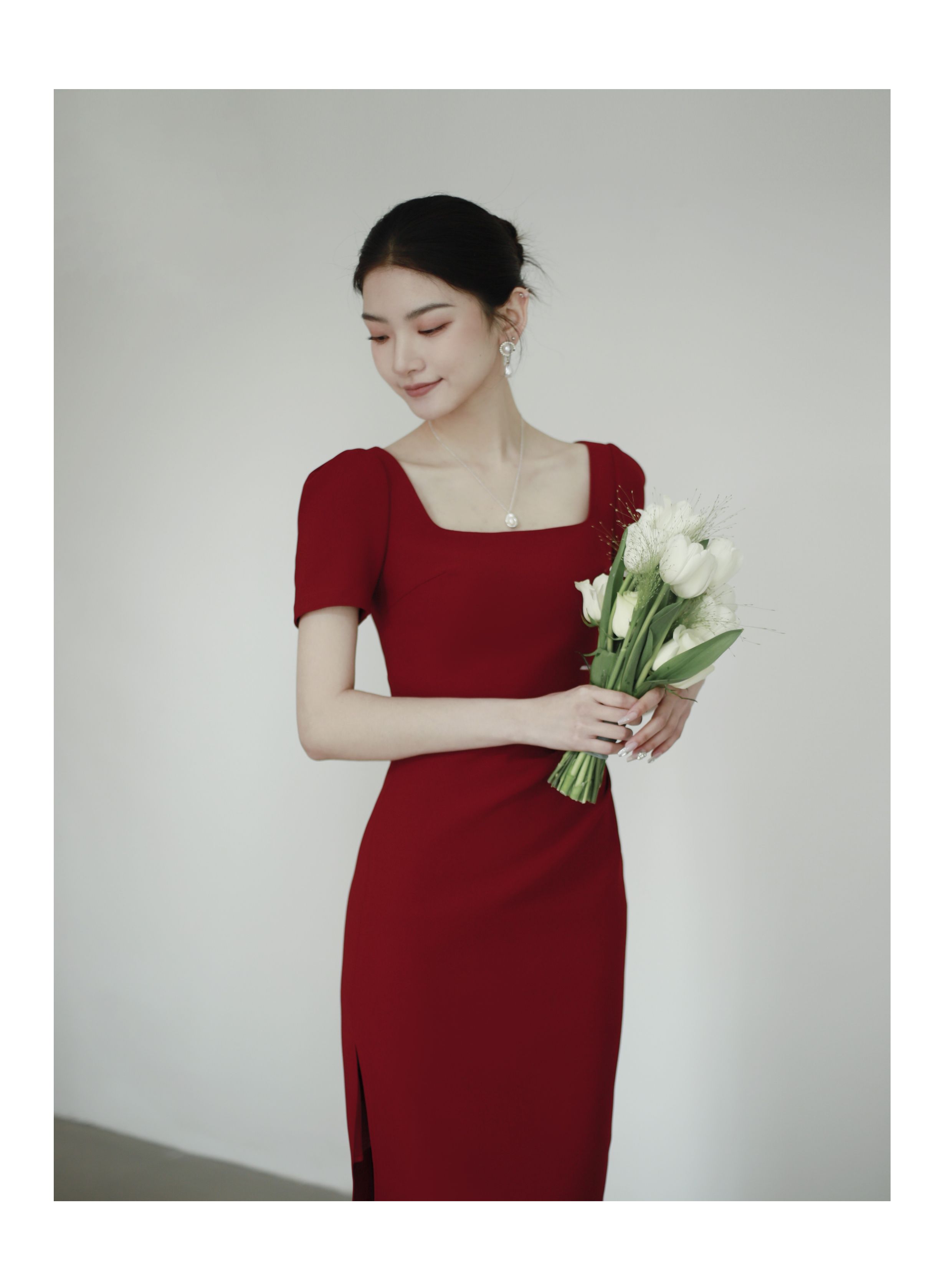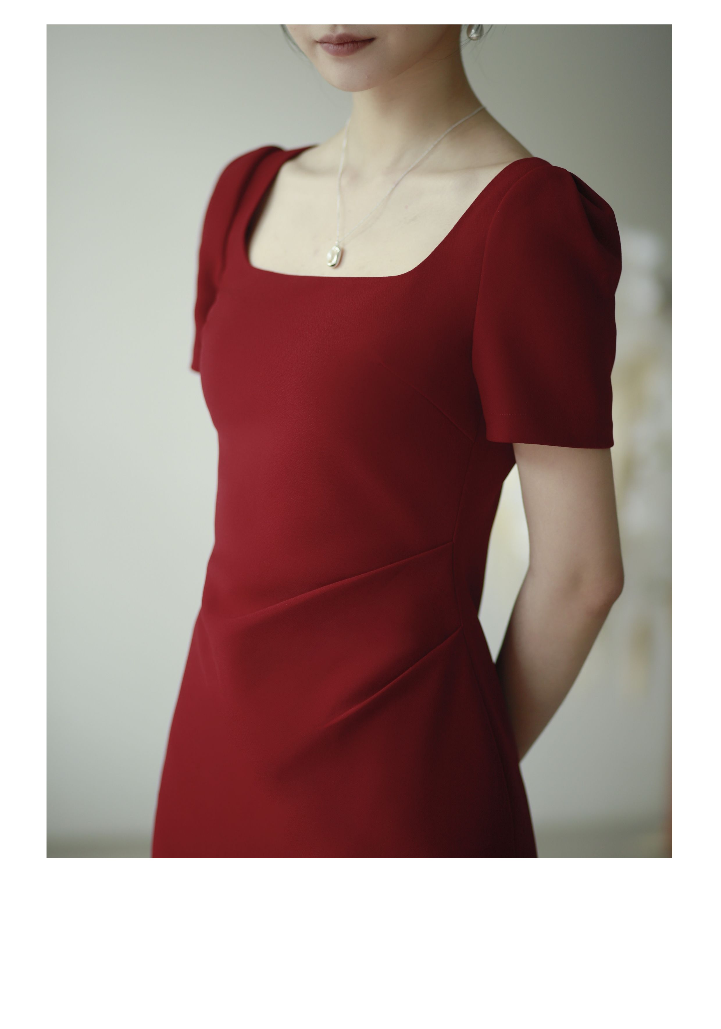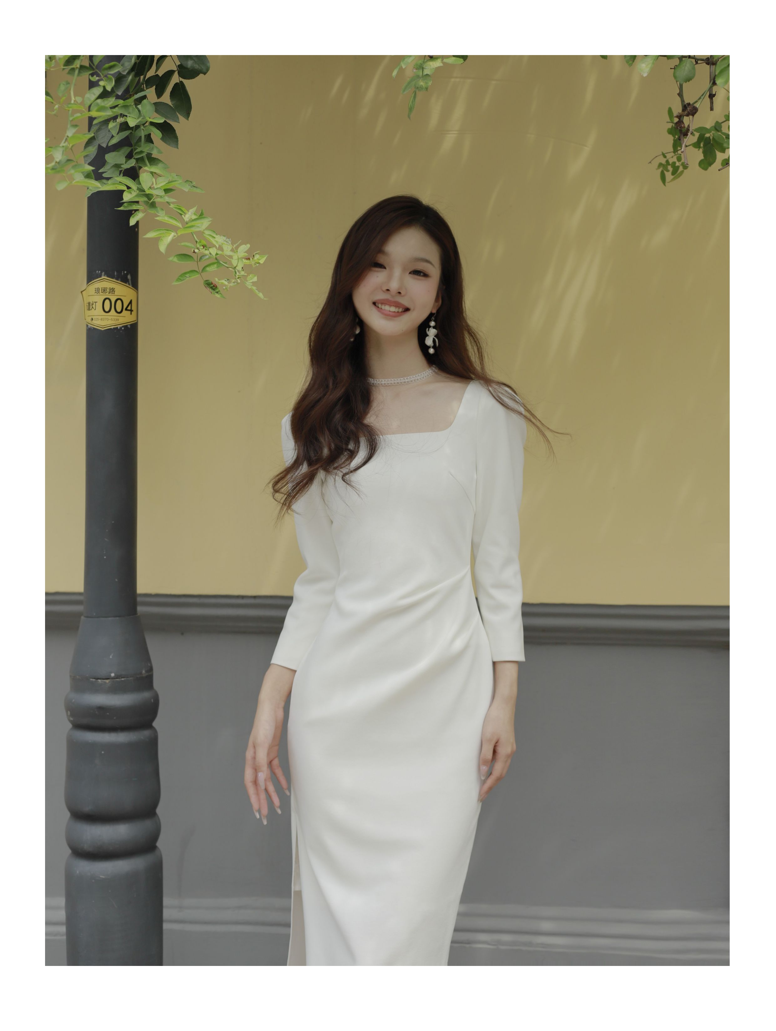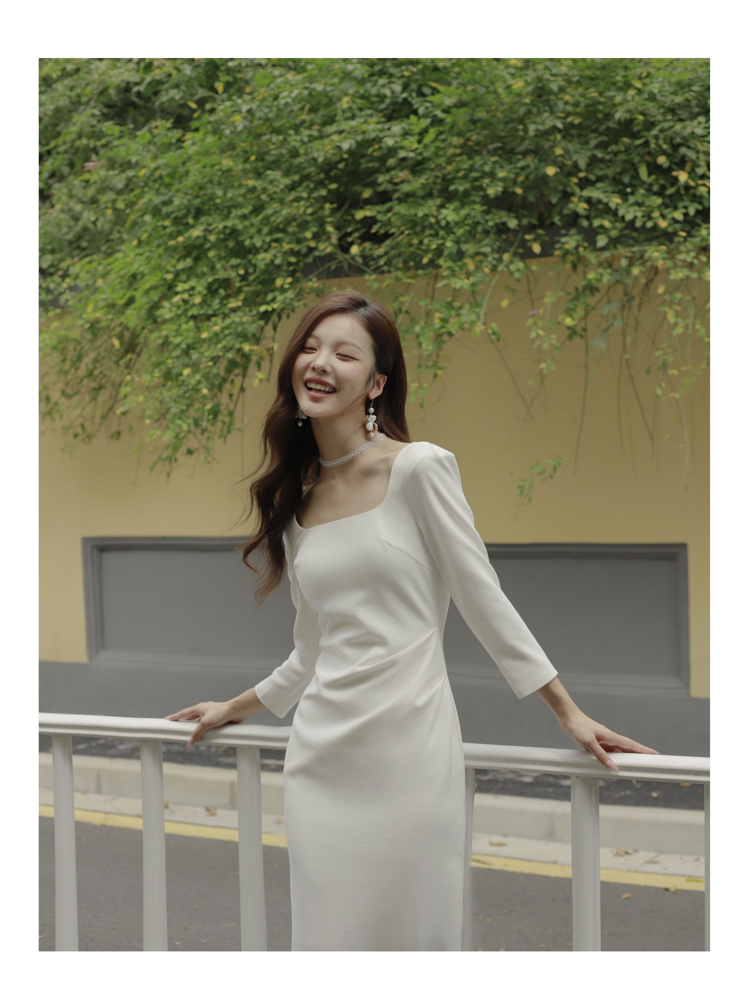 白月|拜托鹿先生法式方領短袖修身彈力長款領証訂婚小禮服連衣裙
