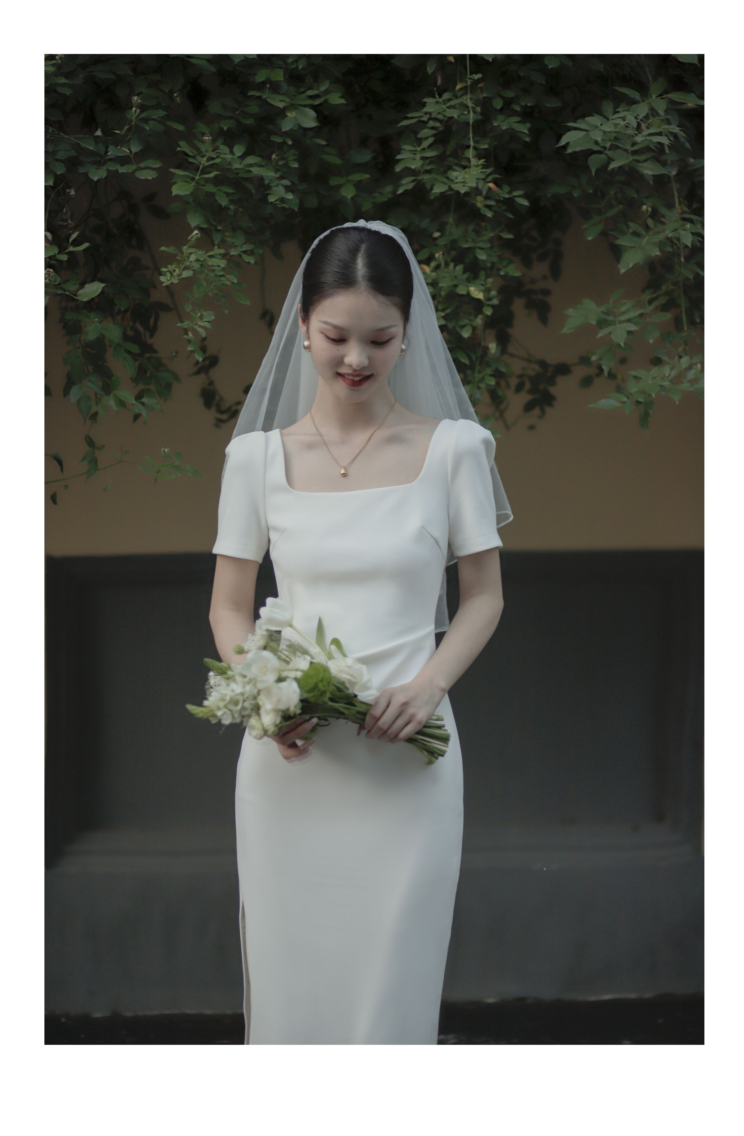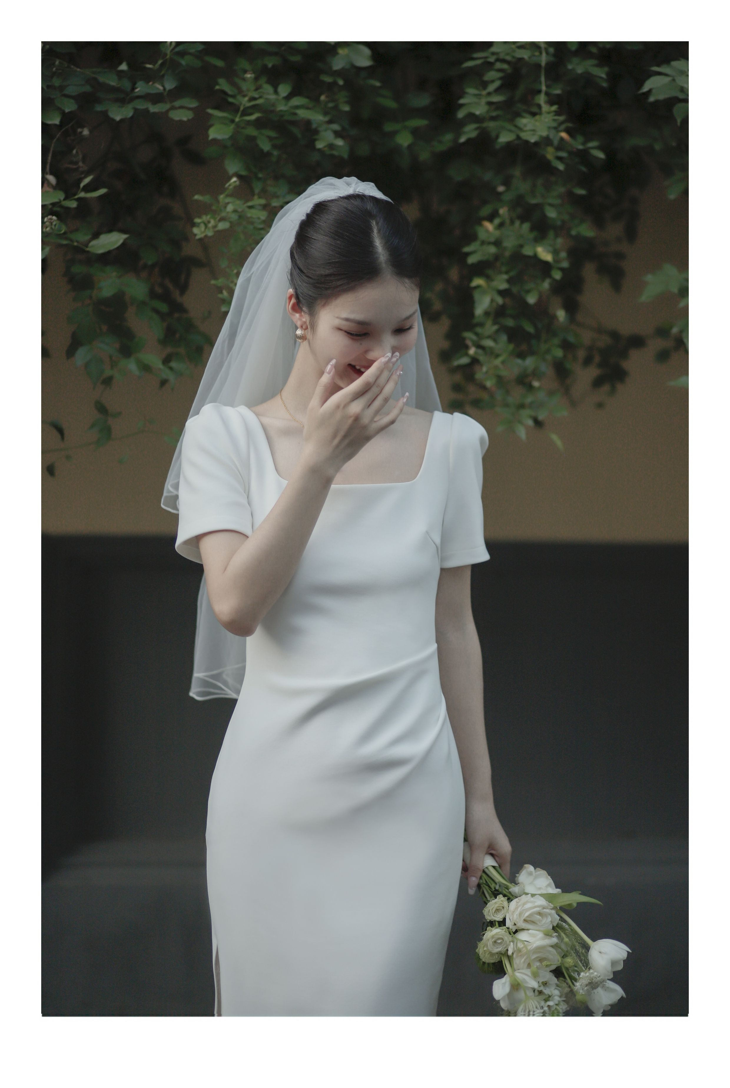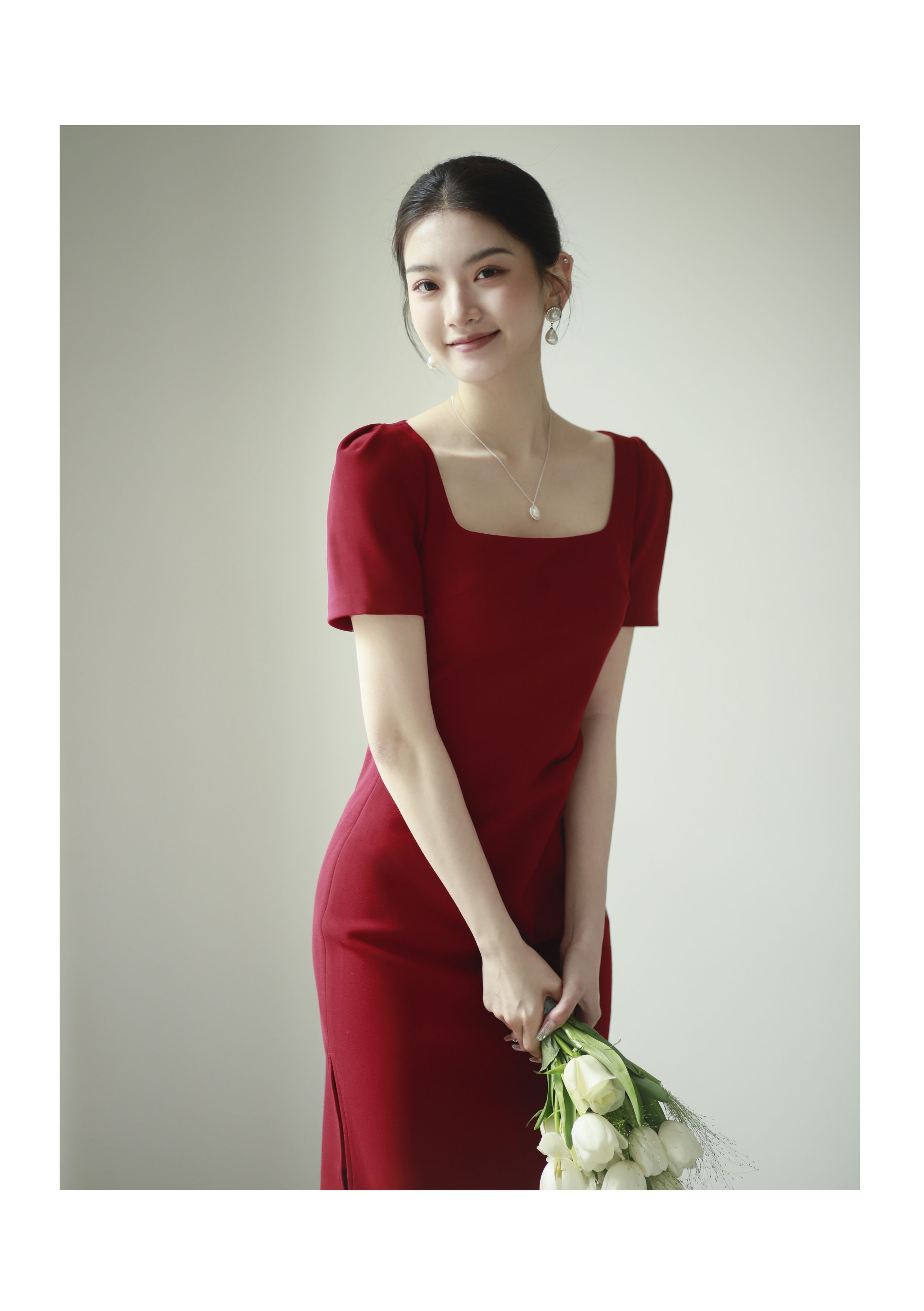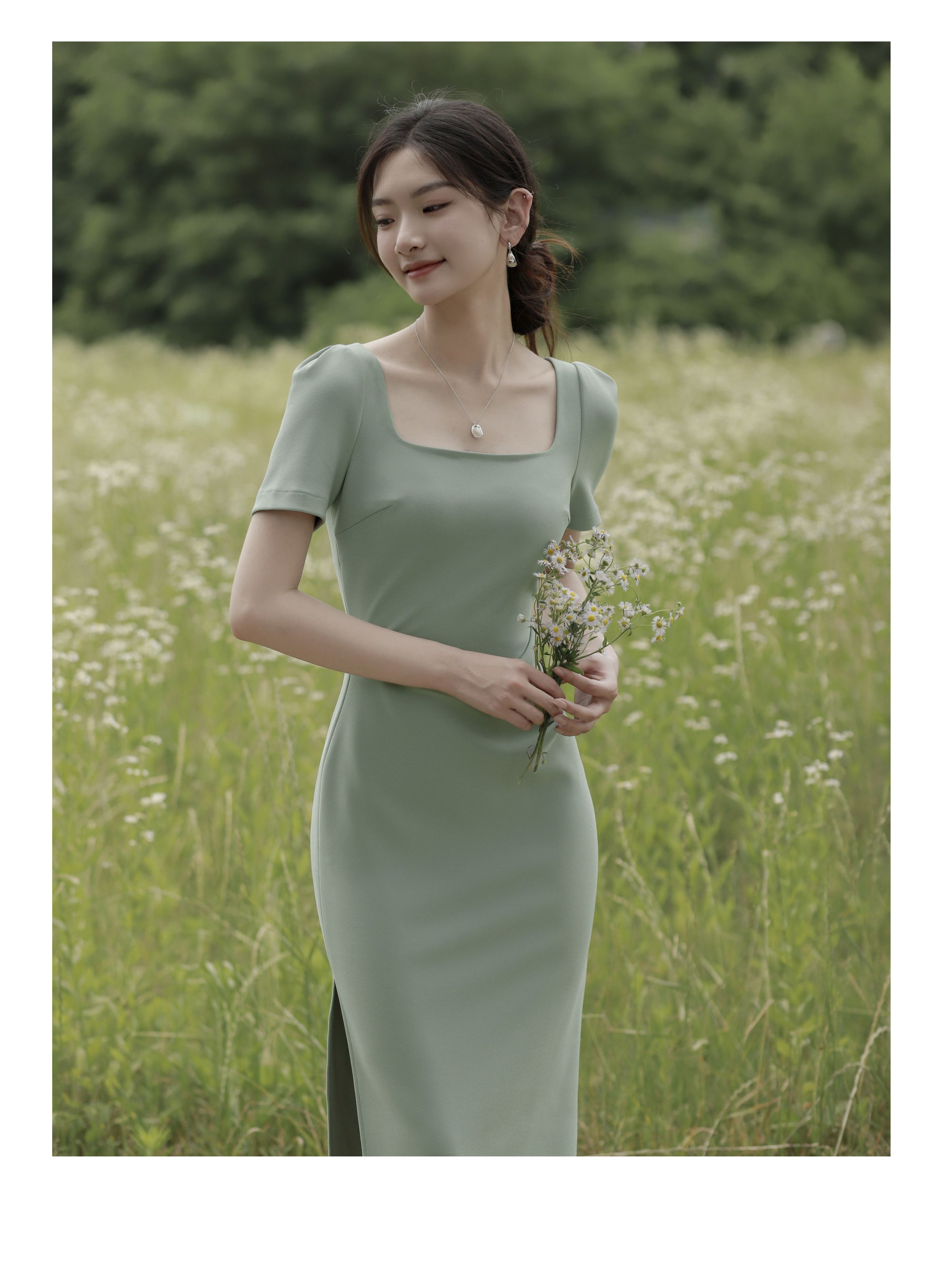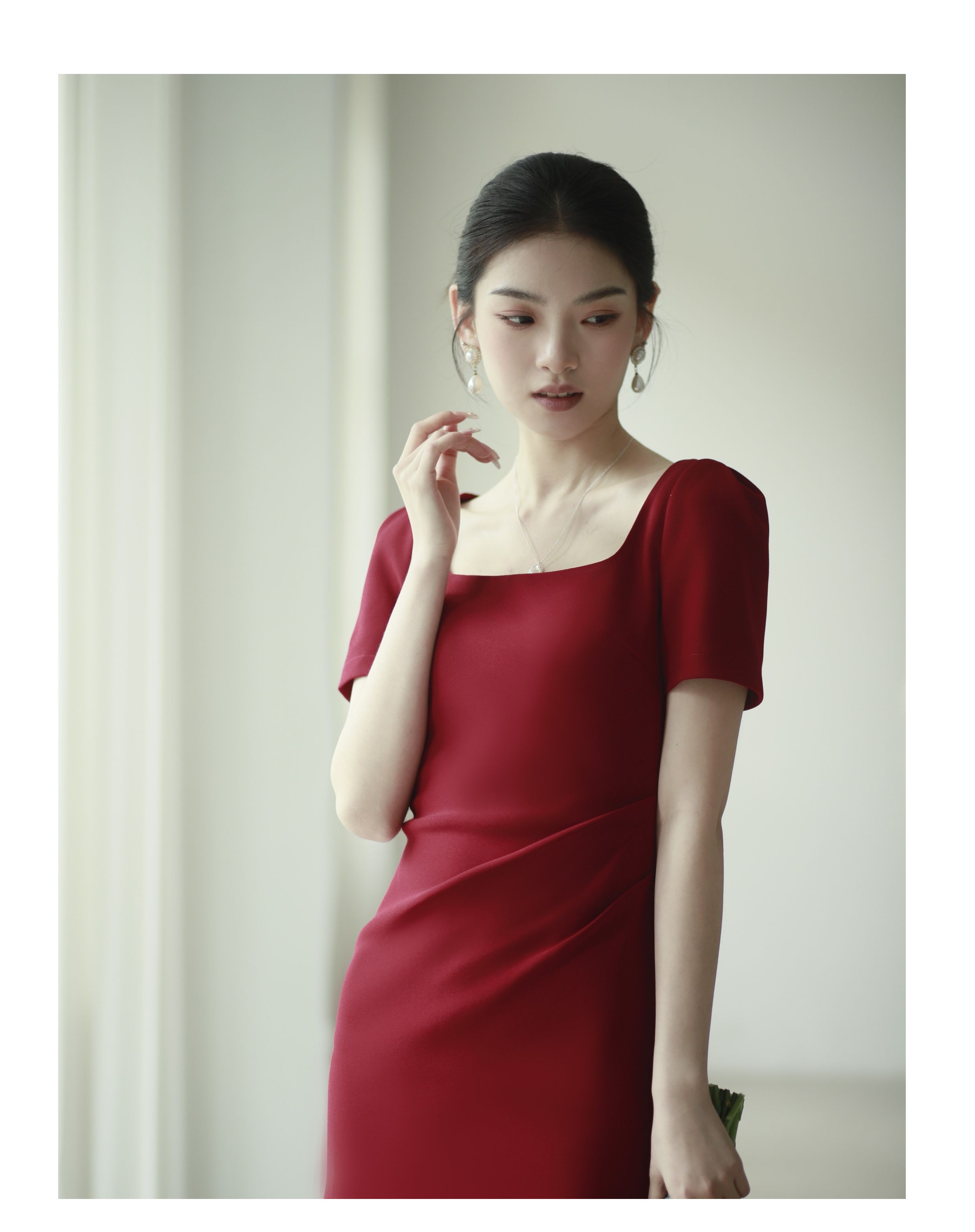 白月|拜托鹿先生法式方領短袖修身彈力長款領証訂婚小禮服連衣裙