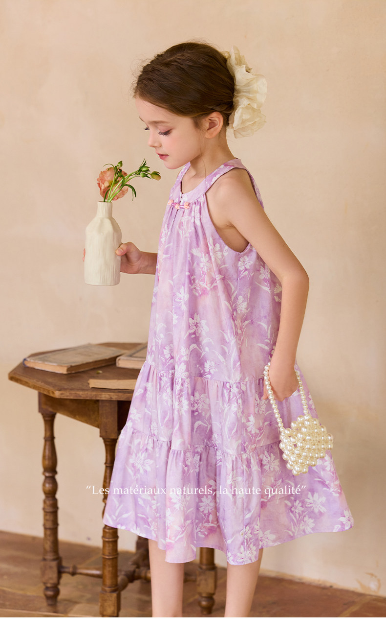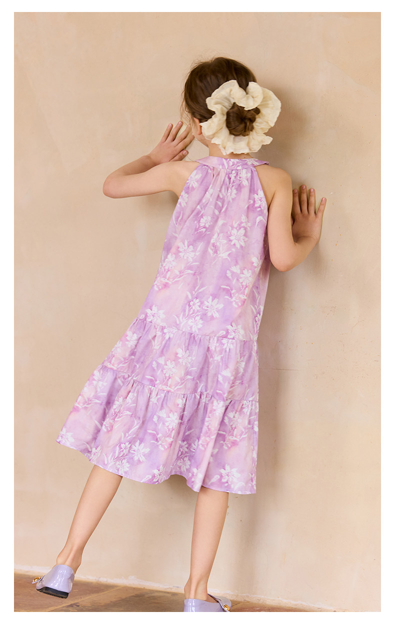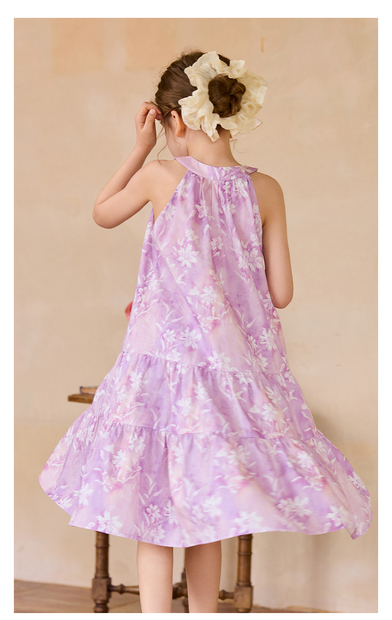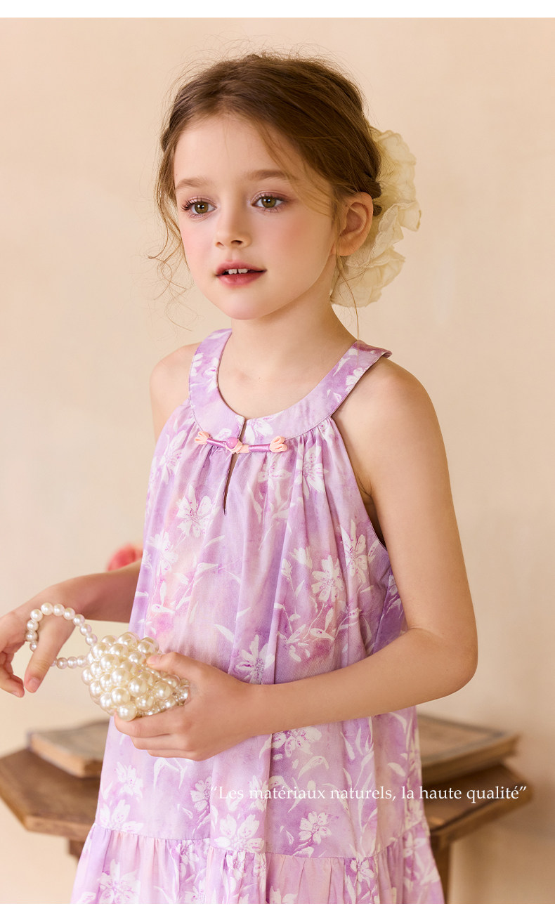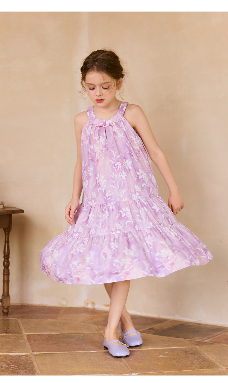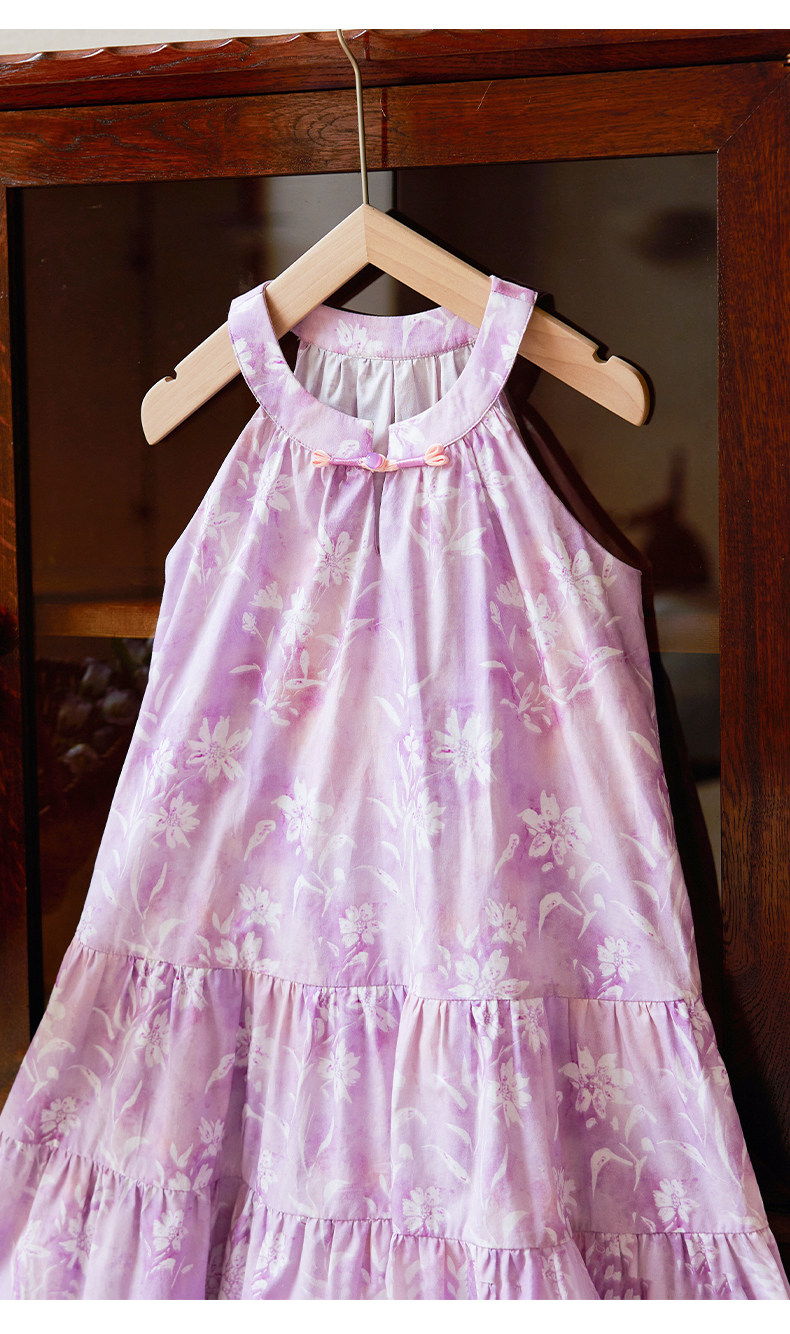 Little Naive女童新中式連衣裙春夏新款旗袍領掛脖裙子兒童碎花裙