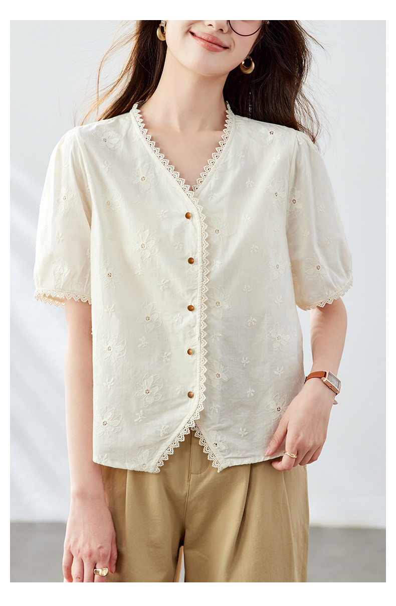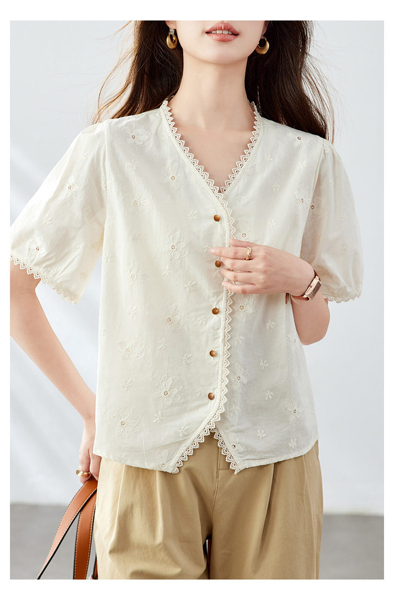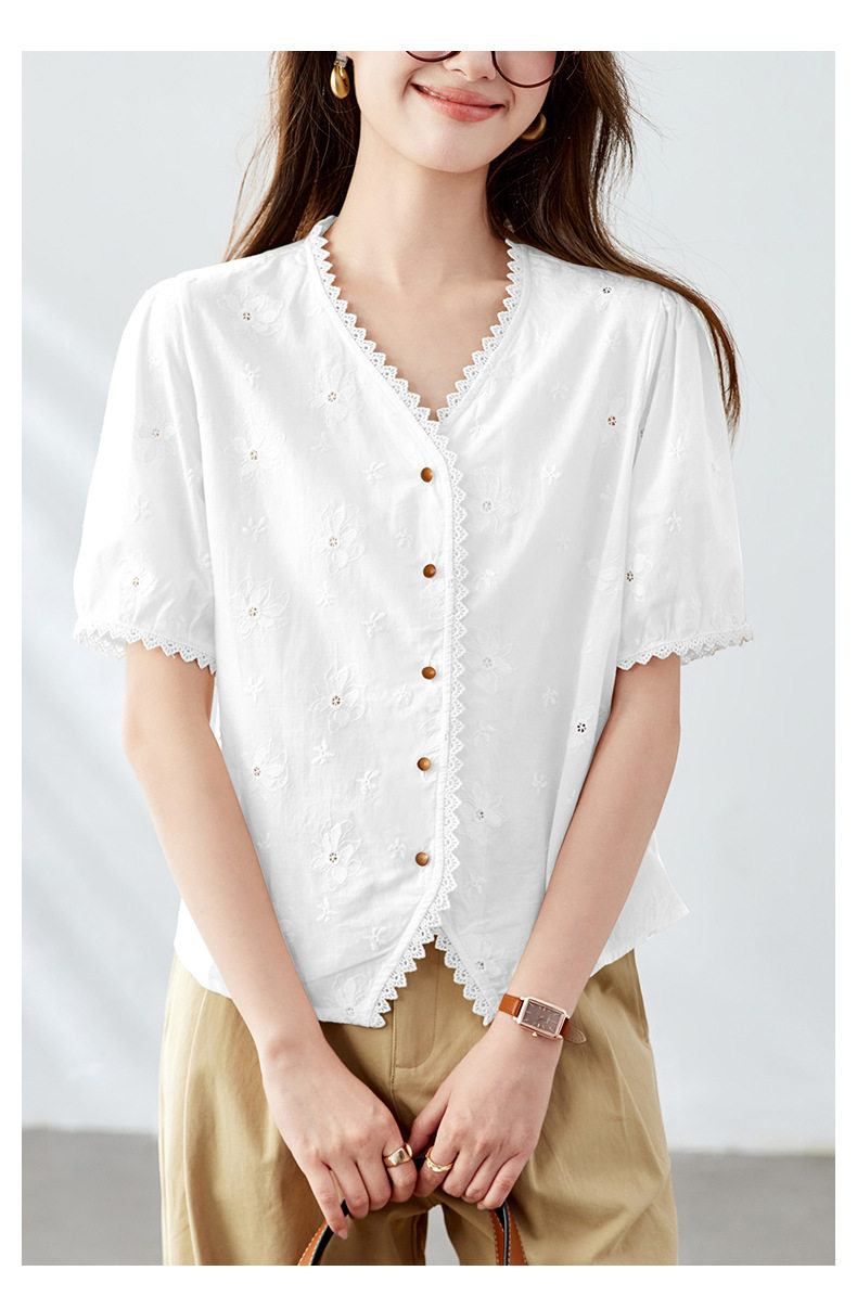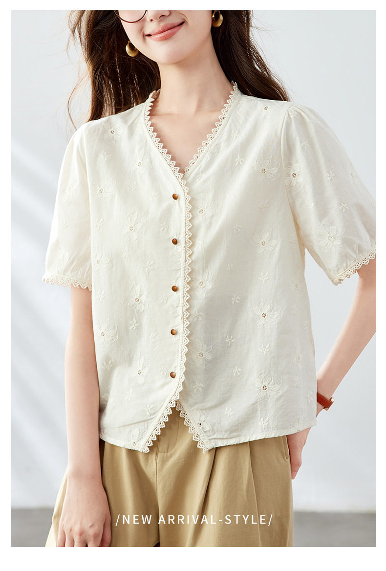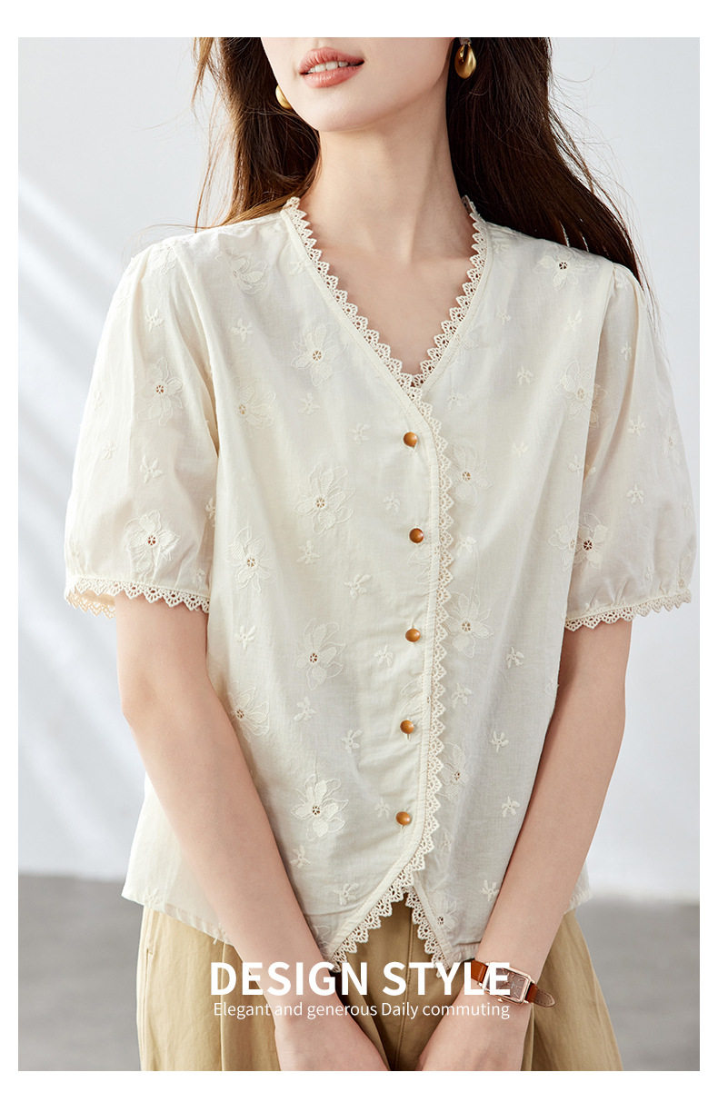 2026夏純棉小個子短款襯衫女短袖上衣花邊V領設計感洋氣減齡襯衣