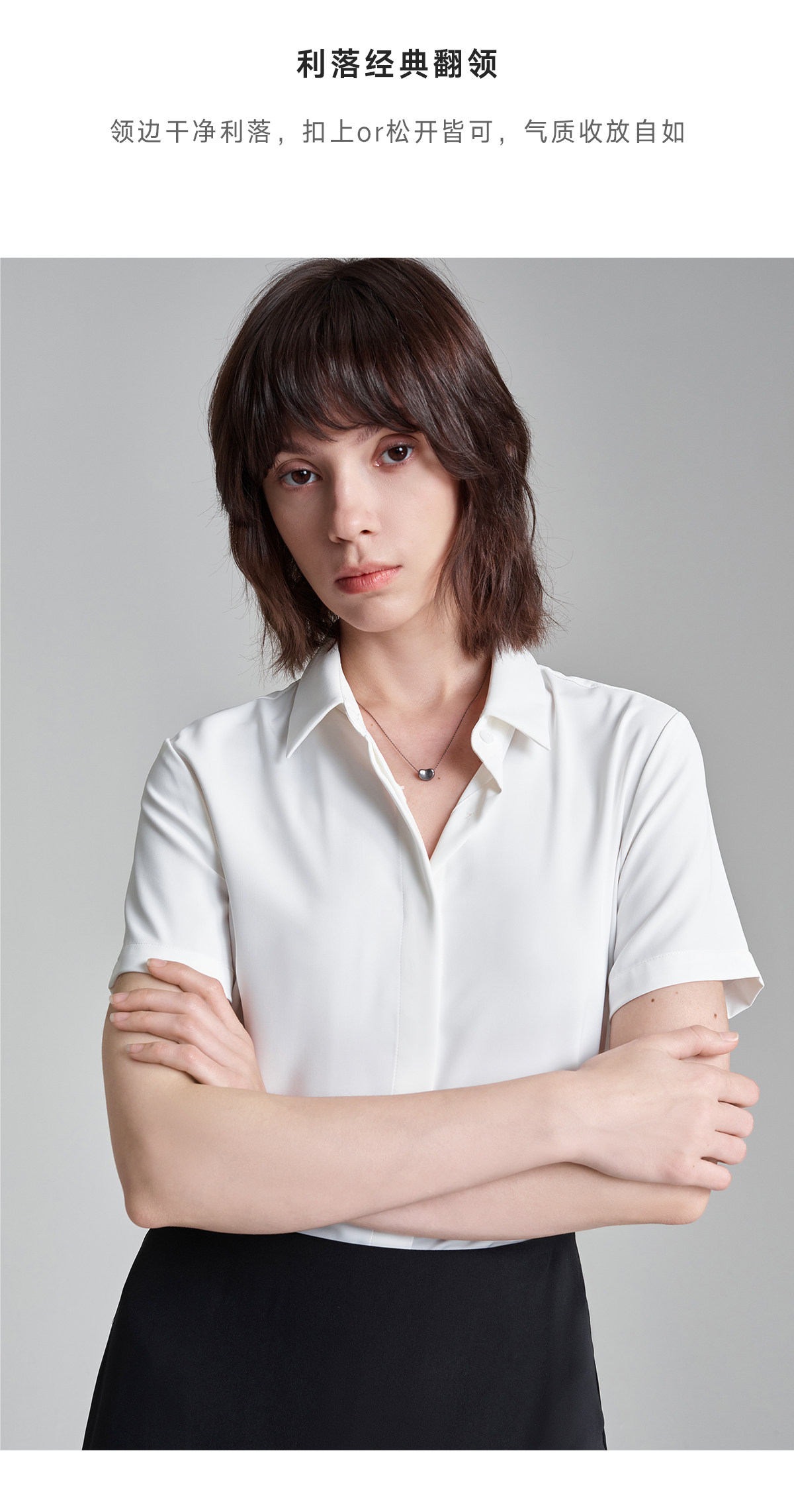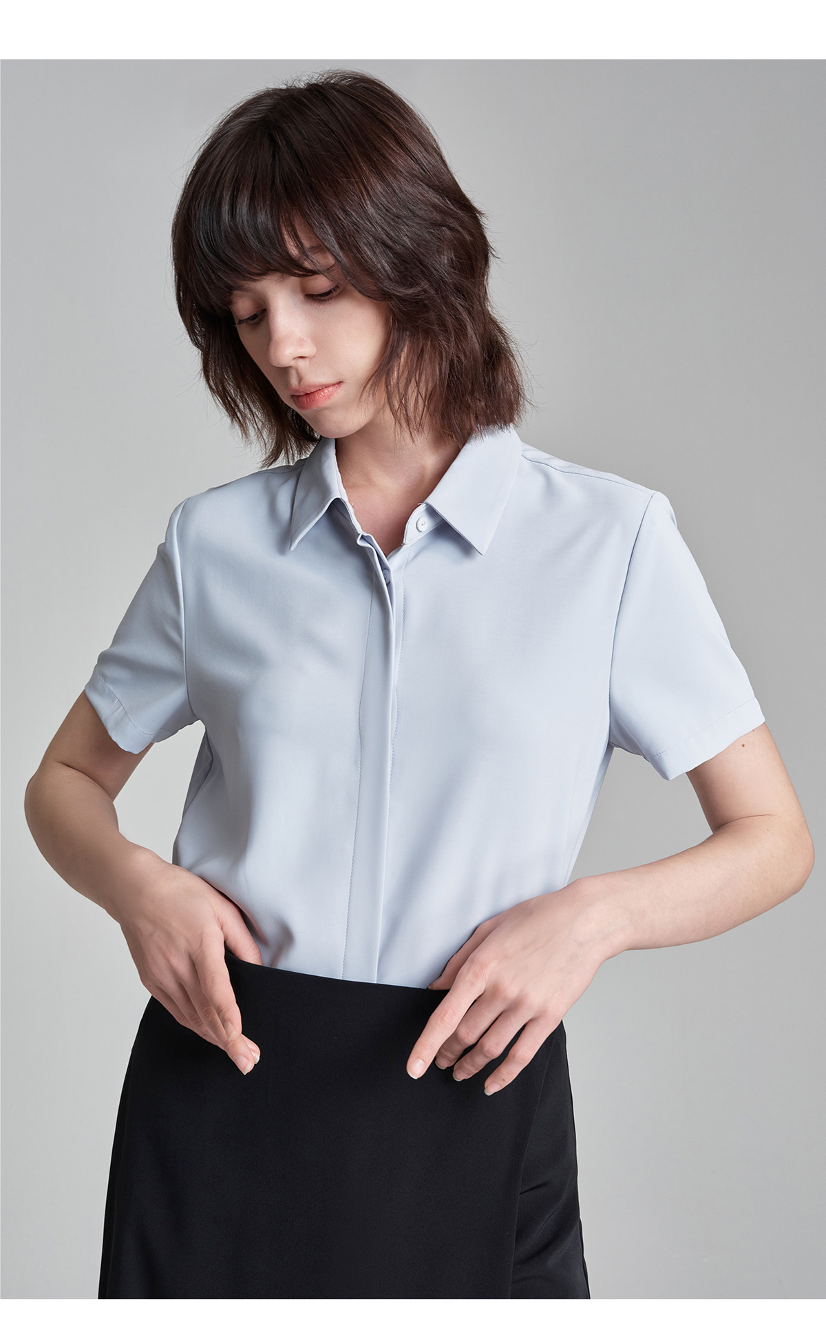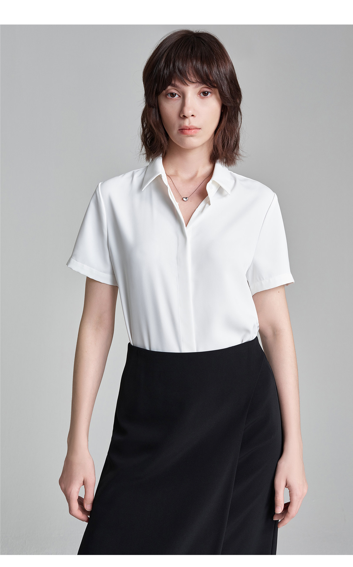 萊倫斯布白色暗門襟緞面短袖襯衫女秋修身顯瘦OL職業面試襯衣套裙
