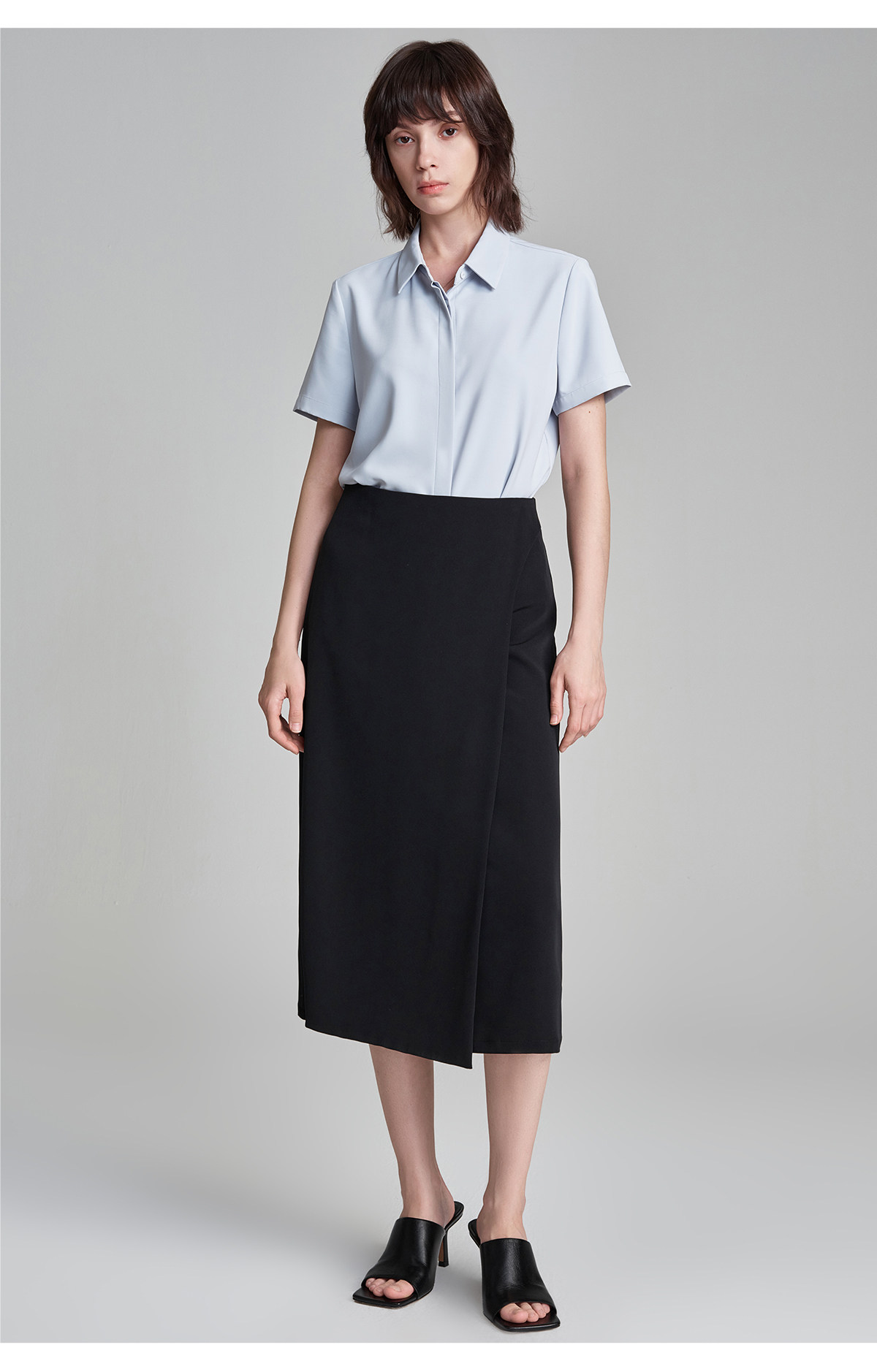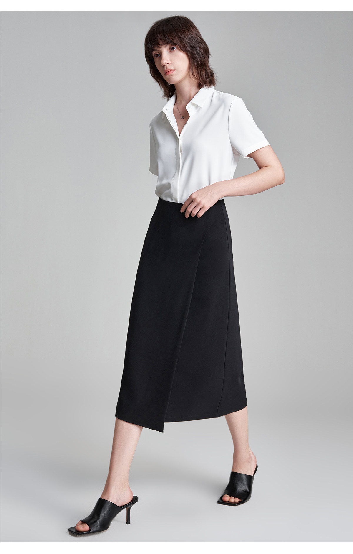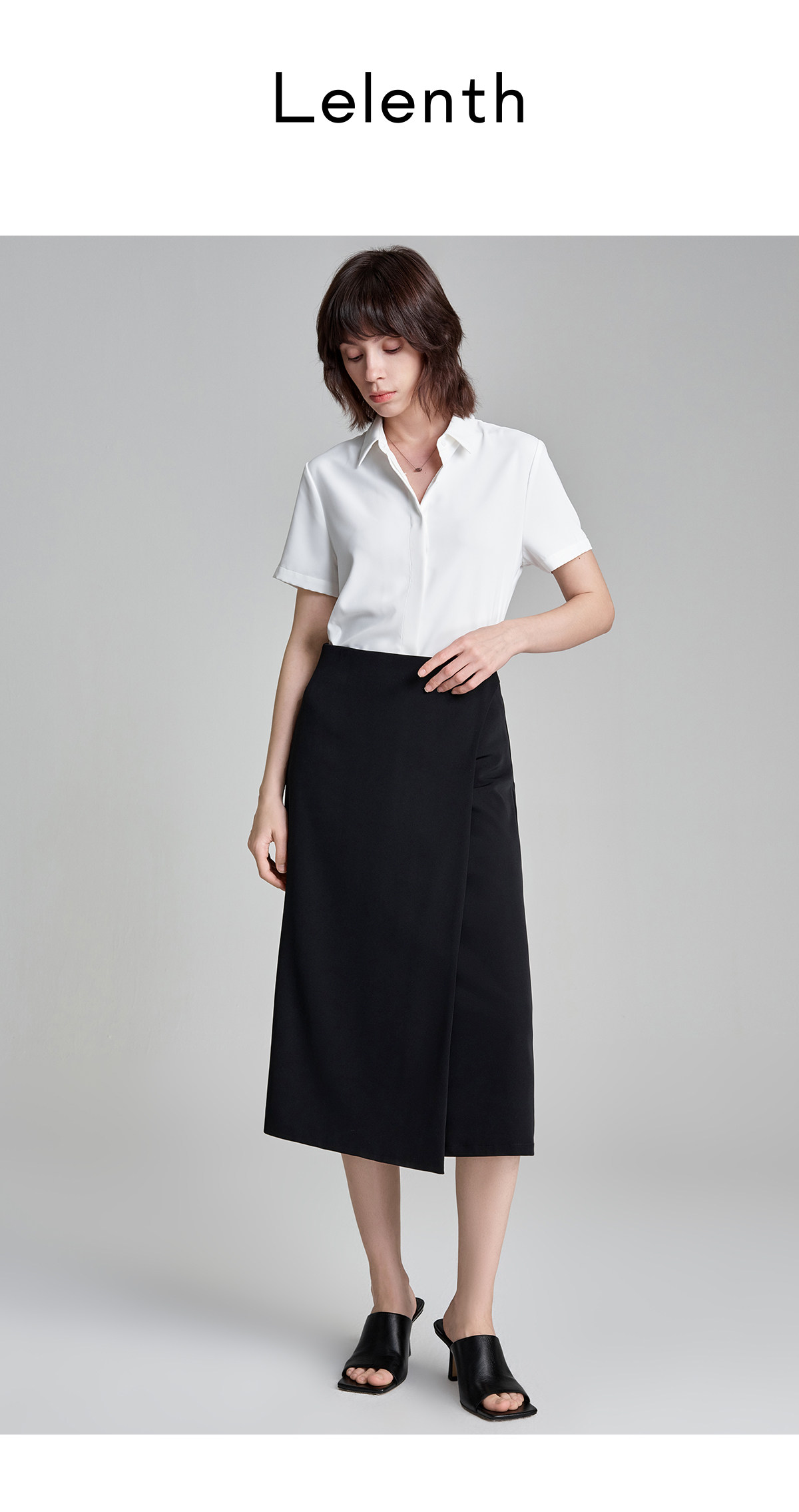 萊倫斯布白色暗門襟緞面短袖襯衫女秋修身顯瘦OL職業面試襯衣套裙