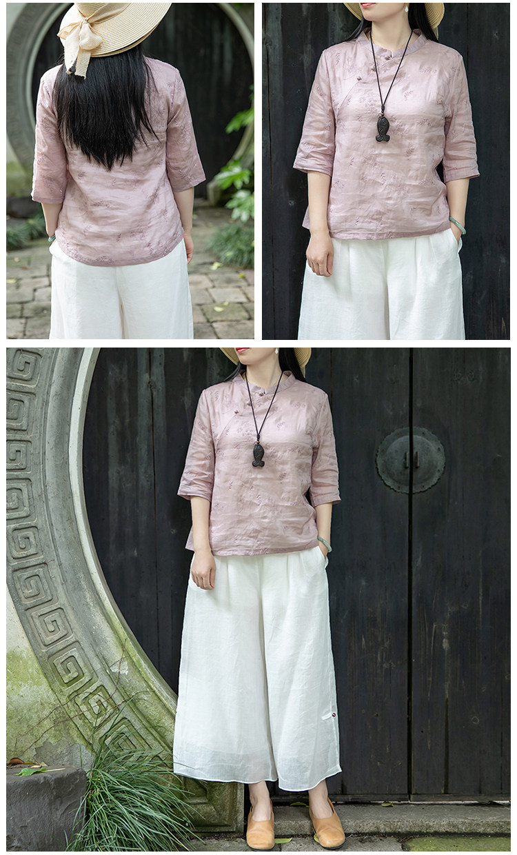 唸江南新中式改良立領斜襟苧麻刺綉襯衫小衆設計感女中袖氣質上衣