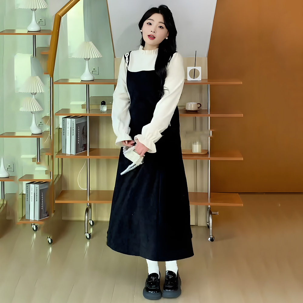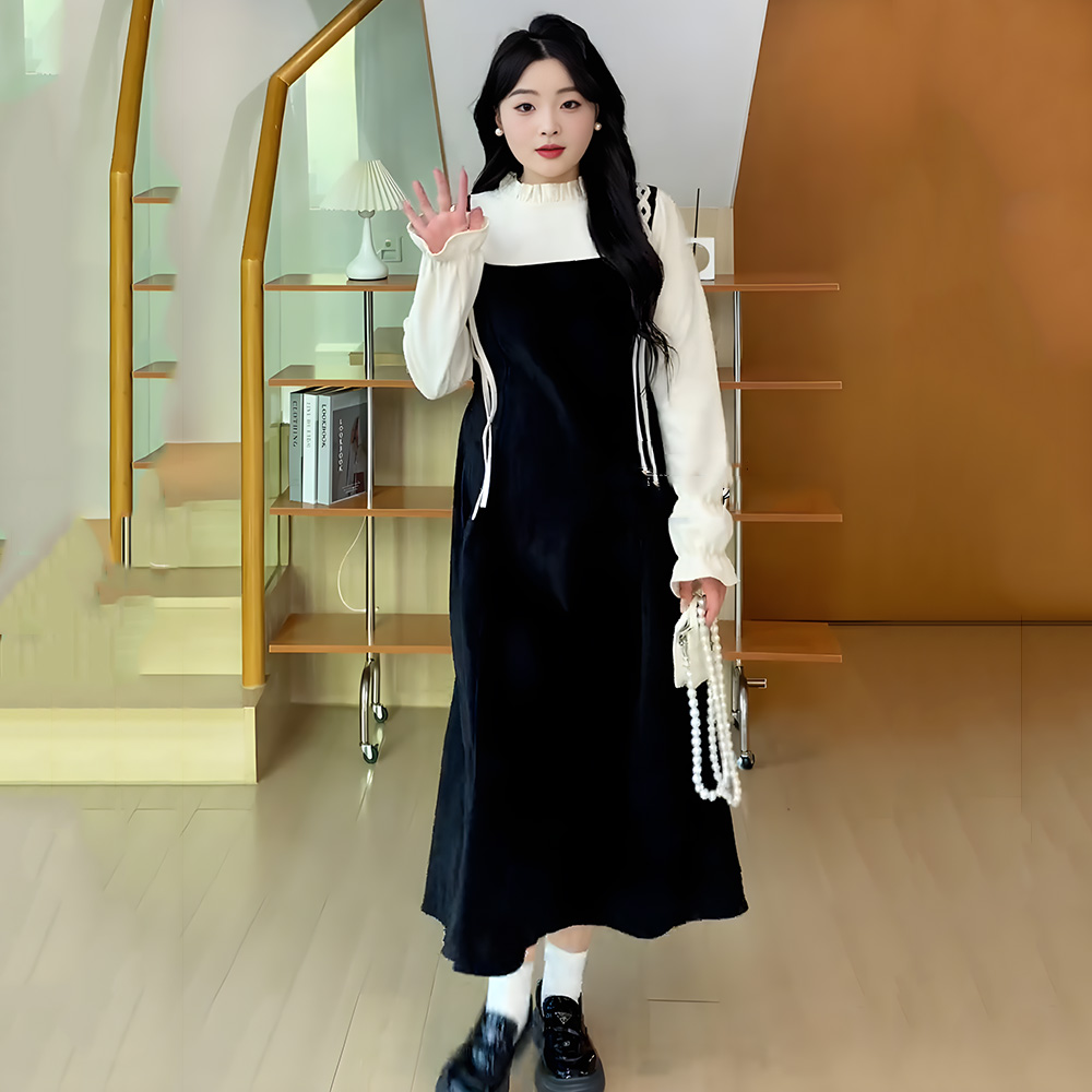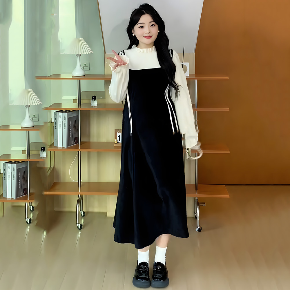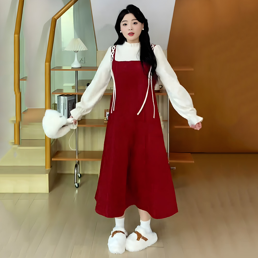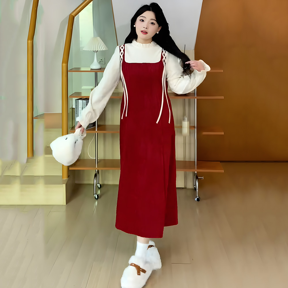大碼新年聖誕紅色假兩件連衣裙女秋冬胖mm收腰遮胯顯瘦內搭小裙子