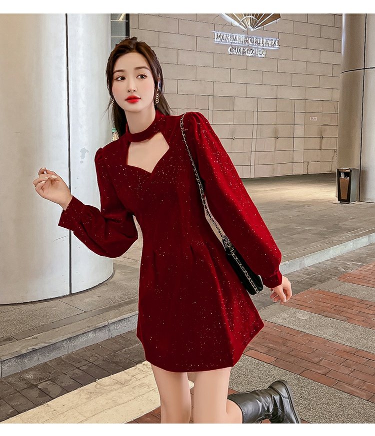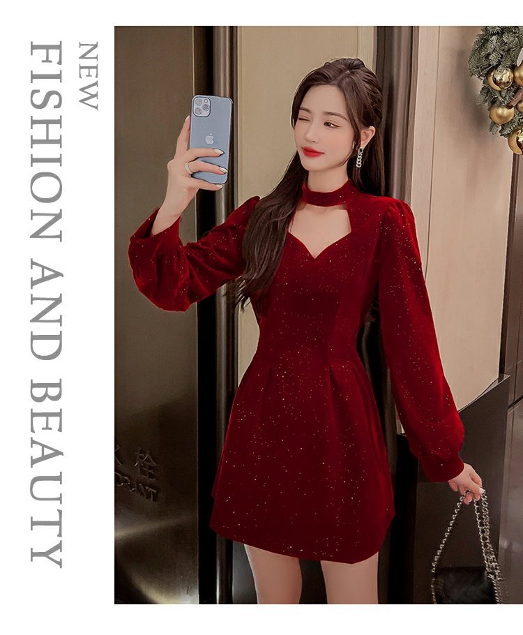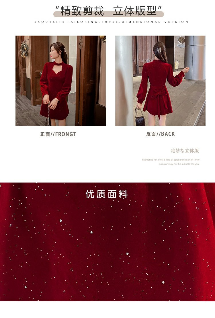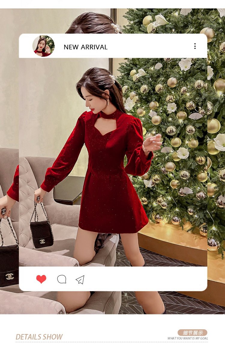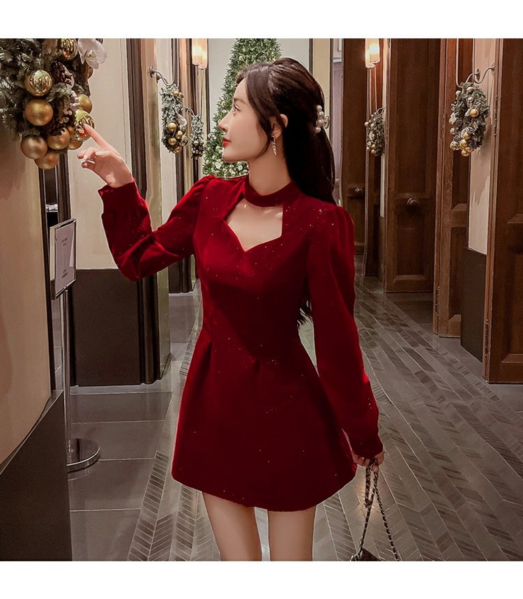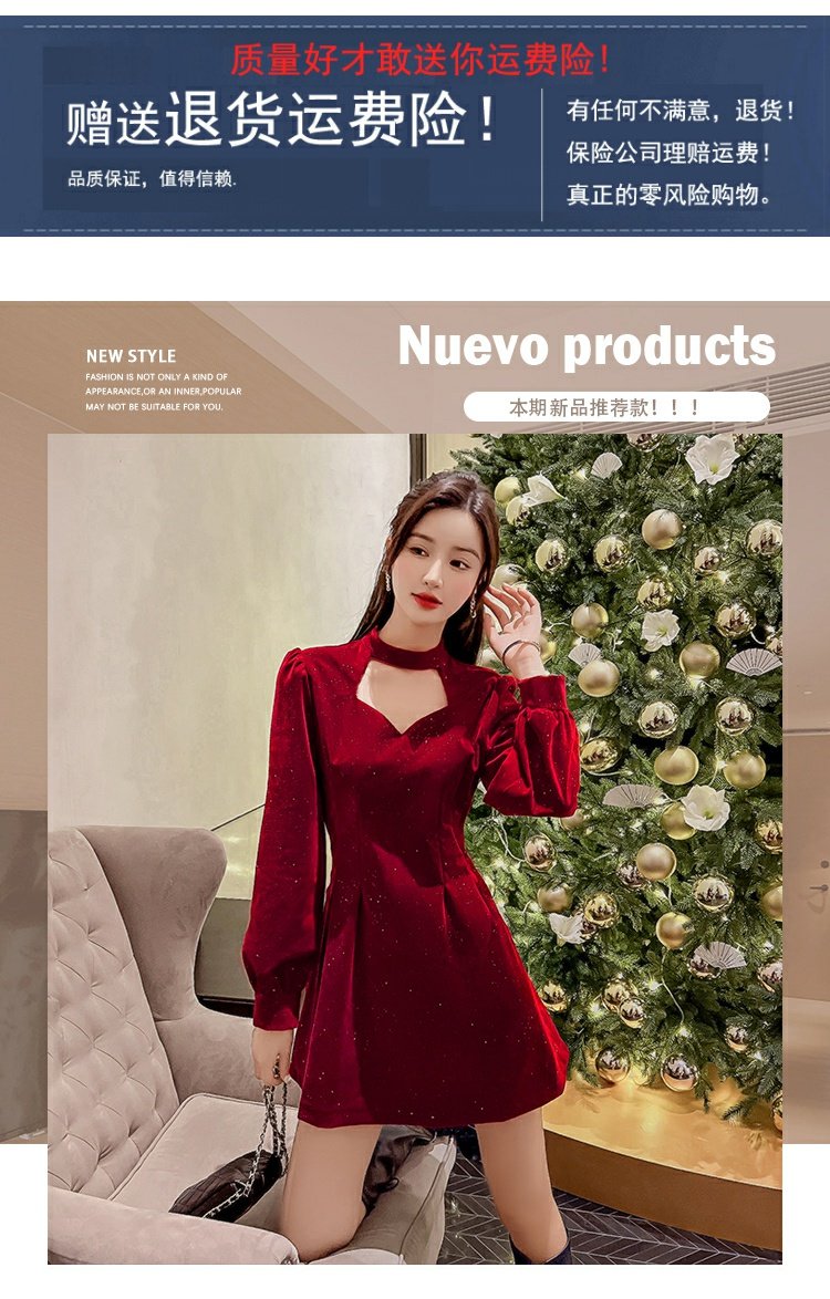 聖誕紅年會連衣裙女秋冬赫本風名媛氣質高級感小個子法式收腰裙子