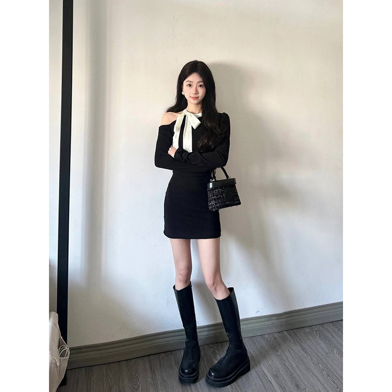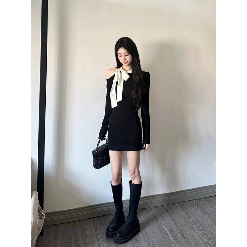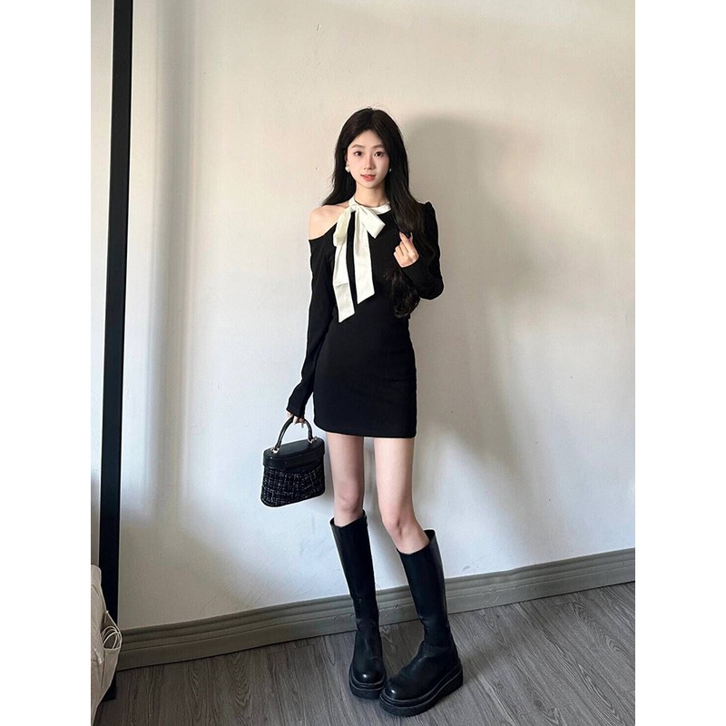 法式純欲蝴蝶結黑色針織連衣裙子女修身氣質露肩包臀a字短裙秋季