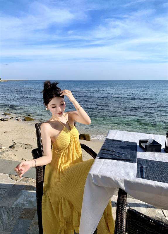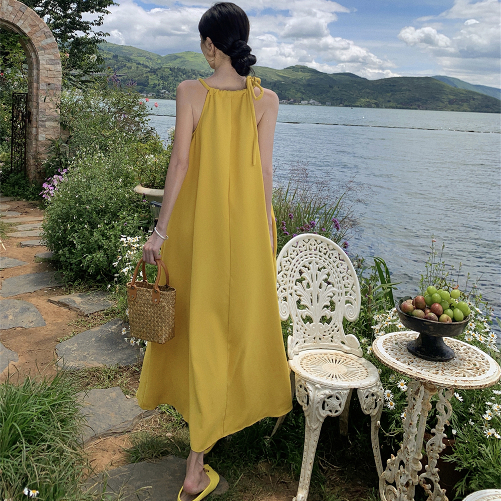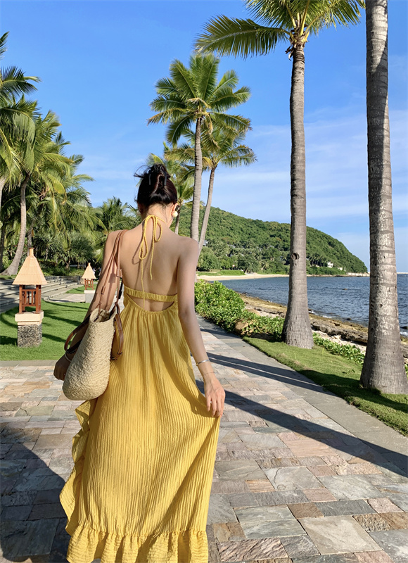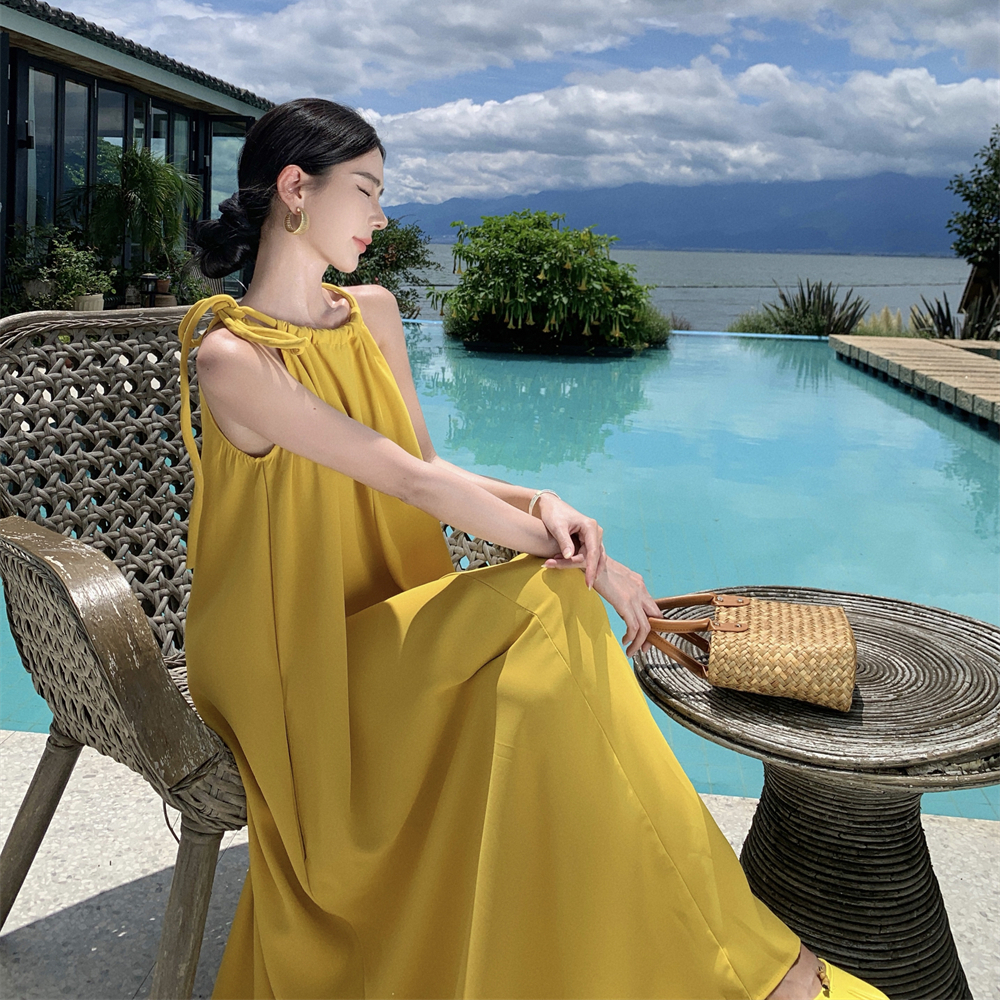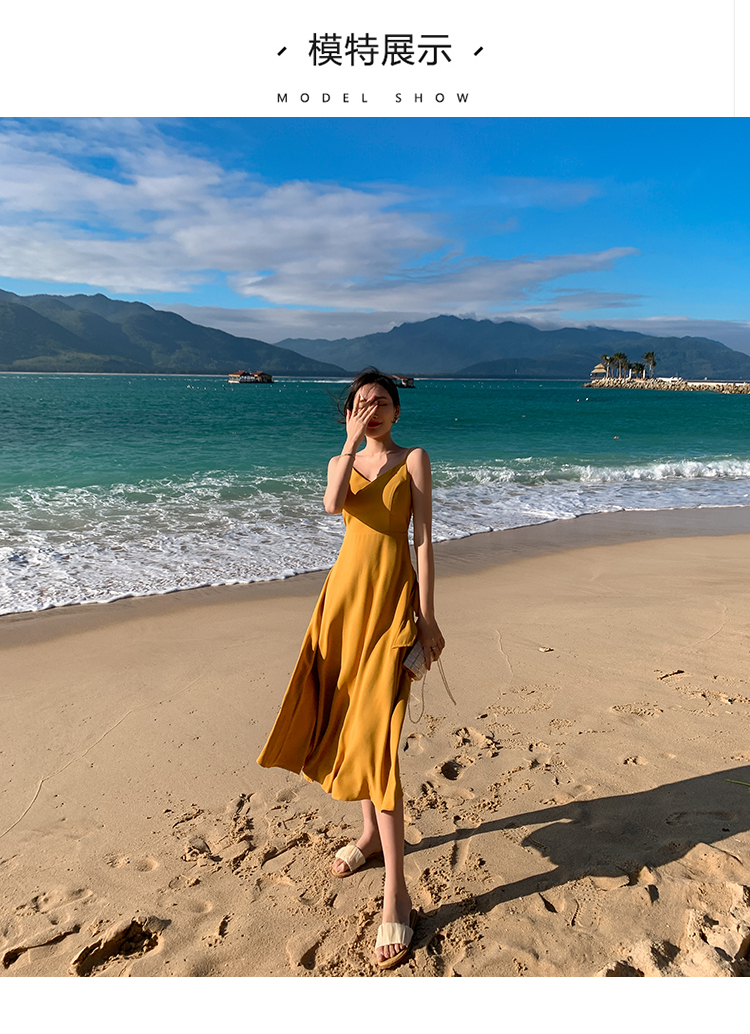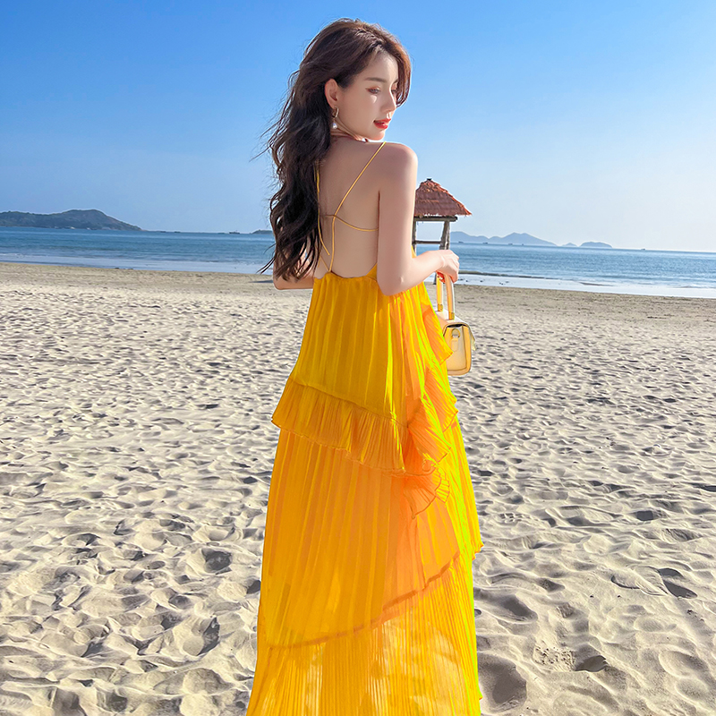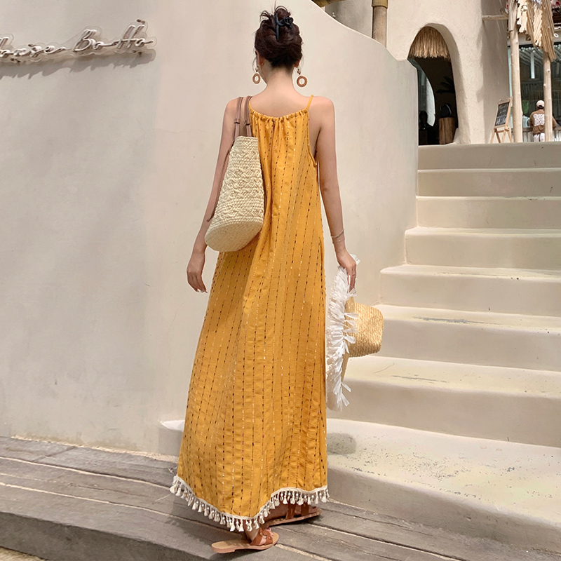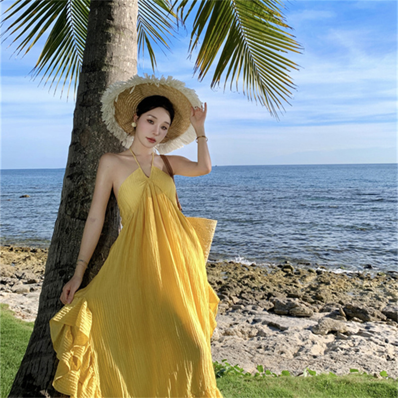 夏季新款巴厘島海邊度假黃色沙灘裙女復古顯瘦韓版連衣裙超仙長裙