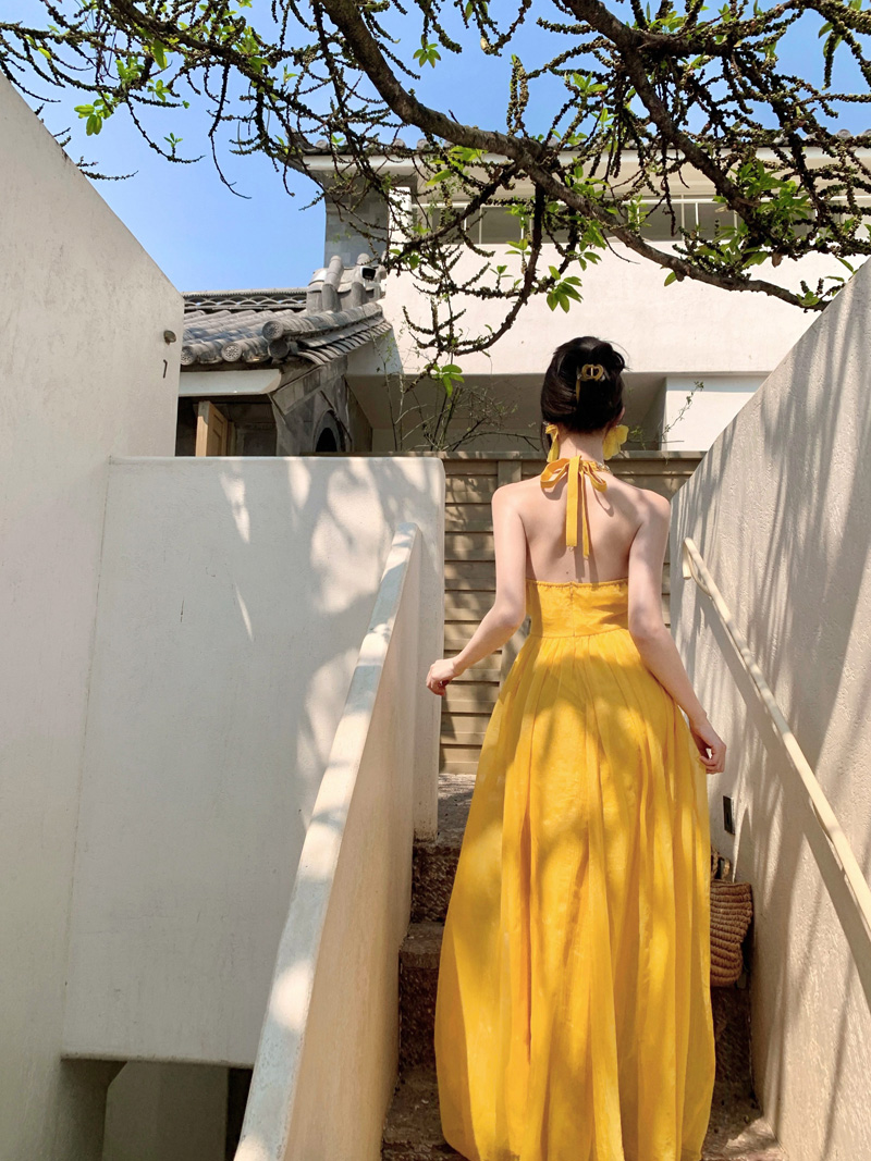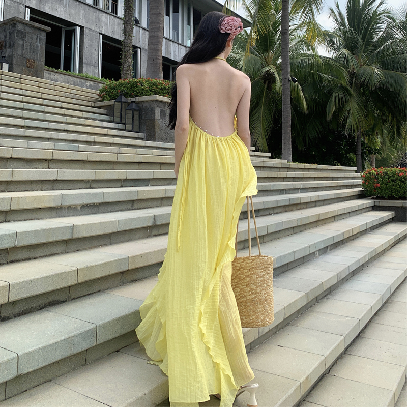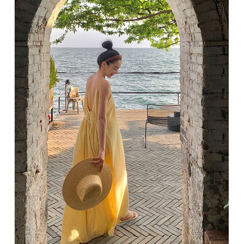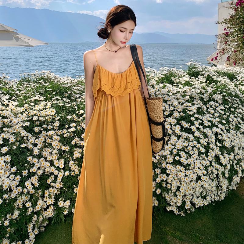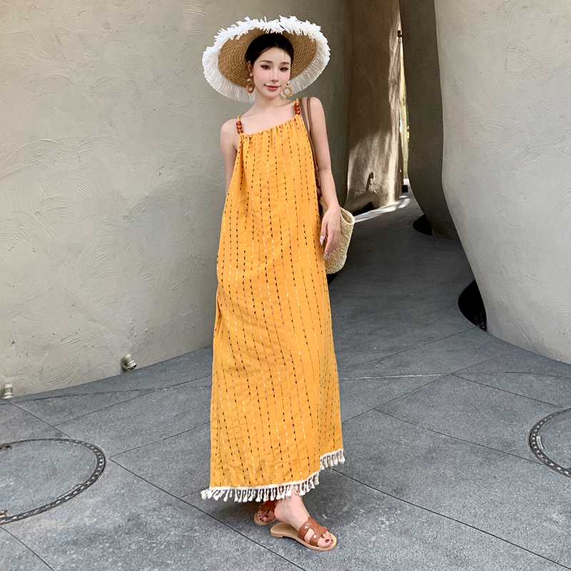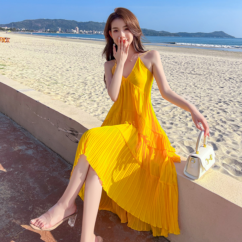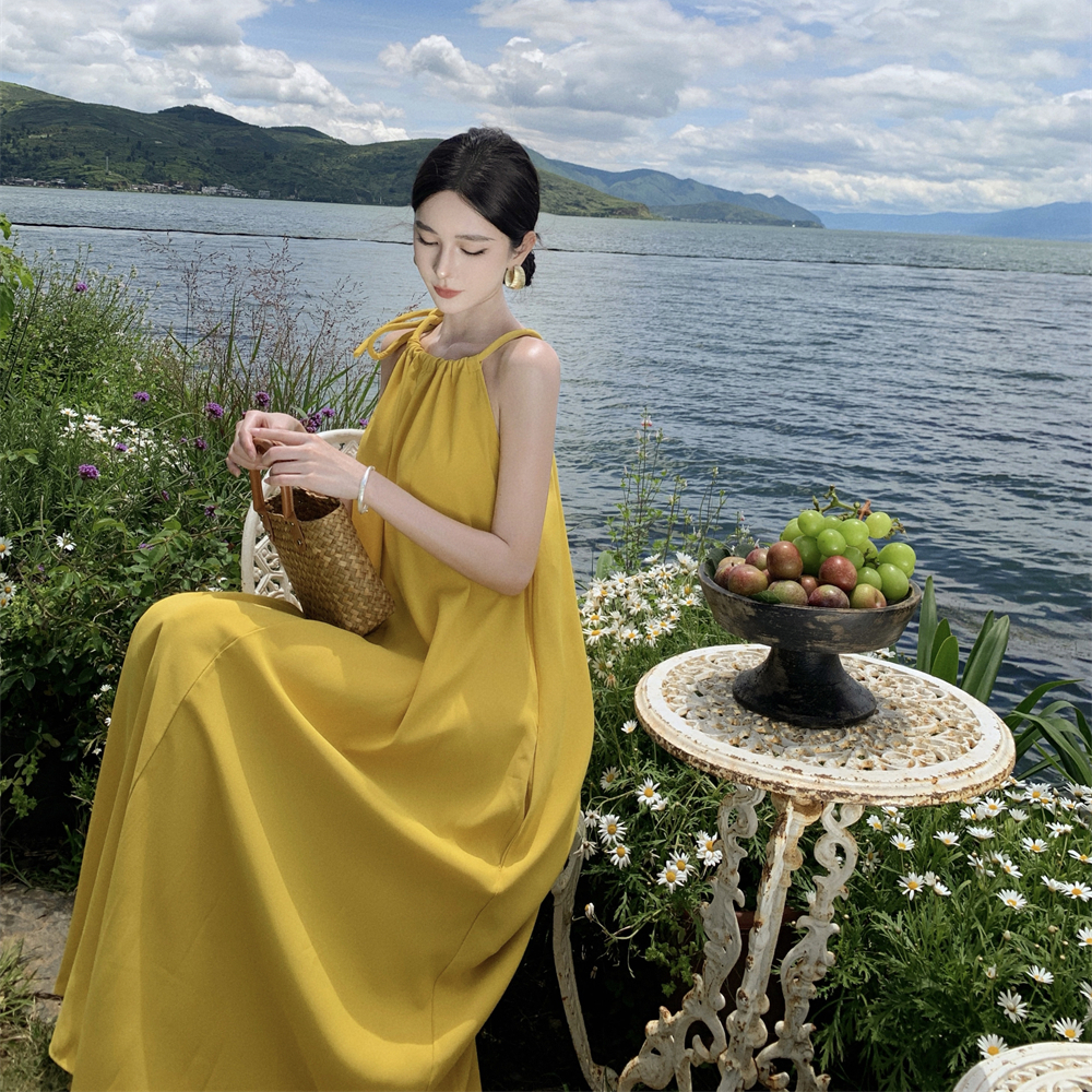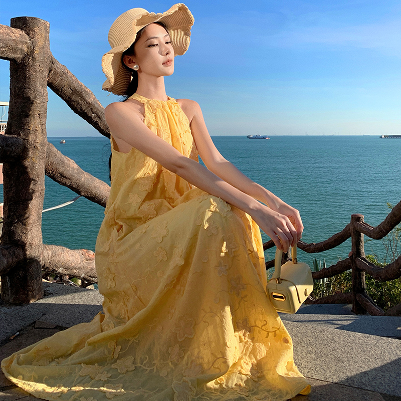 夏季新款巴厘島海邊度假黃色沙灘裙女復古顯瘦韓版連衣裙超仙長裙